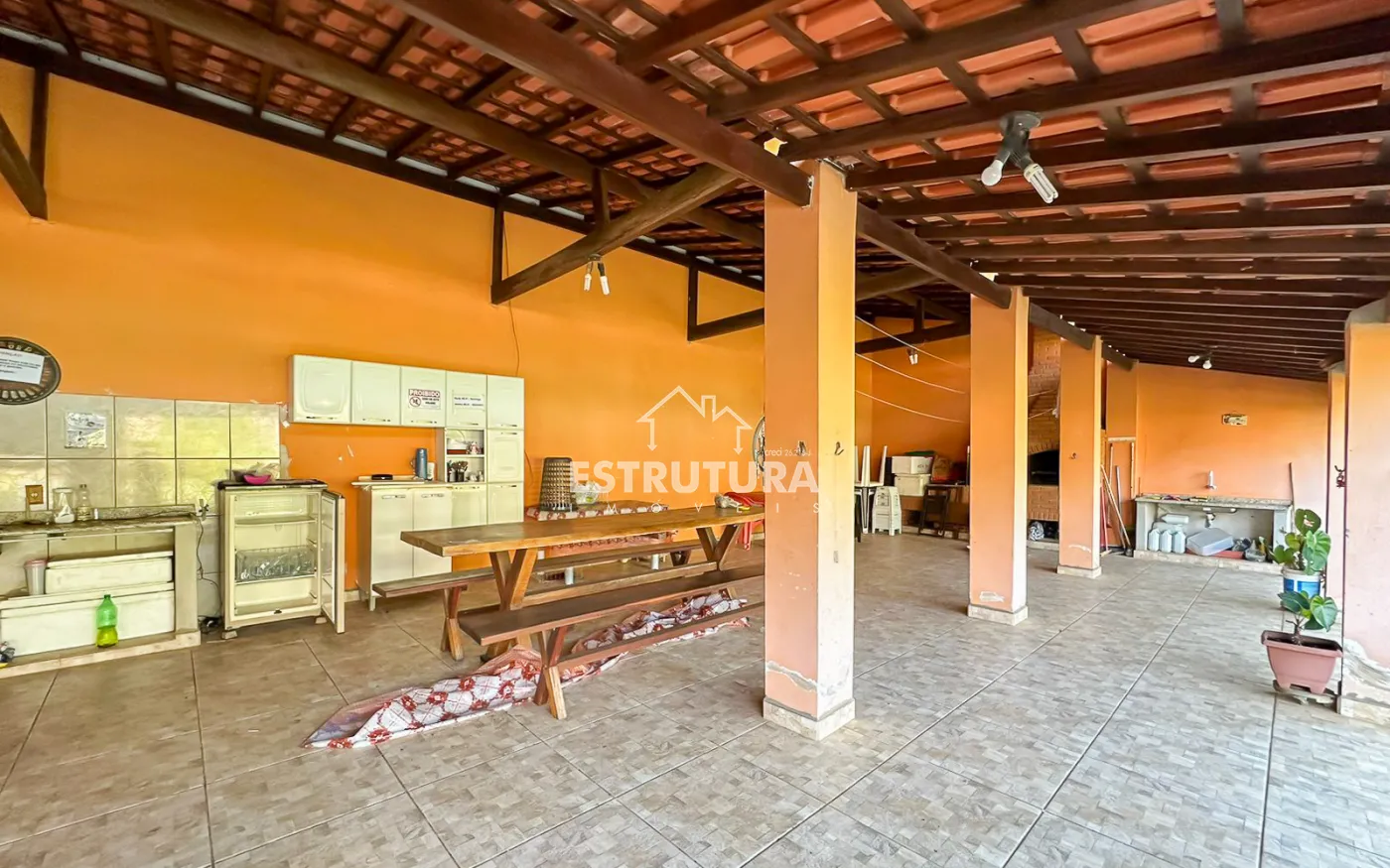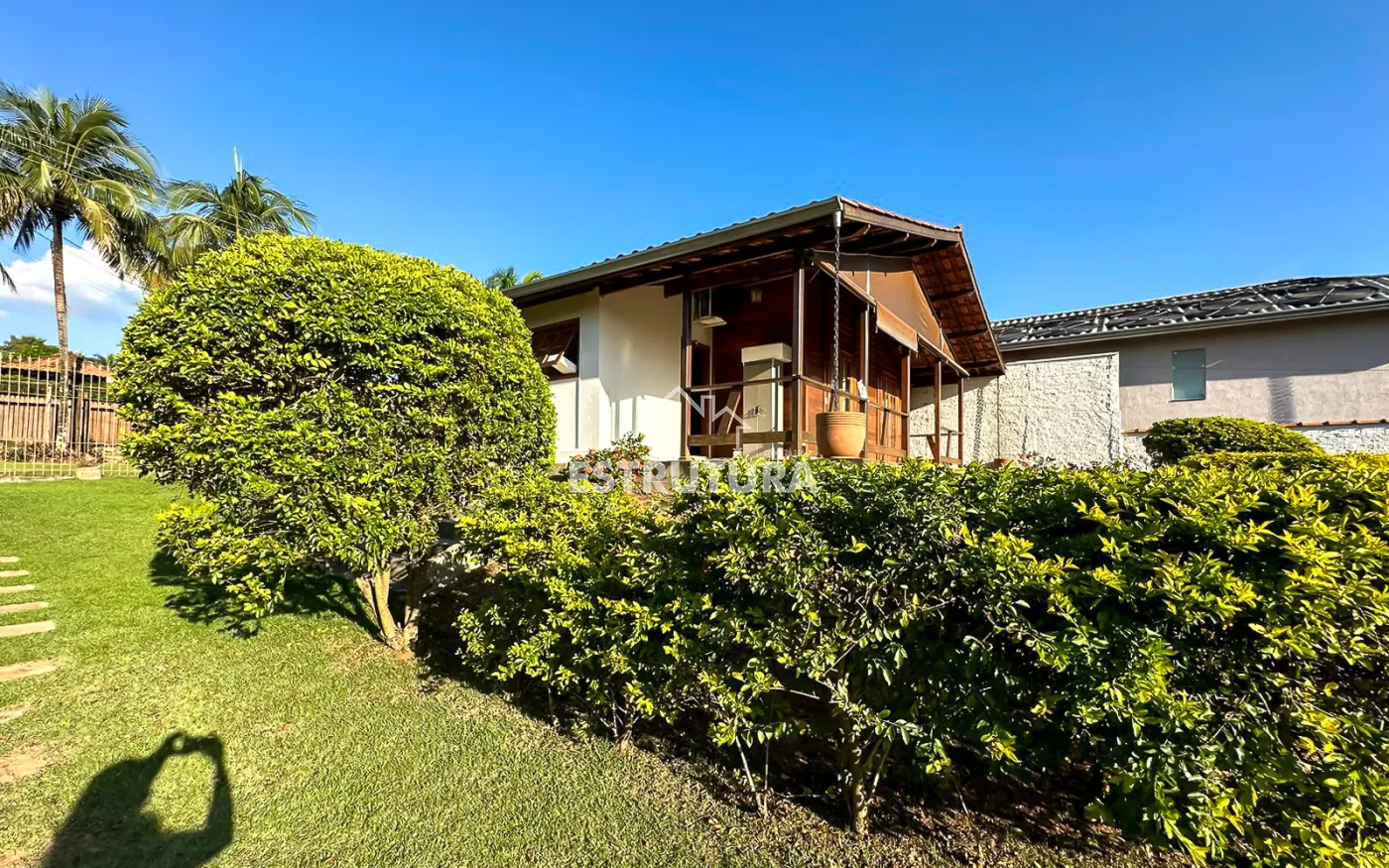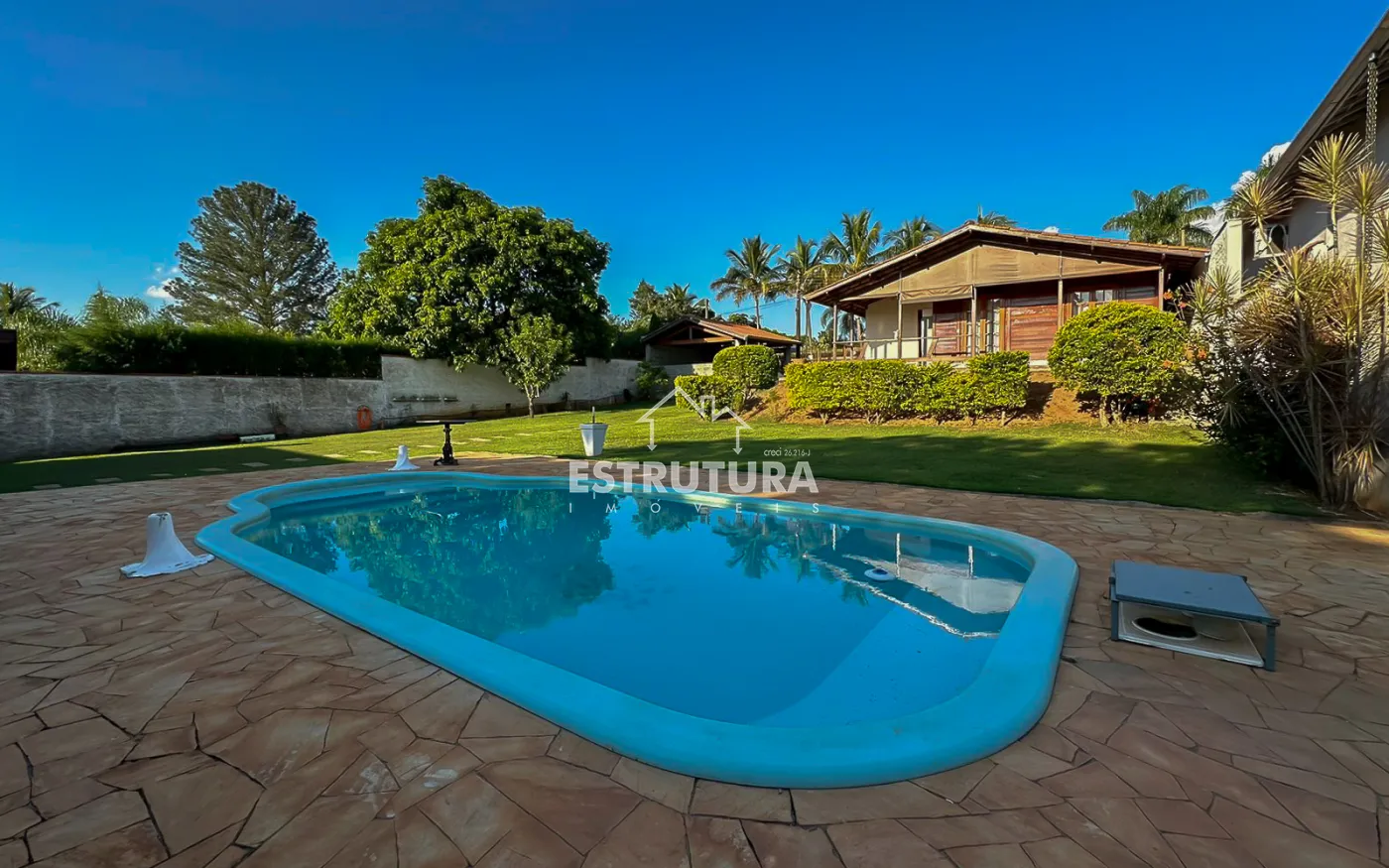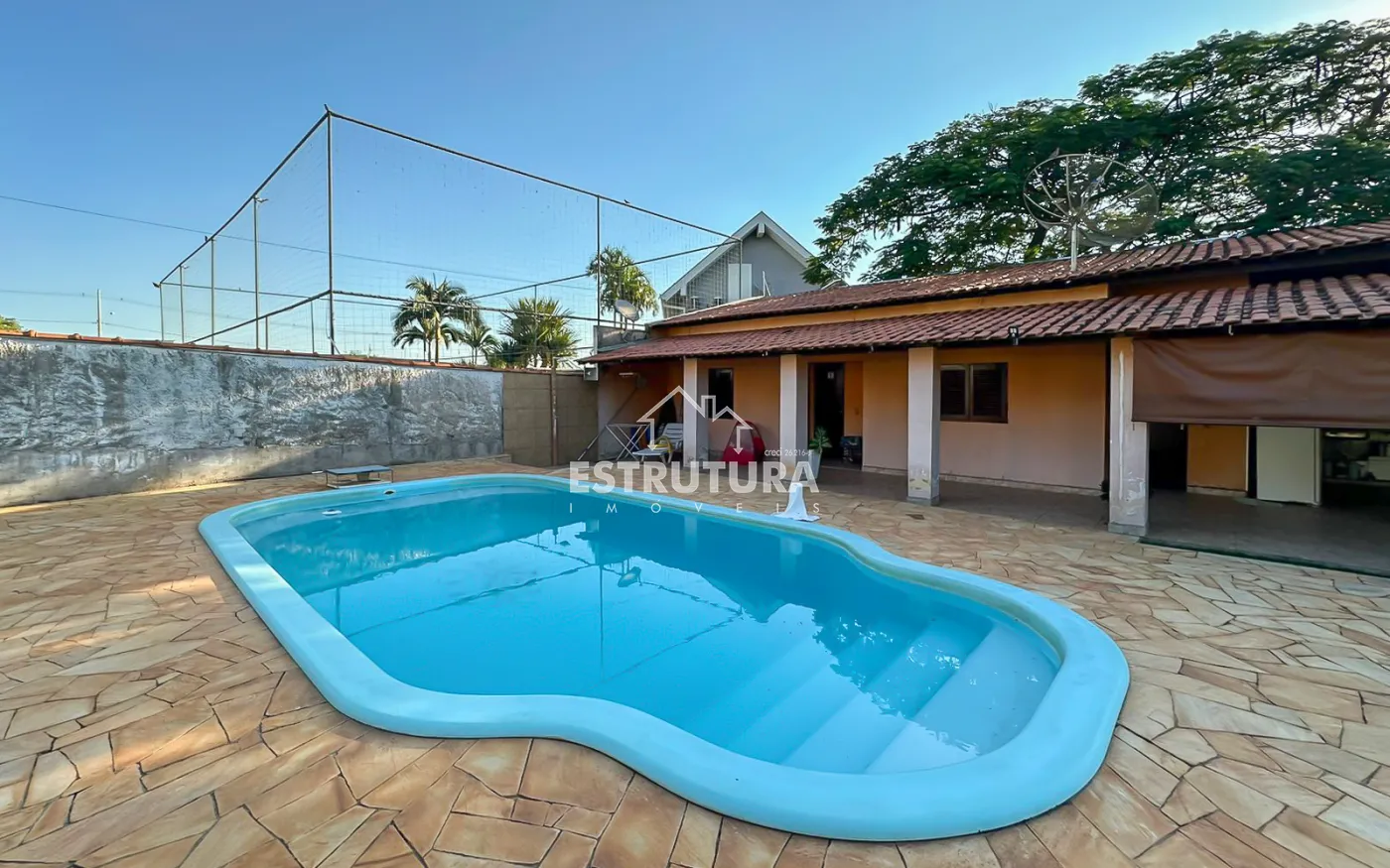 São 2 casas dentro da chácara, Casa na parte de baixo com 2 quartos, 2 banheiros, cozinha e lavanderia, garagem coberta com portão eletrônico para dois carros e na parte de cima tem mais uma casa com sala, cozinha, dois banheiros, 2 dormitórios e uma ampla área de lazer com piscina.
