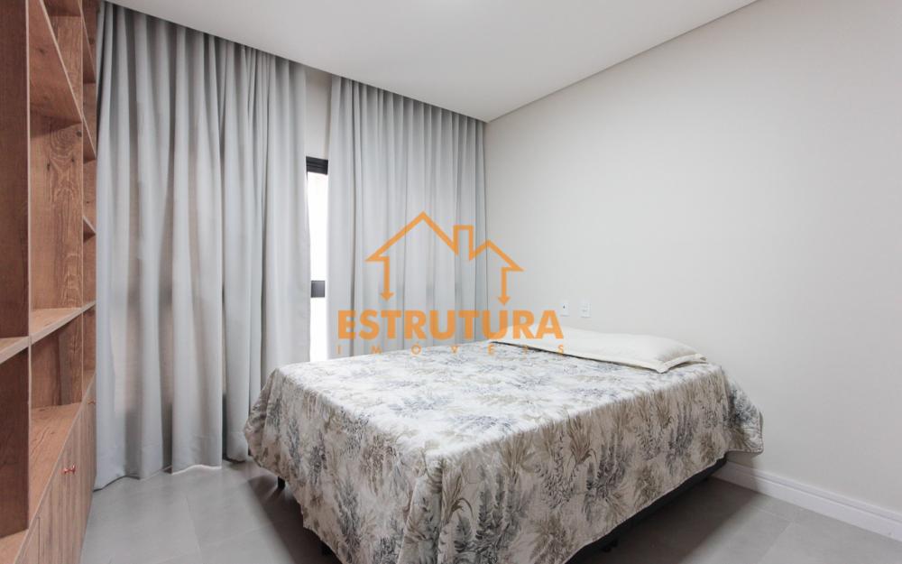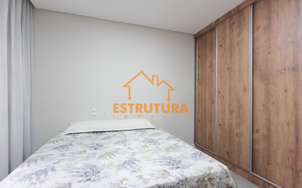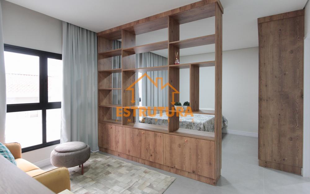 Possui cozinha planejada com cooktop elétrico, geladeira e mesa, 1 W.C social, espaço para sala com sofá e painel e dormitório com cama e guarda-roupa planejado, ar-condicionado e 2 vagas de garagem.