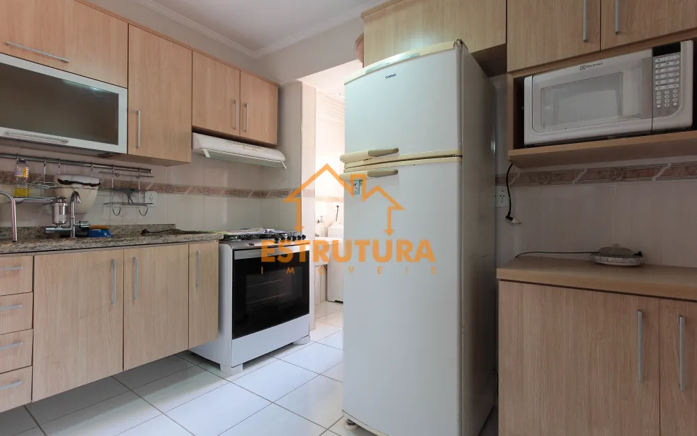 Este apartamento está completamente mobiliado, com uma sala de estar de dois ambientes e uma sacada. Possui uma cozinha equipada, uma área de serviço, e três quartos, sendo um deles uma suíte com armários planejados. Além disso, há duas vagas de garagem disponíveis.