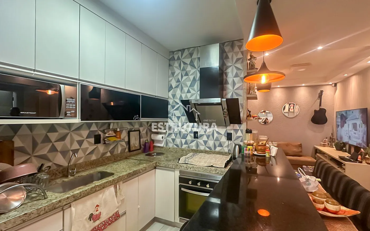 Apartamento com piso de porcelanato, totalmente climatizado com ar condicionado nos dormitórios e na sala. Cozinha integrada completa, com armários planejados, e área de serviço. Possui 2 dormitórios, 1 banheiro social com box blindex e gabinete. A sala de estar é decorada com um painel planejado que se estende até uma porta de correr, proporcionando privacidade aos cômodos íntimos. Além disso, tem varanda com churrasqueira e 1 vaga de garagem coberta. O condomínio também oferece academia, salão de festas, playground, terraço, sala de jogos e portaria digital 24 horas.