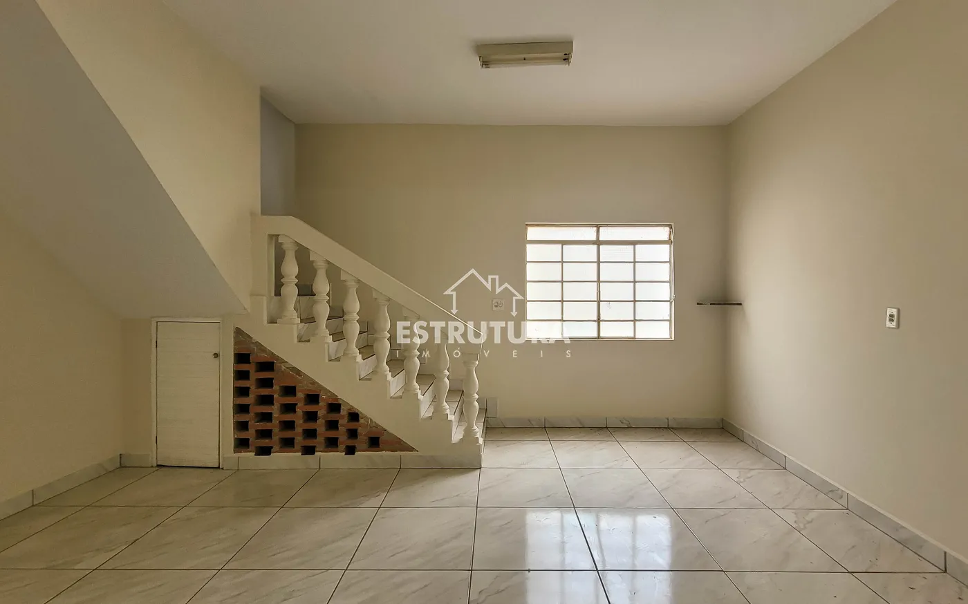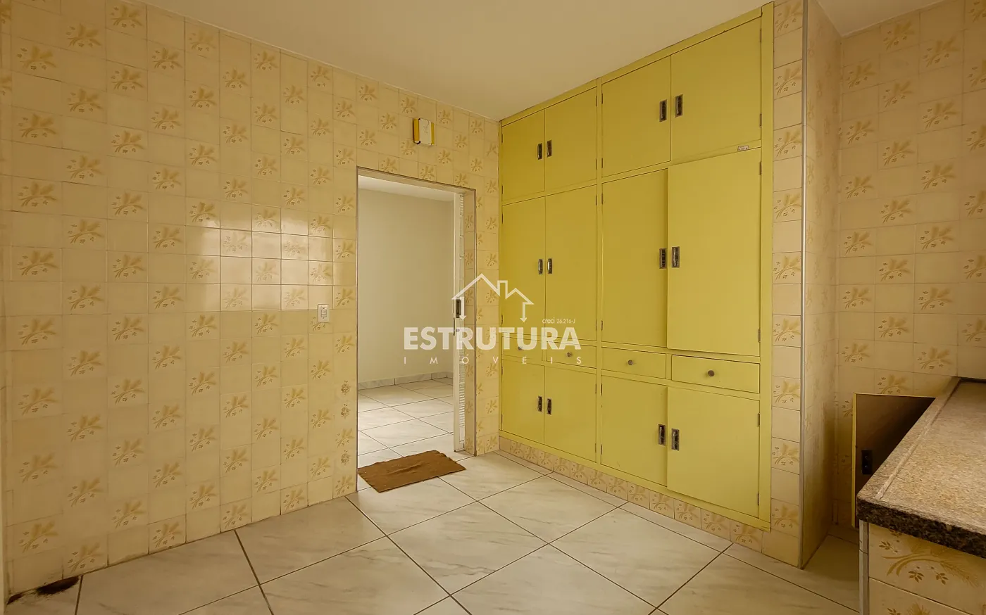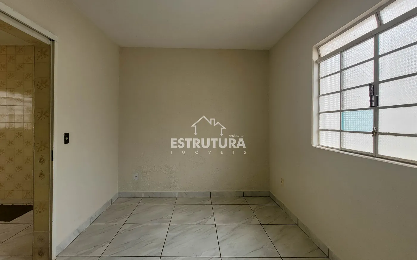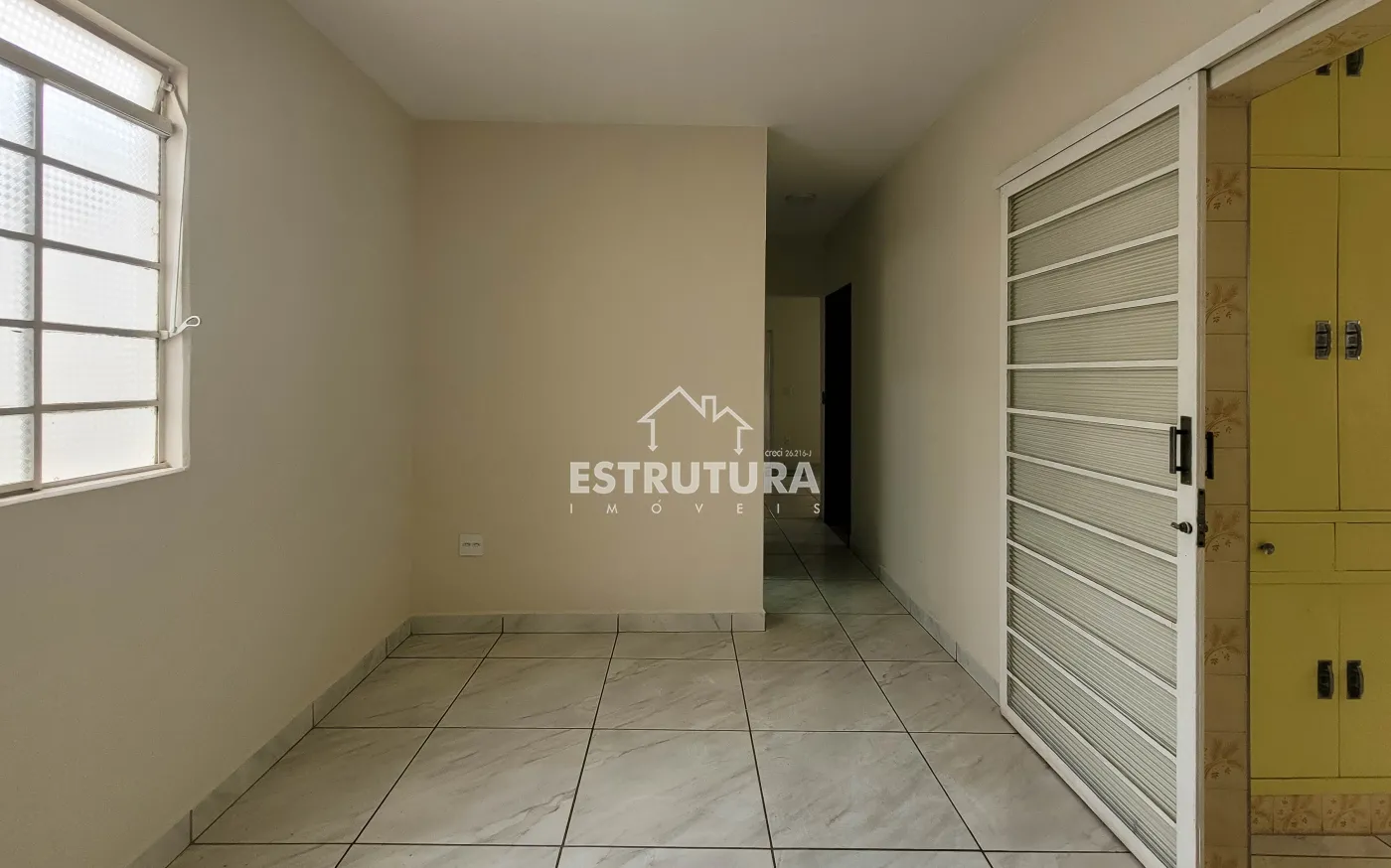 Ampla sala de estar, cozinha com gabinete, banheiro social.