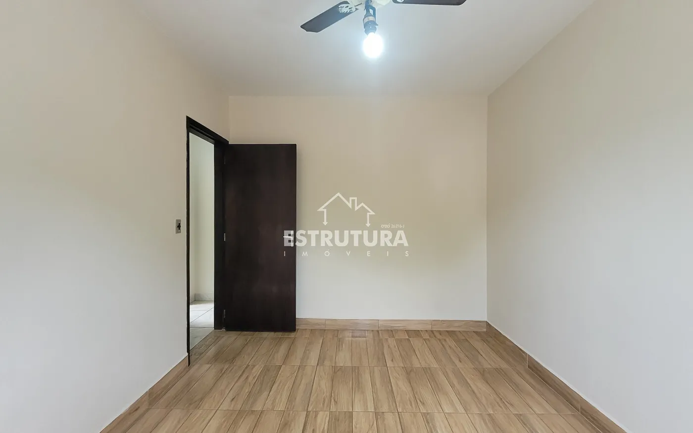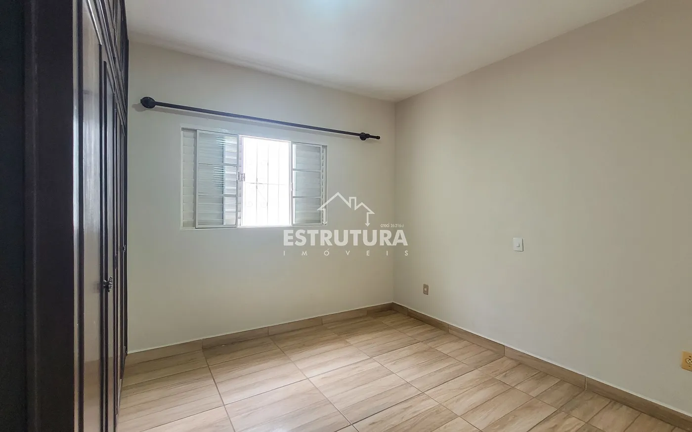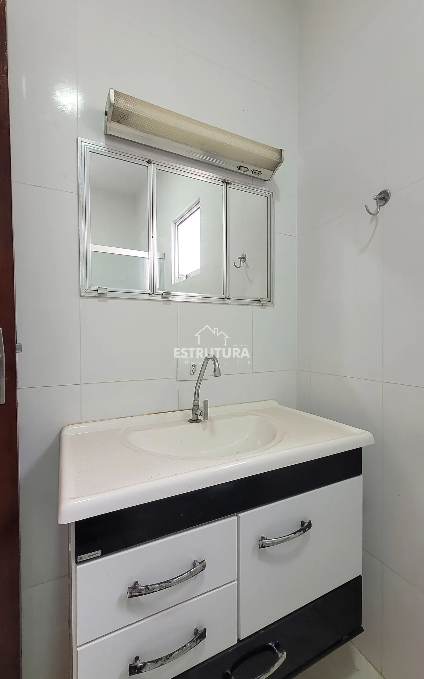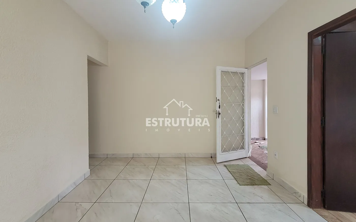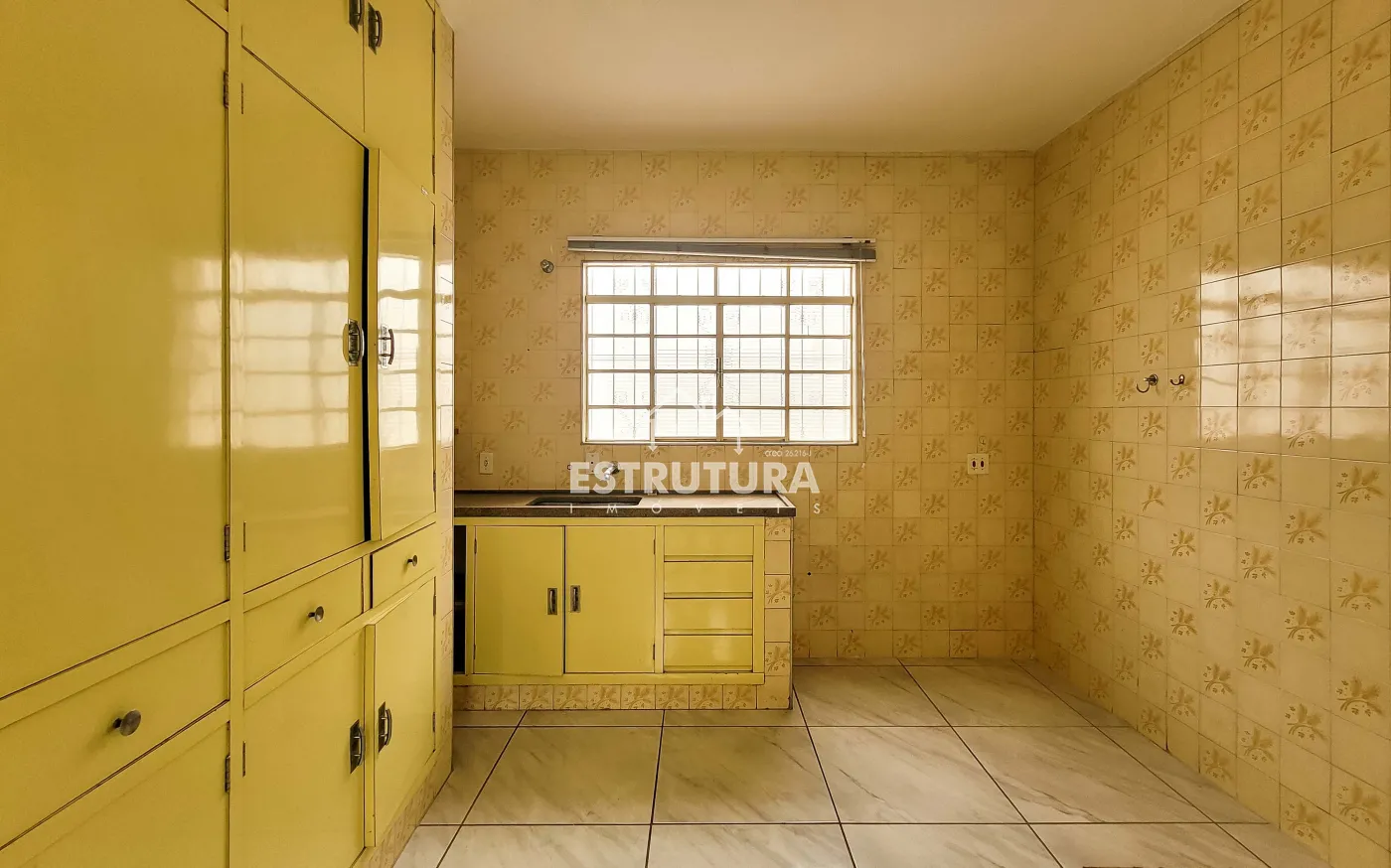 Ampla sala de estar, cozinha com gabinete, banheiro social.