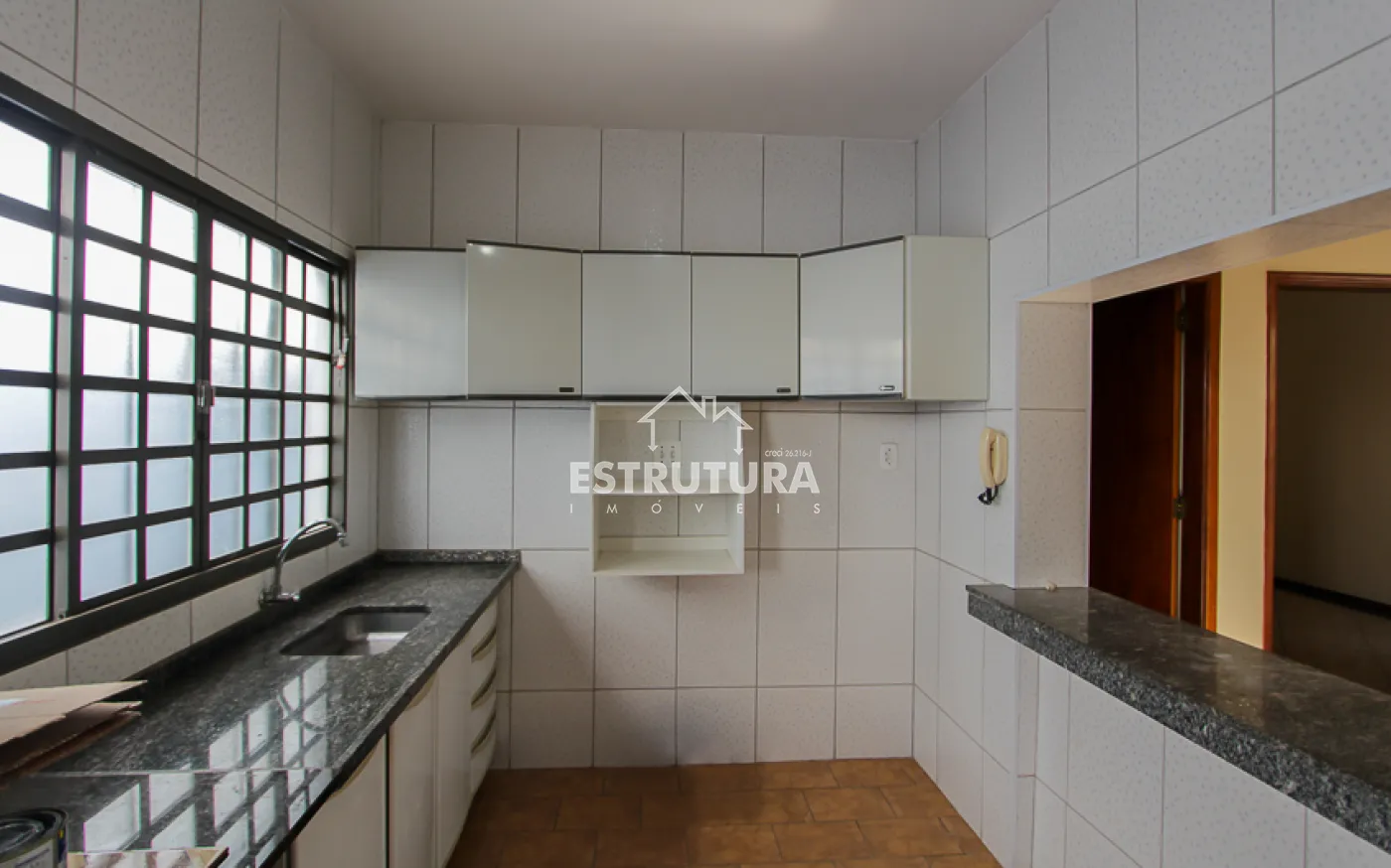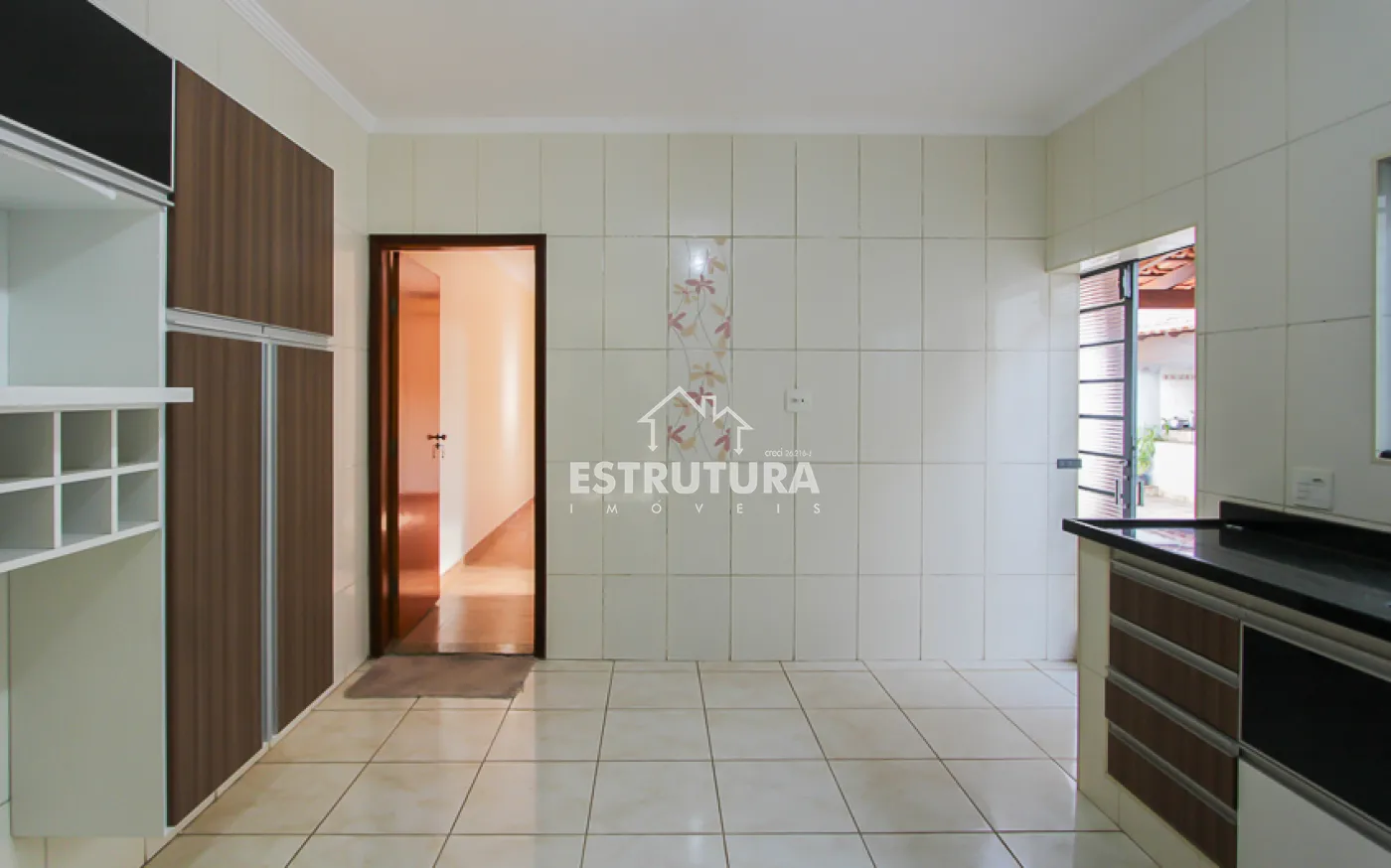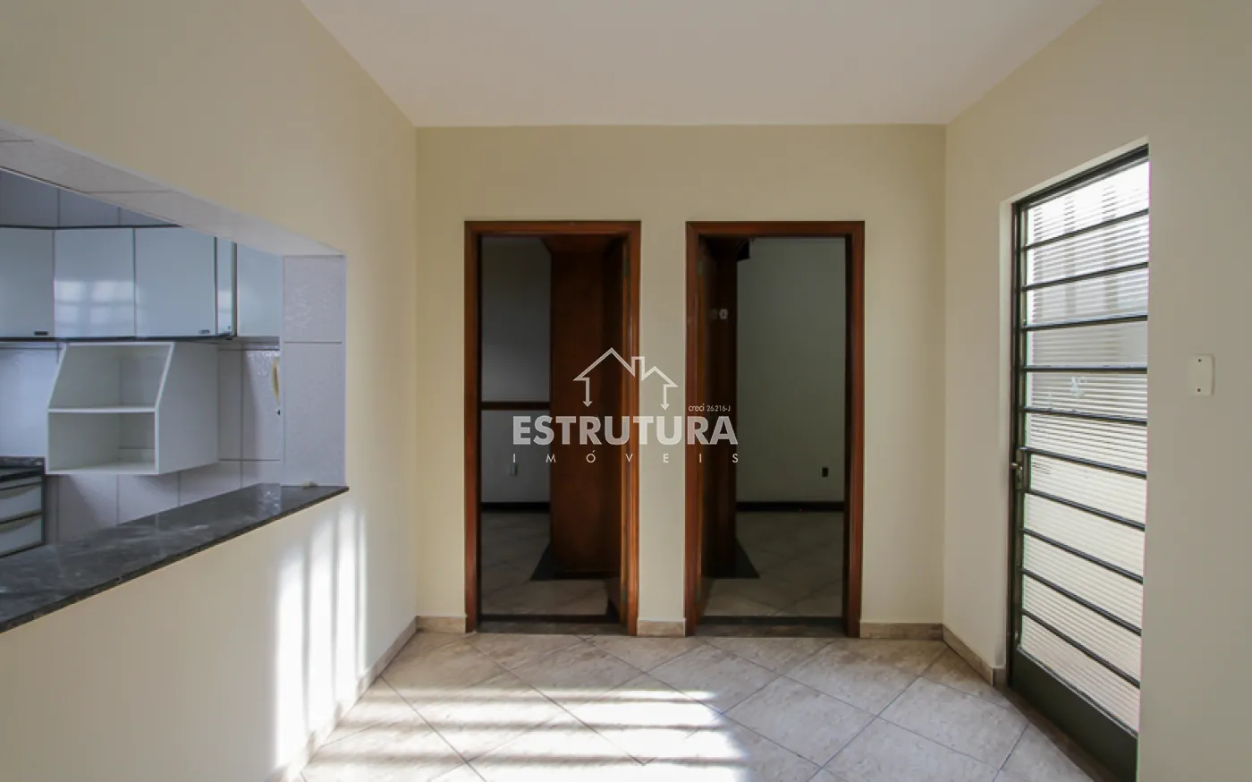 1 casa, com 2 dormitorios amplos sendo 1 com armario embutido e o outro com suite, 1 banheiro social, sala, cozinha ampla com armarios e gabinete.