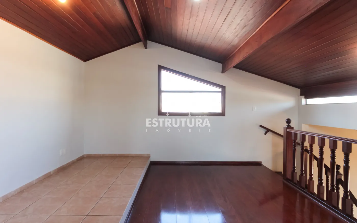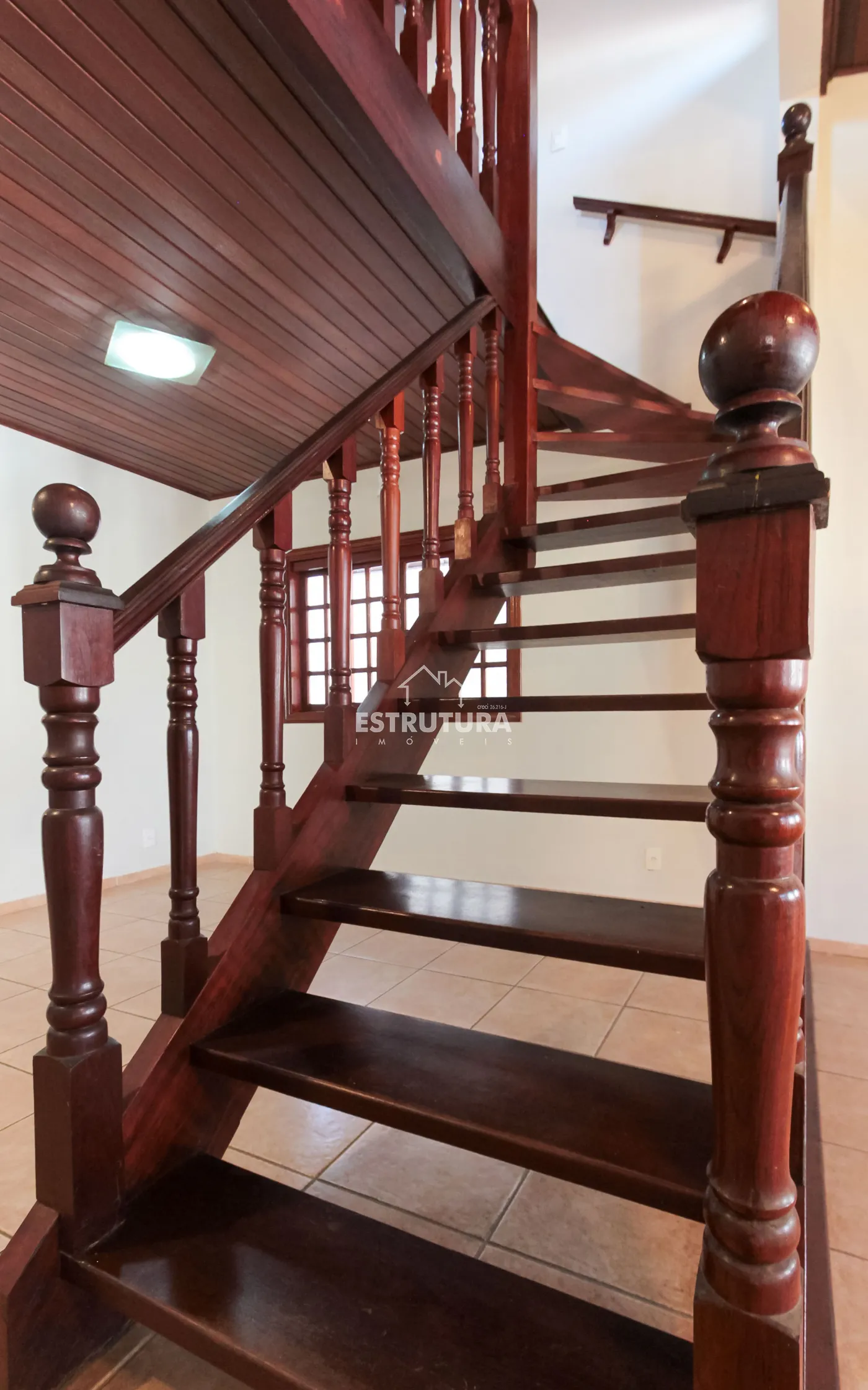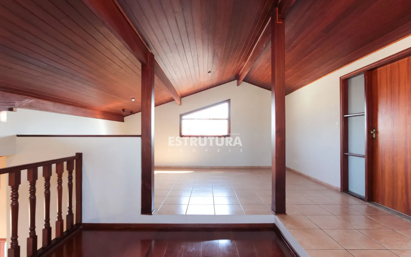 No piso superior, conta com sala ampla com detalhes em madeira, 1 dormitório com varanda, 1 suíte com hidromassagem e box em blindex.