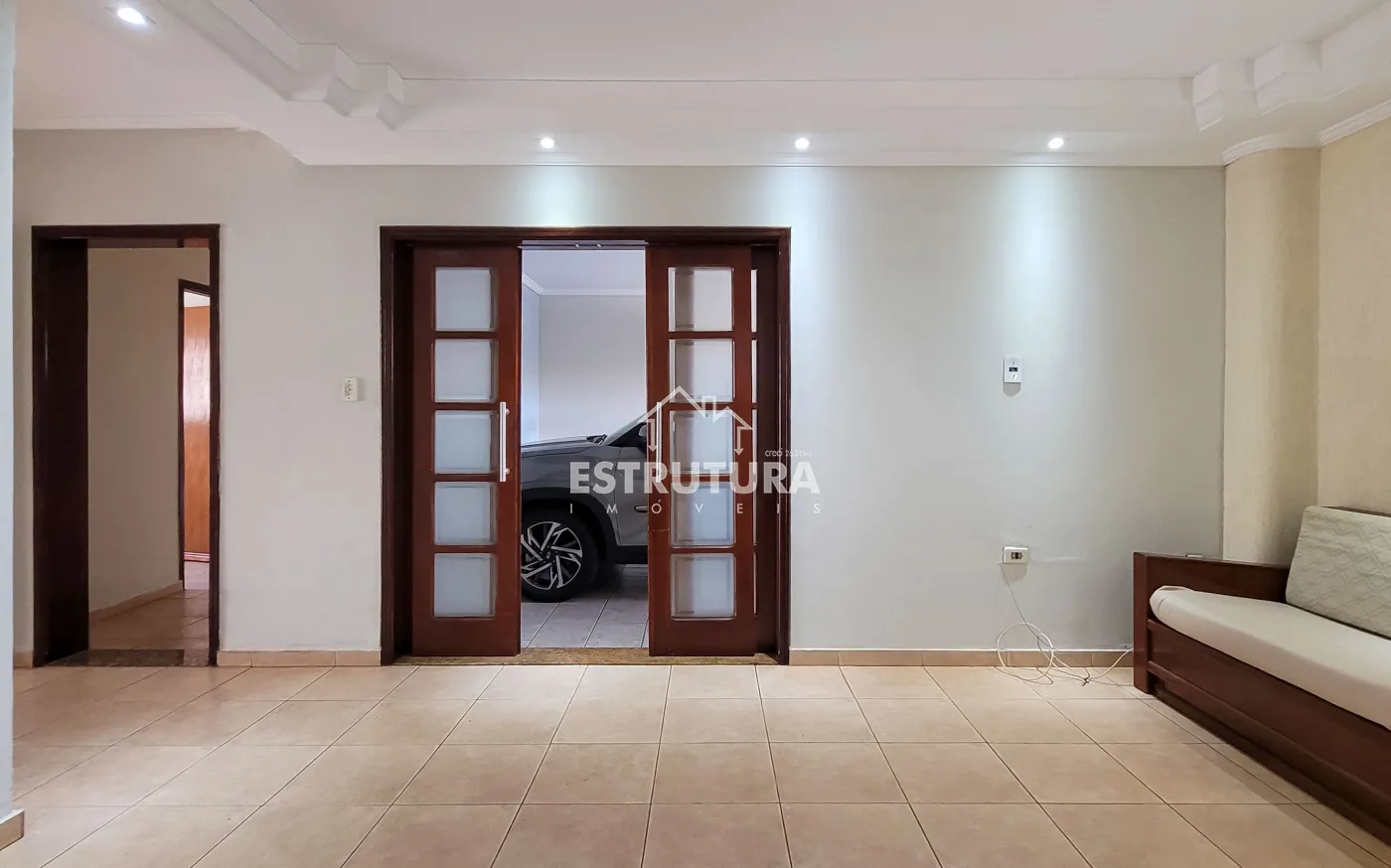 Imóvel com garagem coberta para 2 carros, sala ele sala ampla 2 ambientes com sofa, cozinha com gabinetes, 3 dormitórios sendo 1 suite e banheiro social.