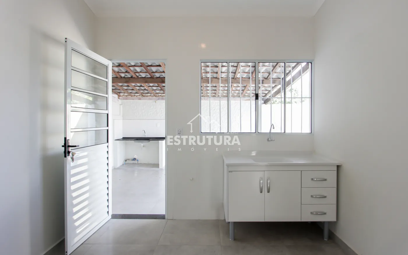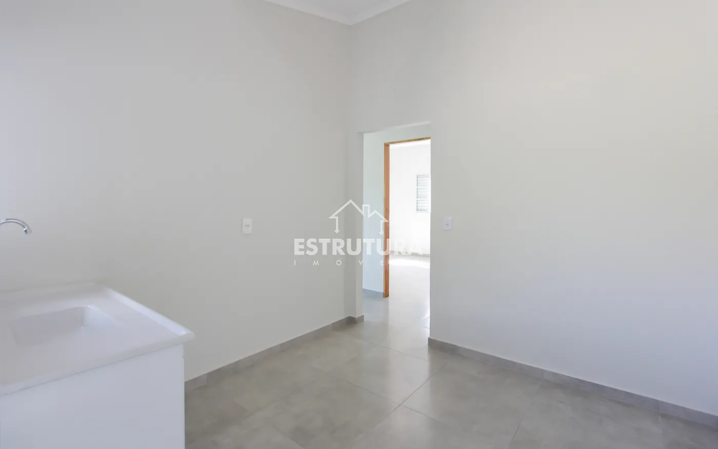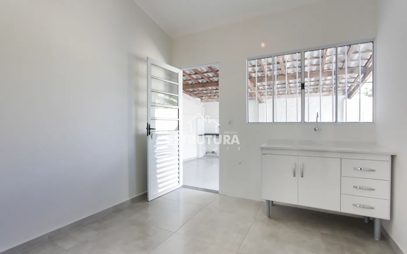Casa com 2 dormitórios, 1 banheiro social, cozinha, sala, lavanderia e garagem para 1 carro coberto.