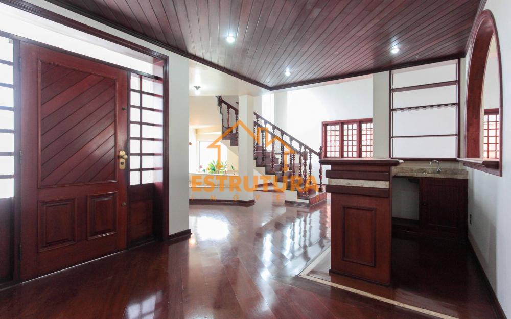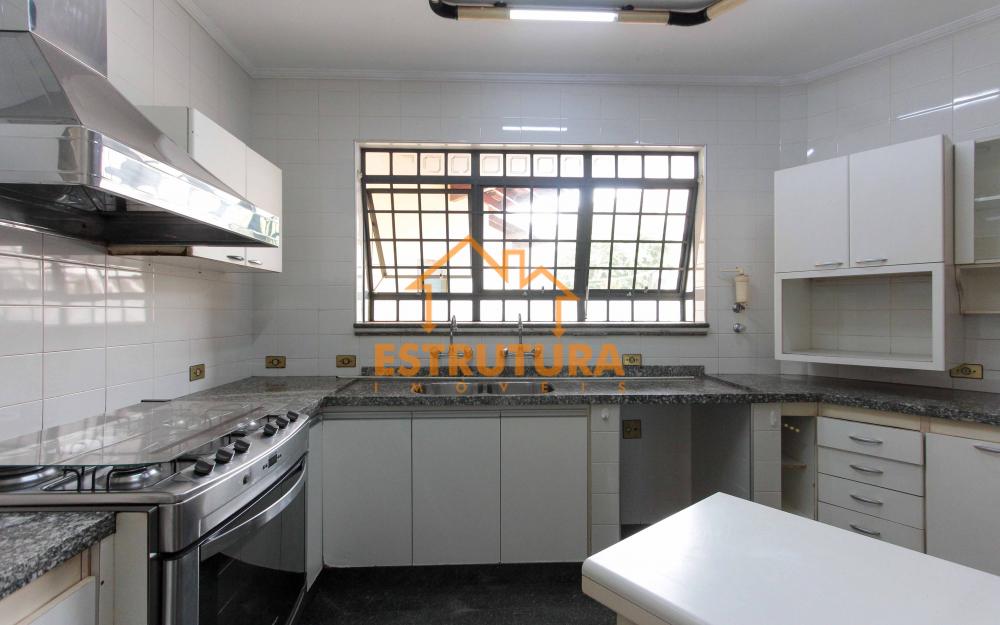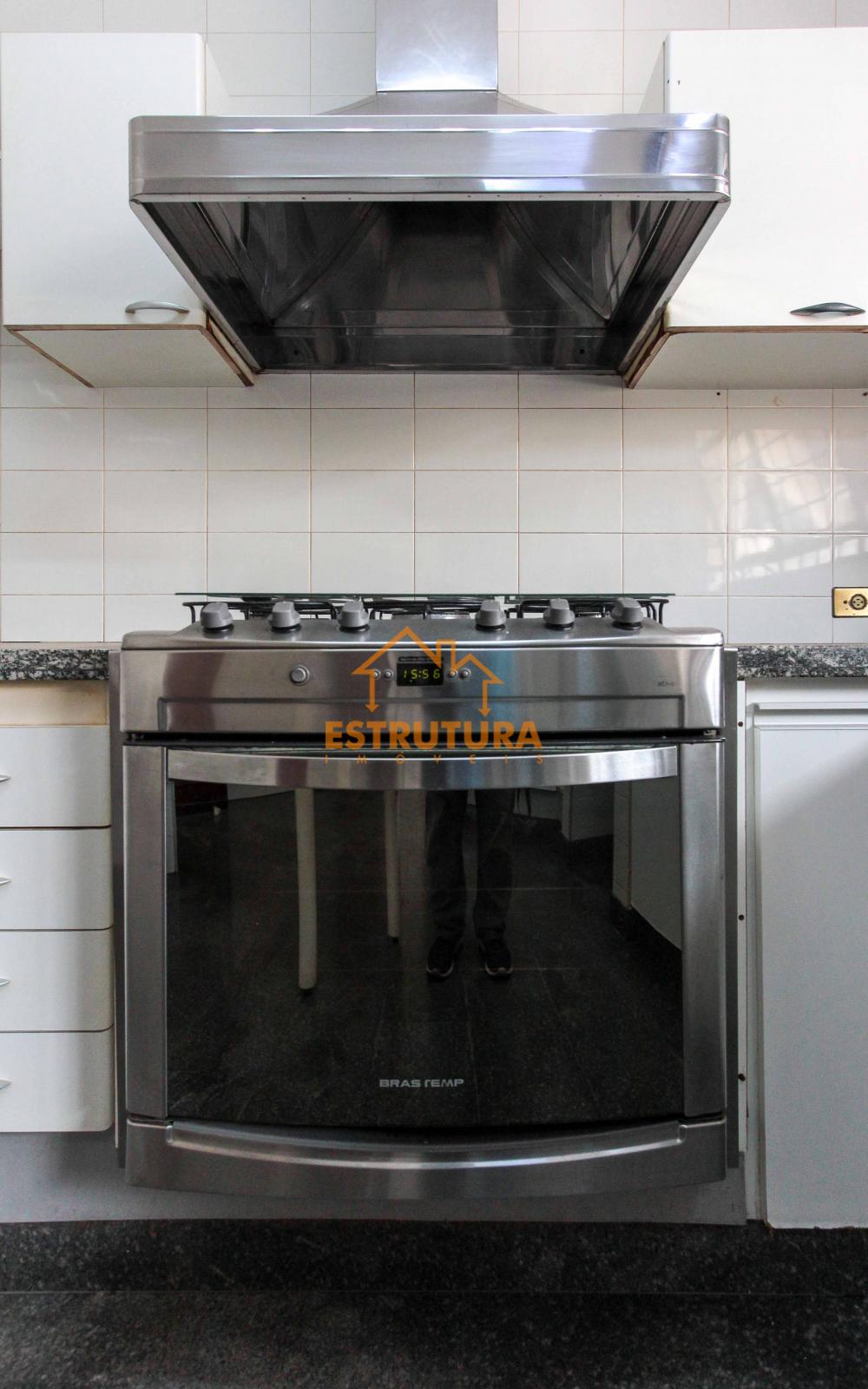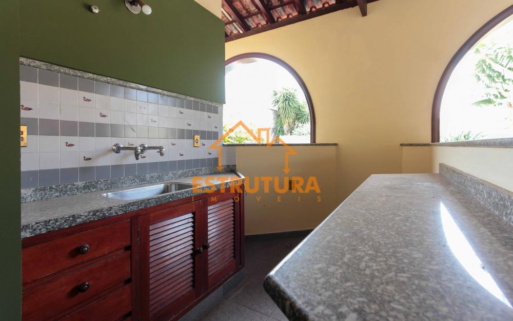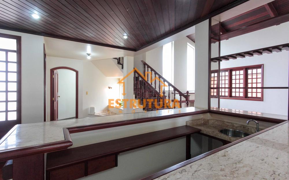 Ampla sala com 3 ambientes, varanda com bar, escritório no mezanino com armário, cozinha repleta de armários, fogão, coifa e despensa, área de serviço com armários e quarto de despensa.