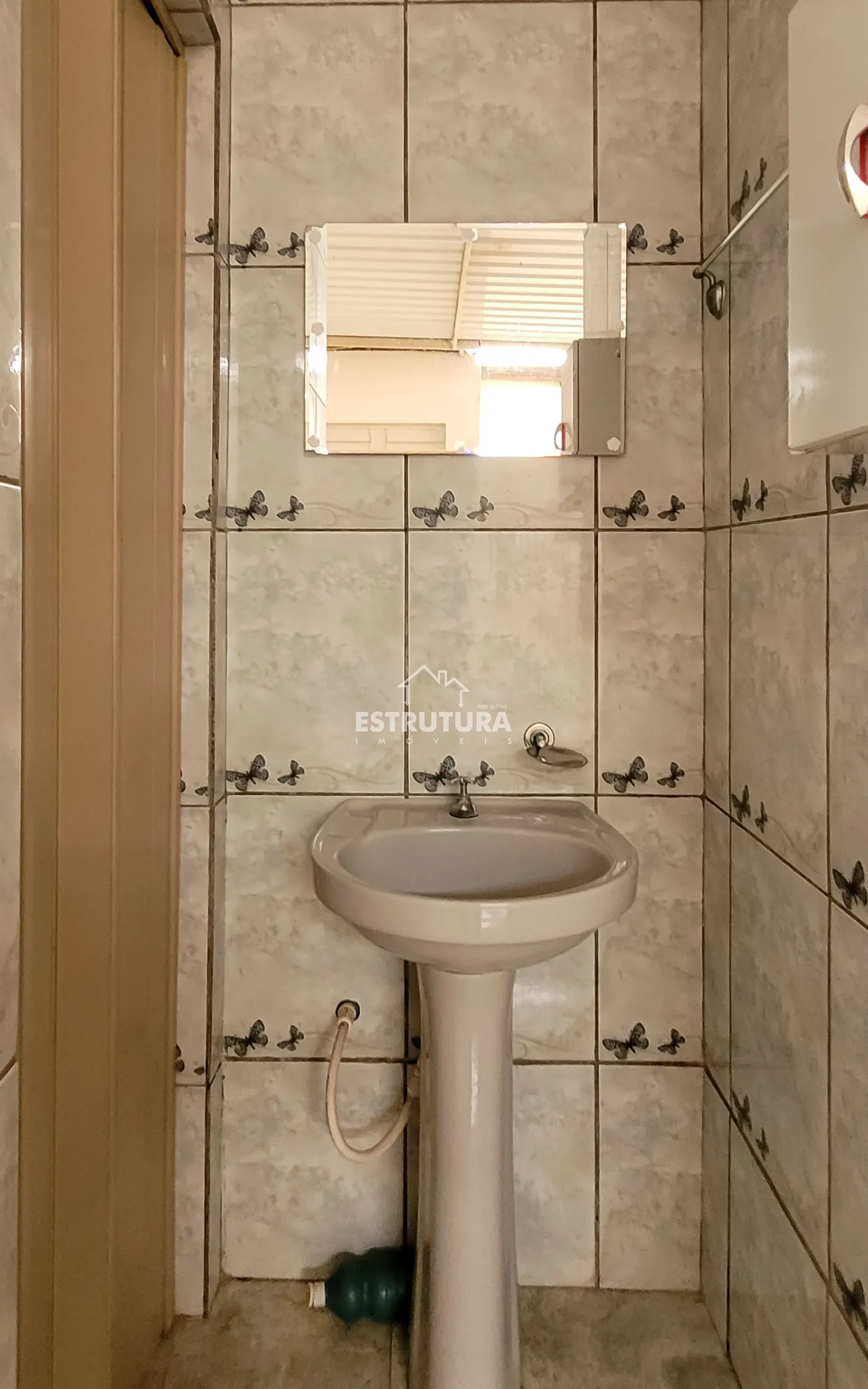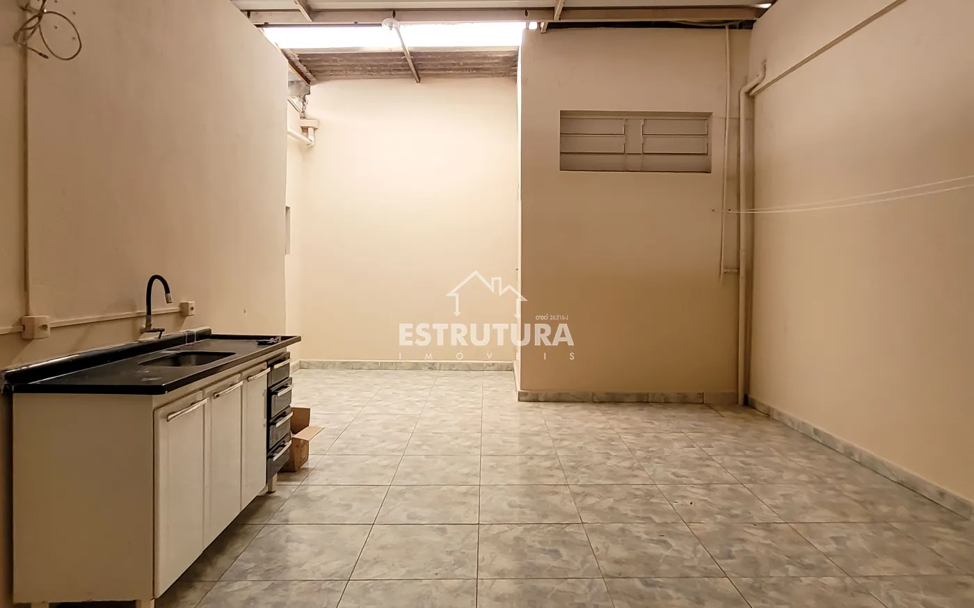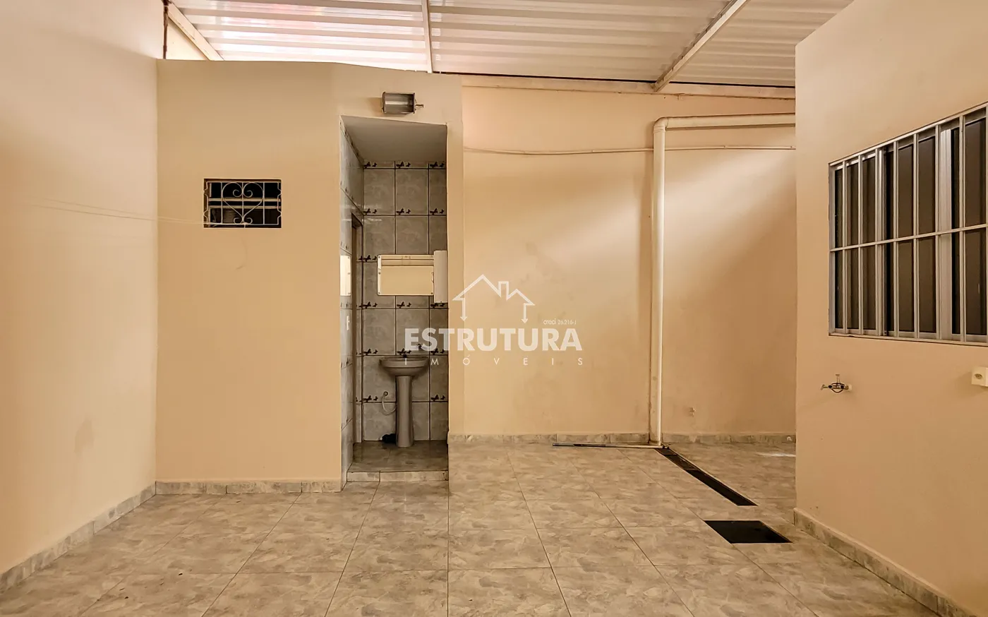 Nos fundos possui um pequeno espaço com pia, e um banheiro.