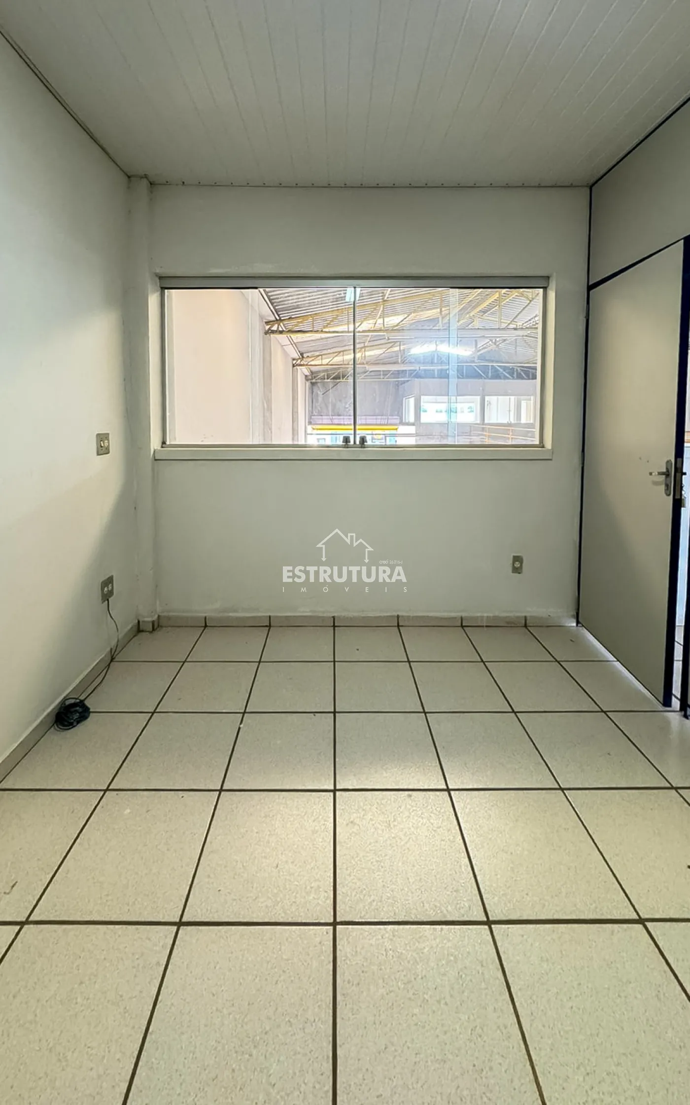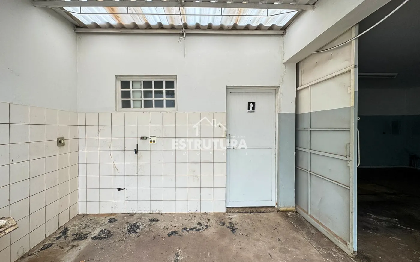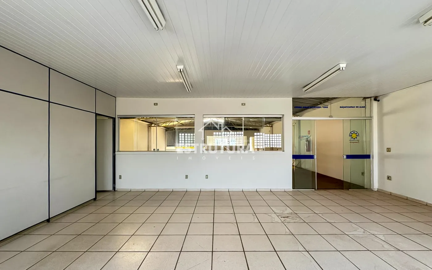 Entrada do barracão com porta e janelas automatizadas.