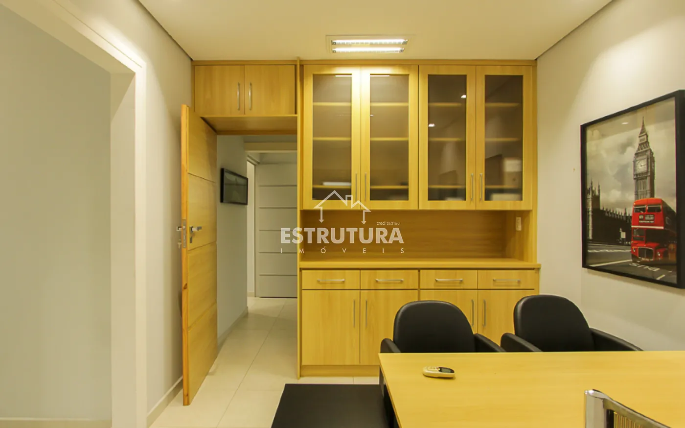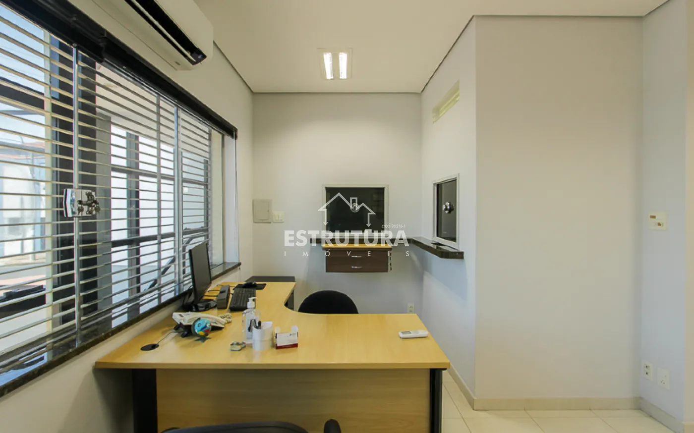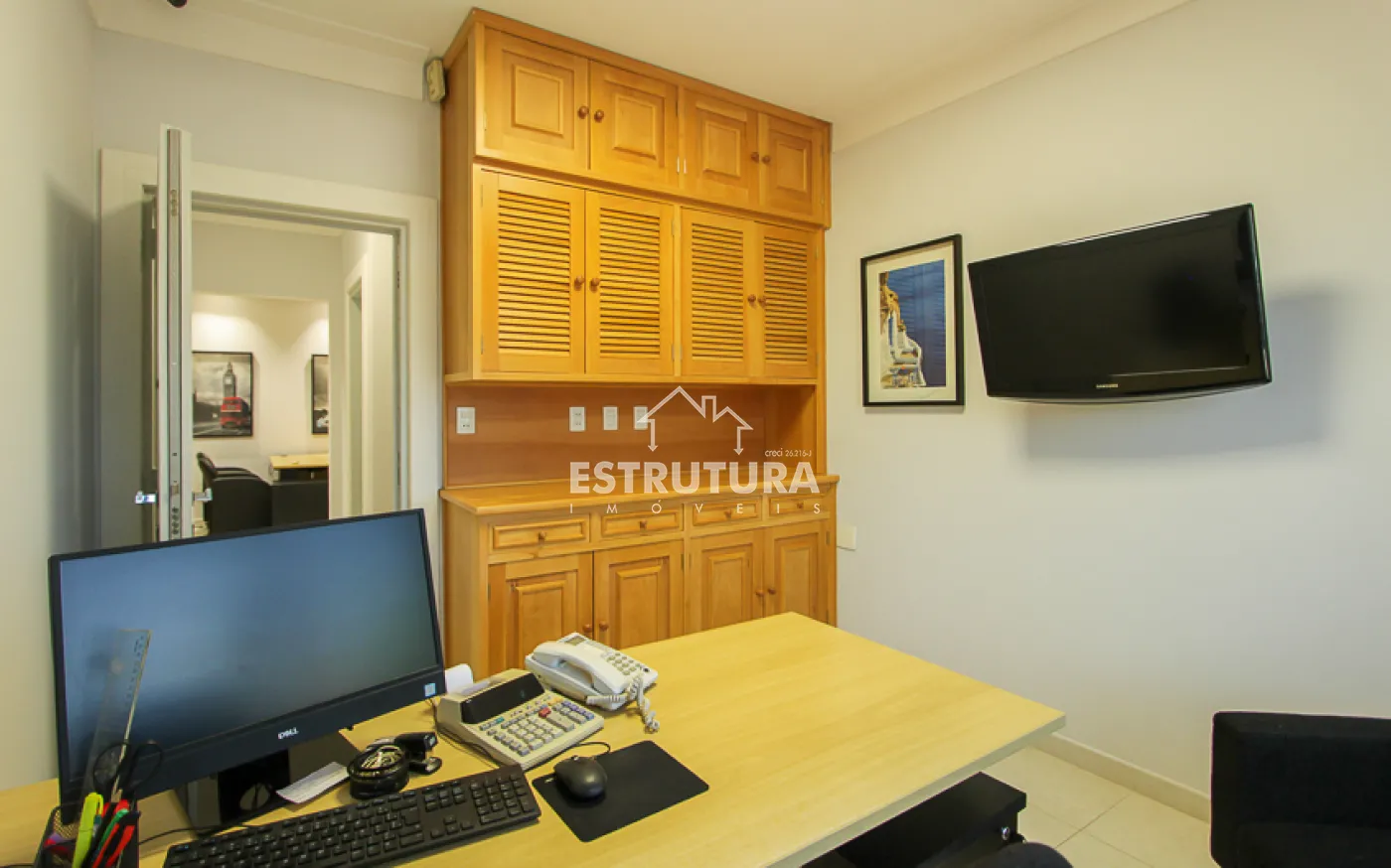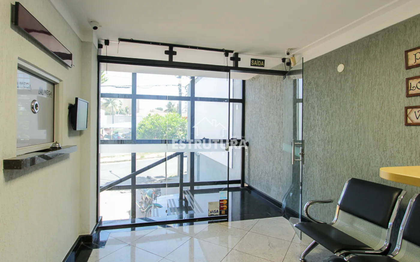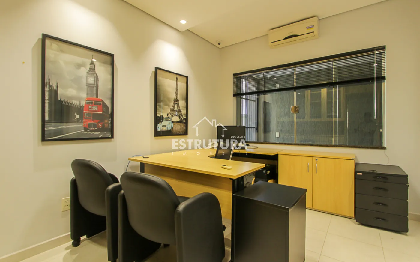 Fachada toda em blindex, contendo recepção, acesso às salas com porta blindada, 6 salas todas mobiliadas, equipadas com armários, ares condicionados, mesas, cadeiras, computadores e telefones, 03 banheiros, cozinha com armários, lavanderia coberta e quarto despejo.