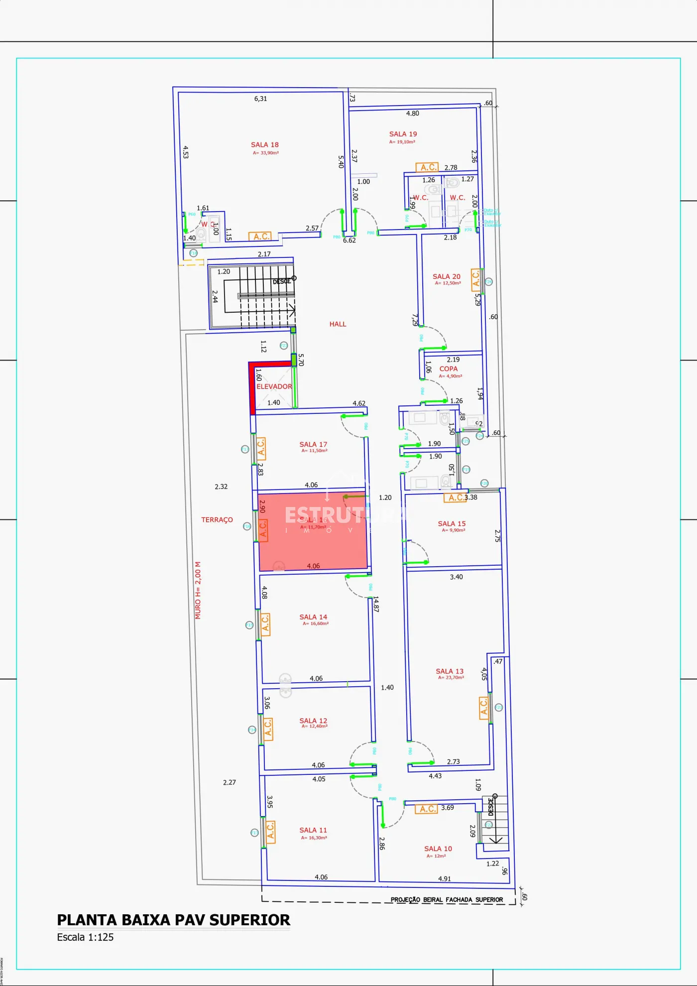 Sala comercial nova, em piso superior com 11,70 m² já adaptada para colocar ar condicionado
