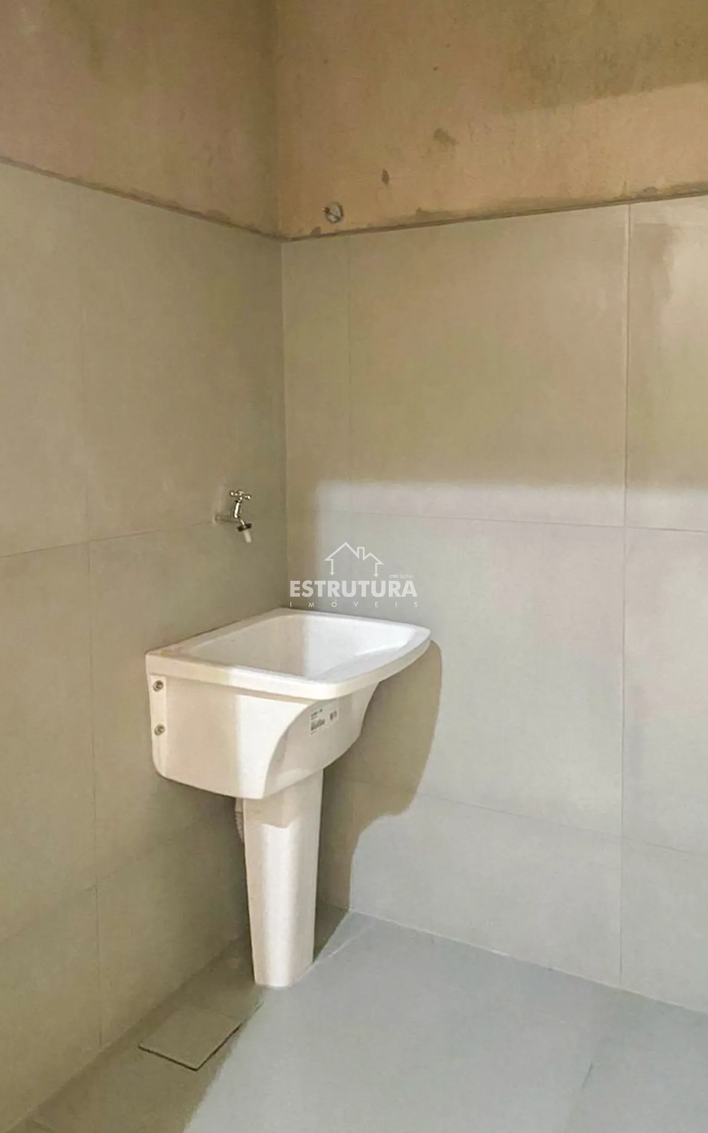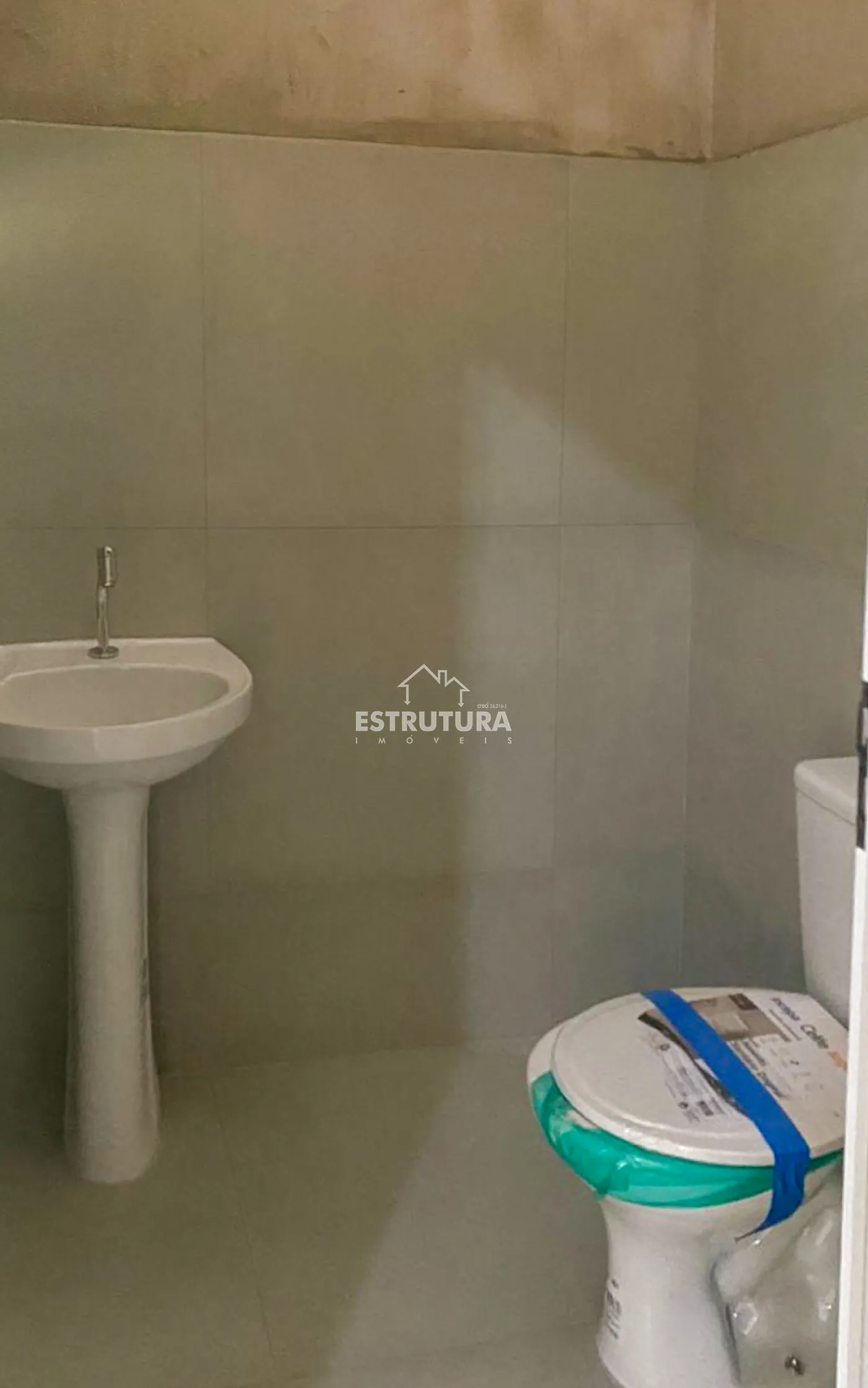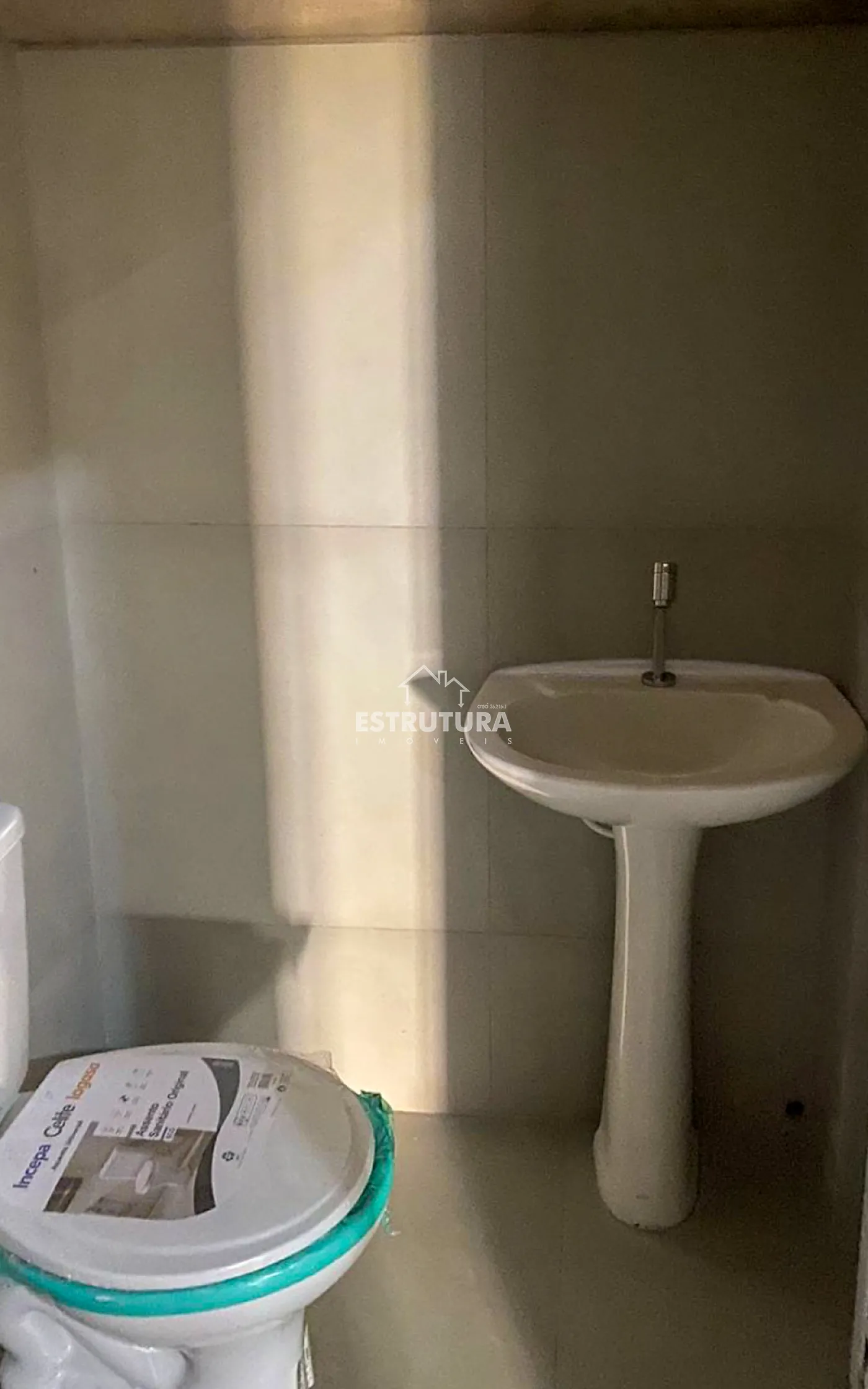 O espaço conta com três banheiros já revestidos em porcelanato, sendo um adaptado para acessibilidade.