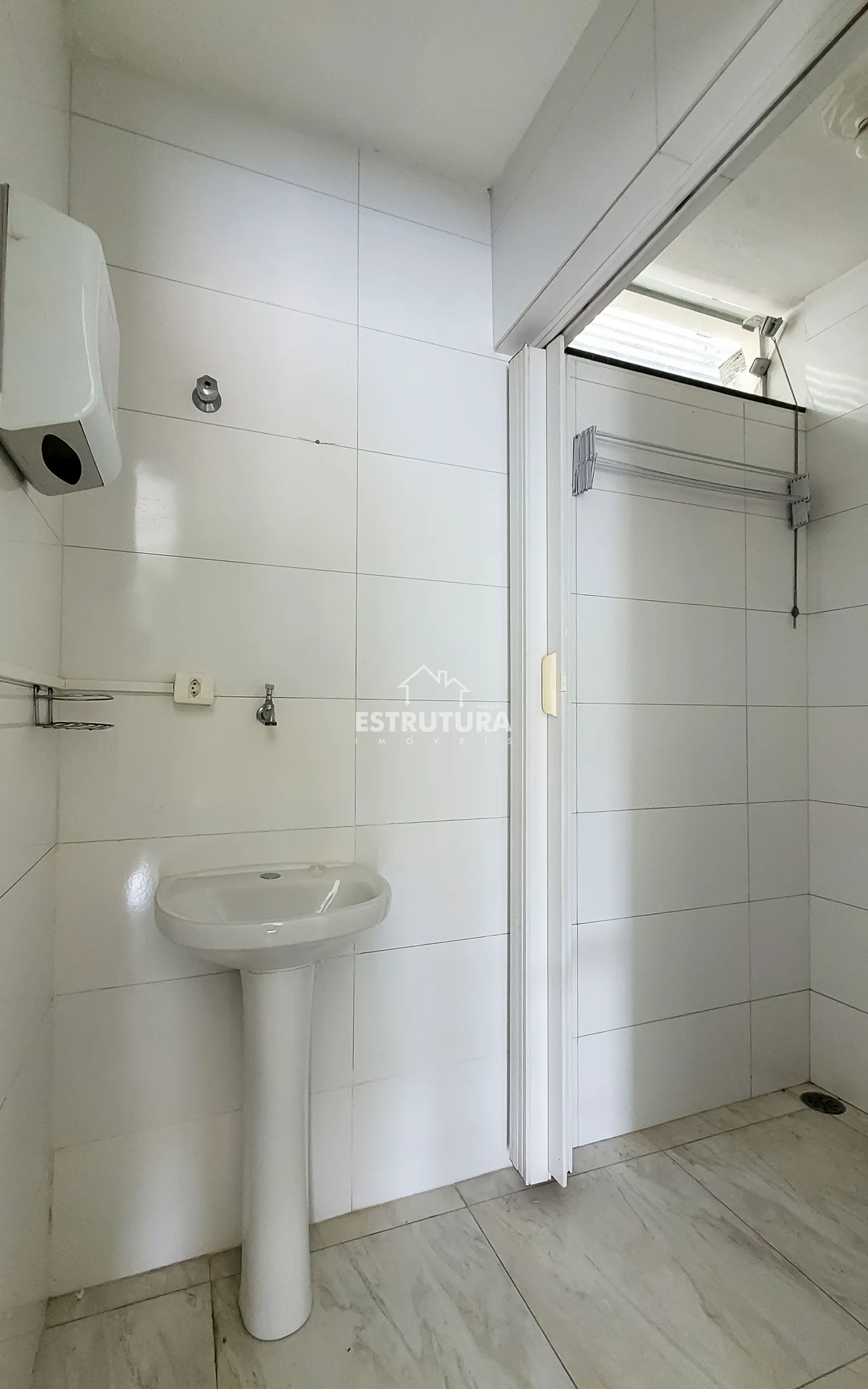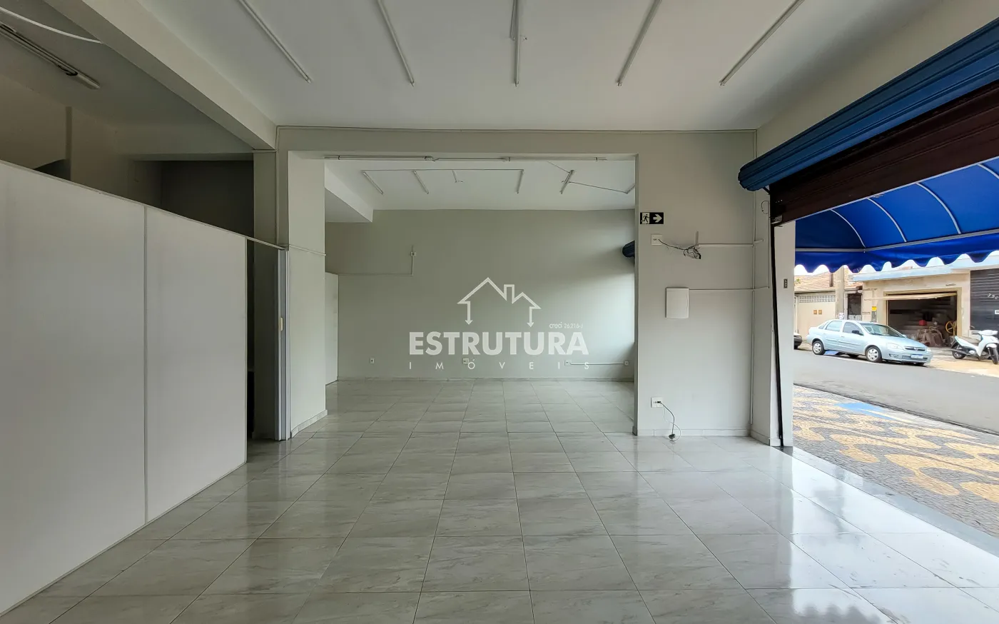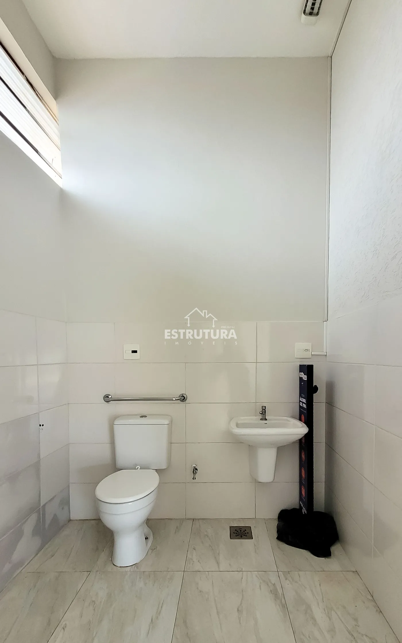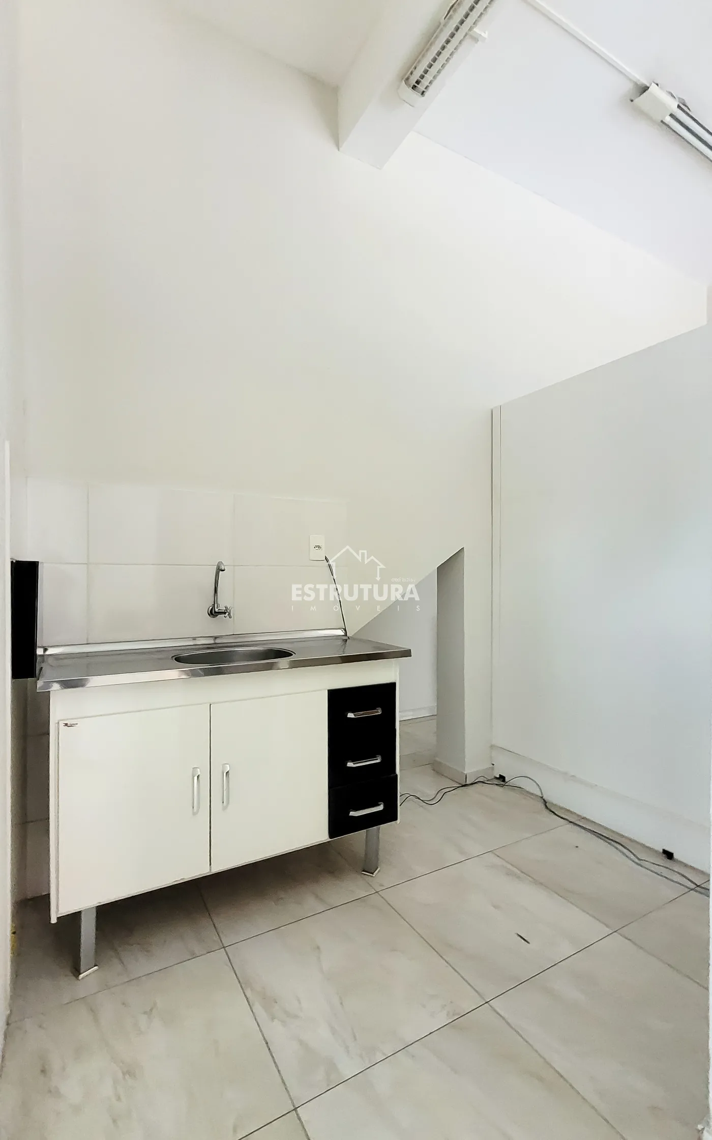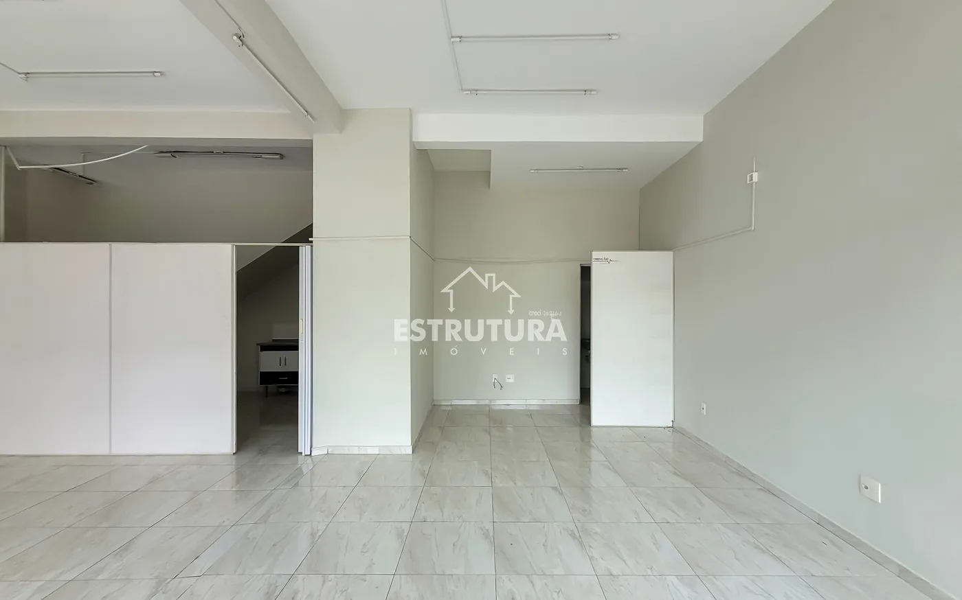 Salão comercial com dois banheiros, cozinha e almoxarifado.