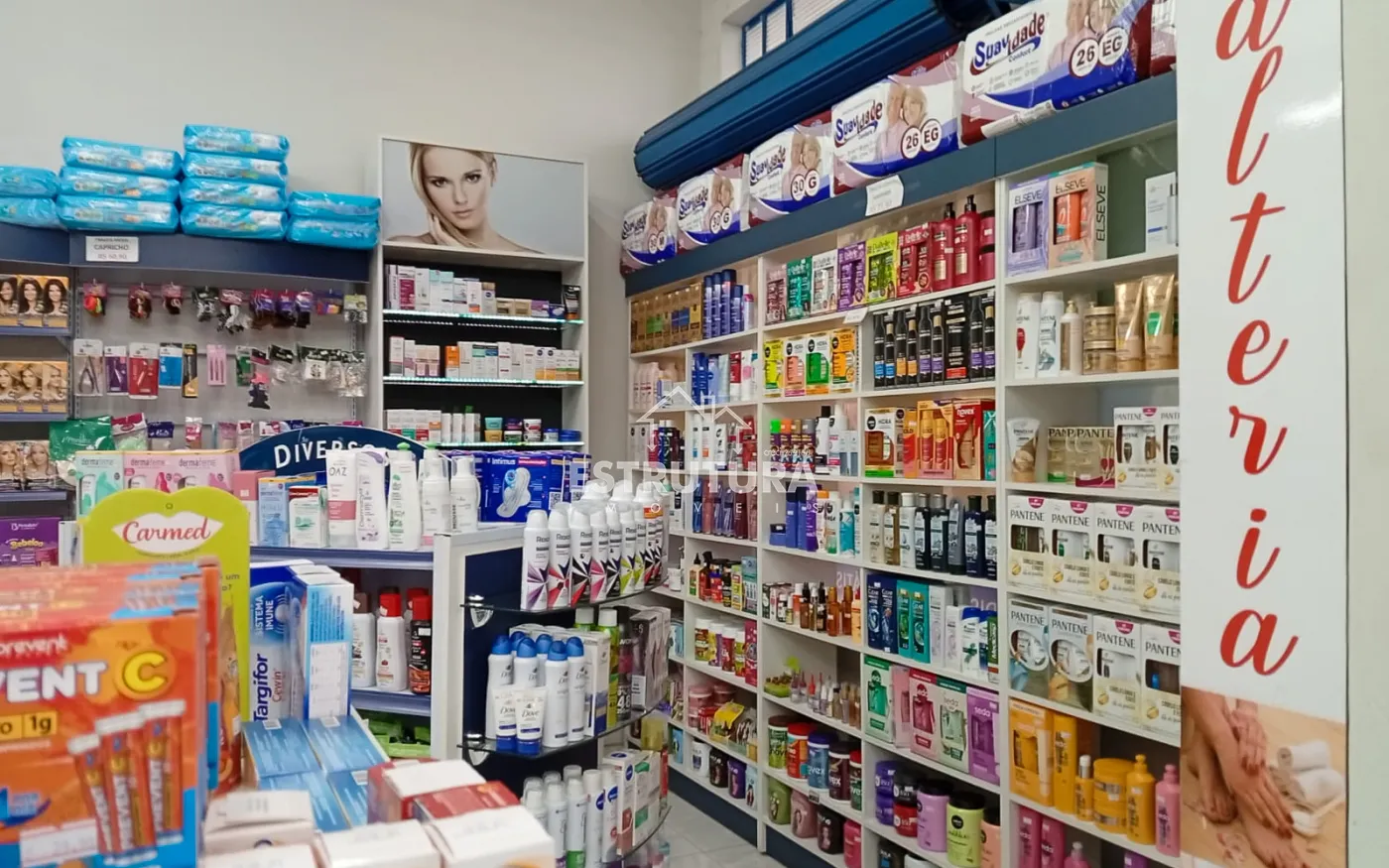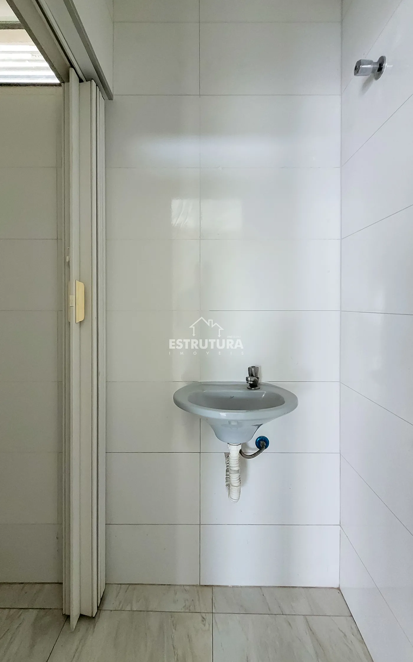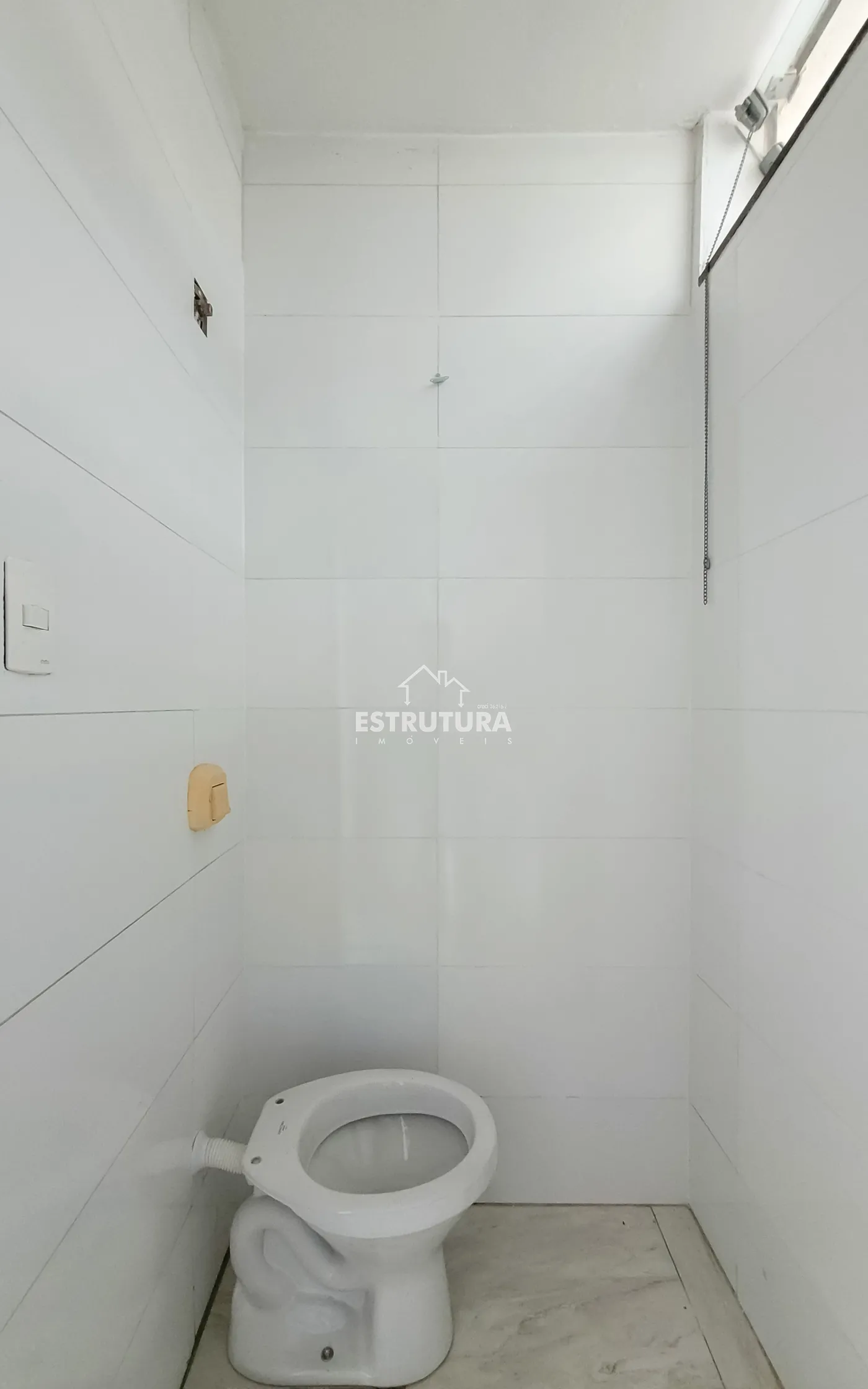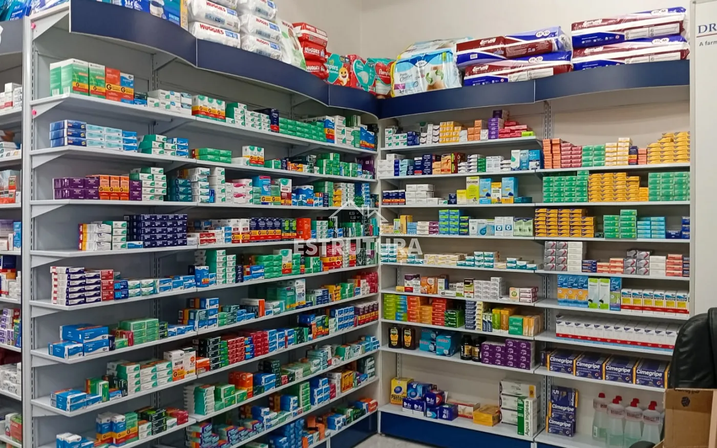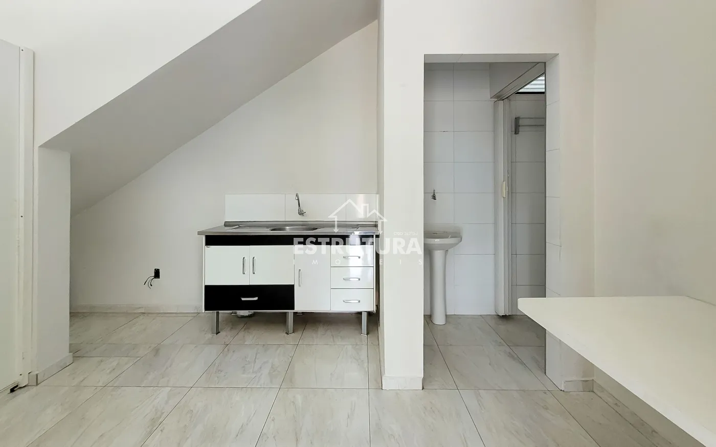 Salão comercial com dois banheiros, cozinha e almoxarifado.