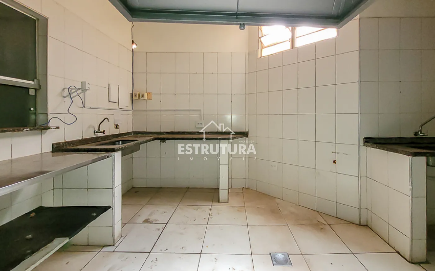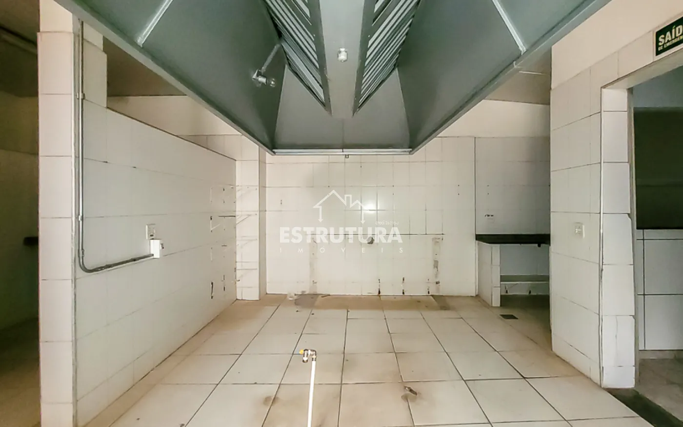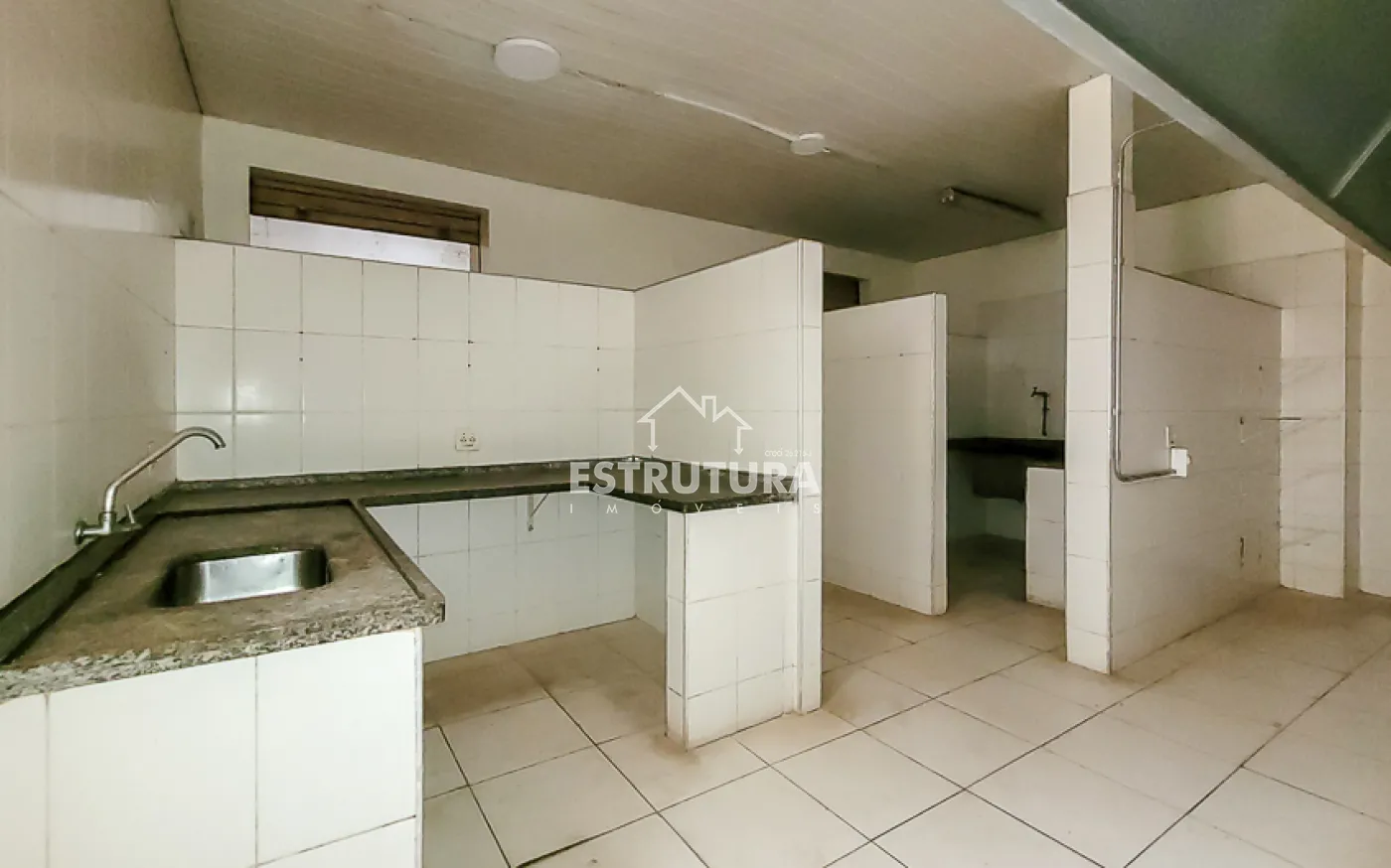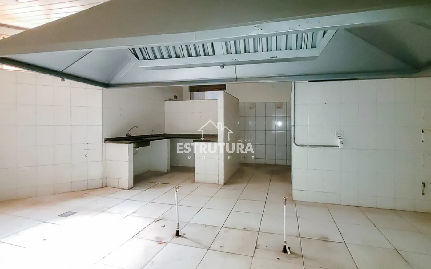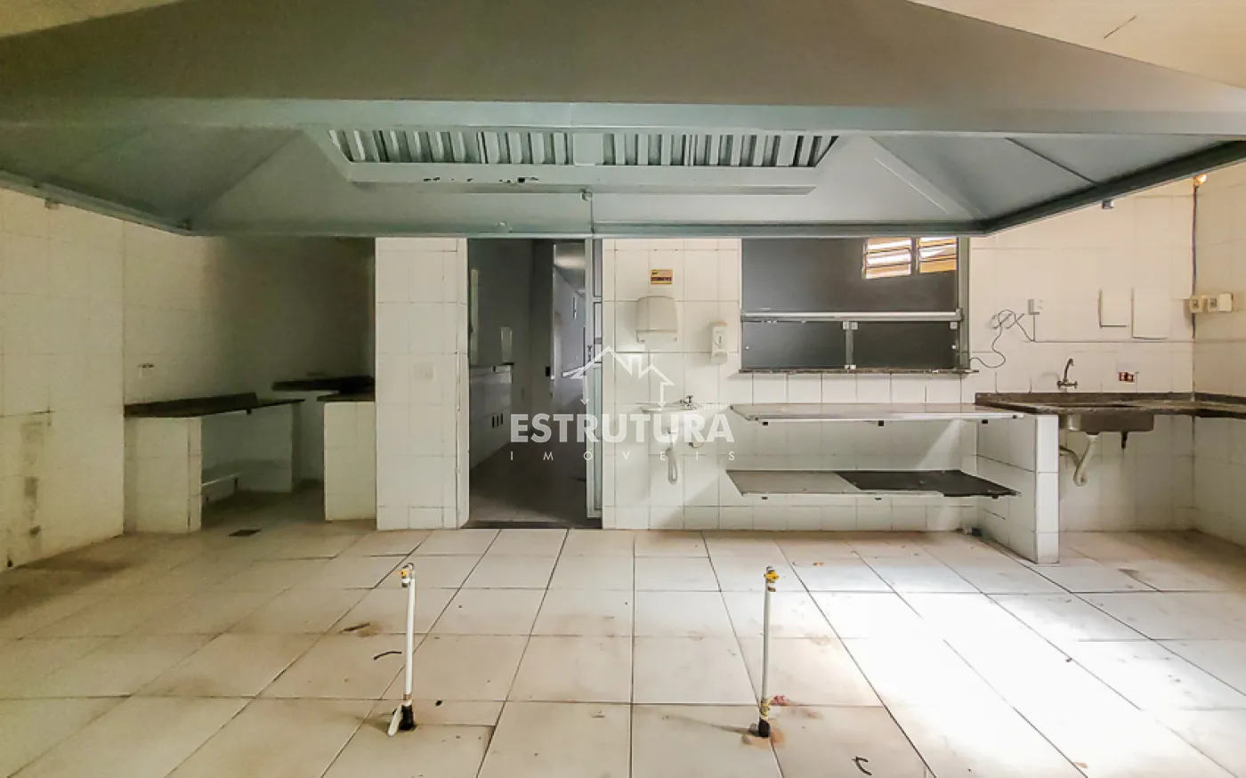A estrutura está preparada para restaurante, com cozinha industrial equipada com cinco pias e lavanderia. Nos fundos, há dois vestiários e, no piso superior, um ambiente versátil ideal para depósito ou estoque.