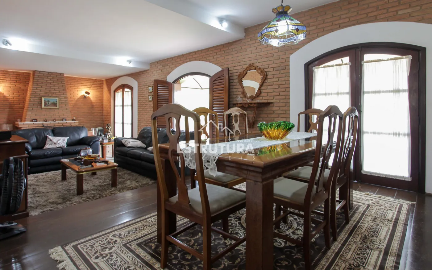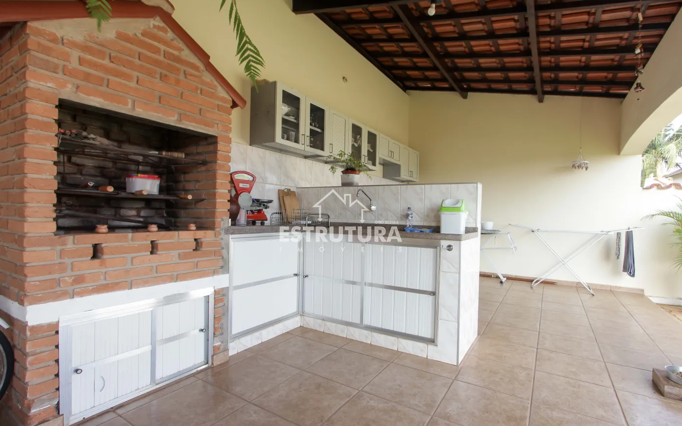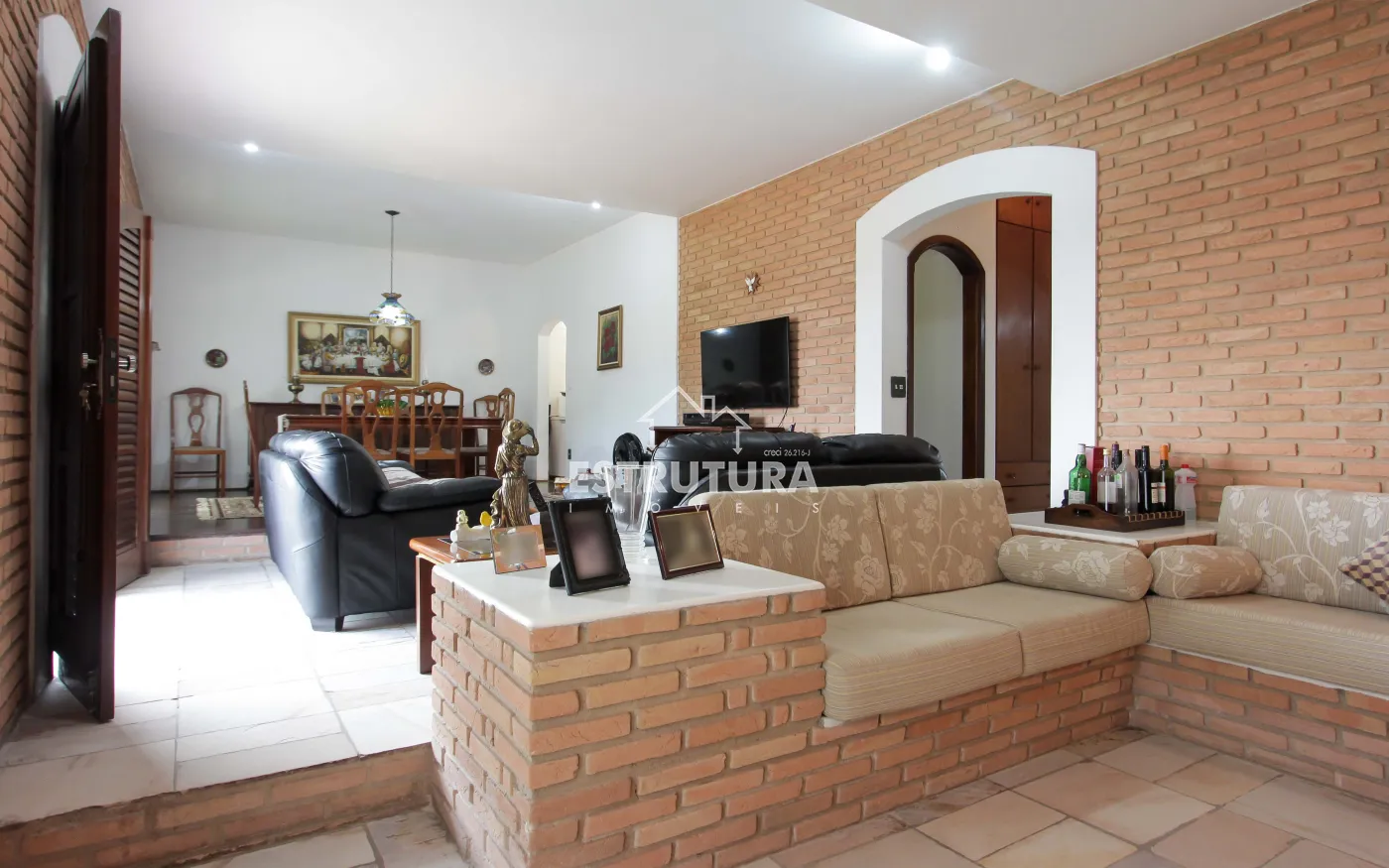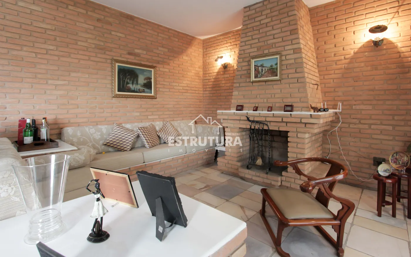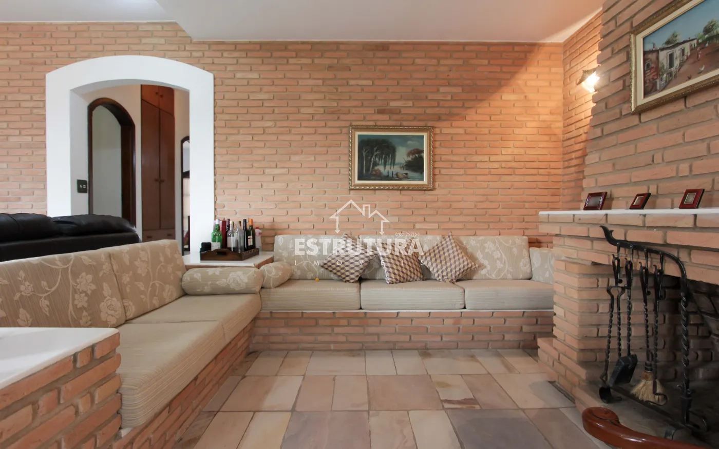 Casa de esquina, construída com tijolinhos, jardim com entrada social, garagem com portão eletrônico coberta para 02 veículos, sala com três ambientes com portas balcão em madeira, piso elevado em madeira para sala de jantar, restante em pedra mineira sendo sala de tv e sala de visita com lareira, maravilhoso lavabo, duas suítes com armários em madeira e portas balcão, cozinha com armários em madeira.