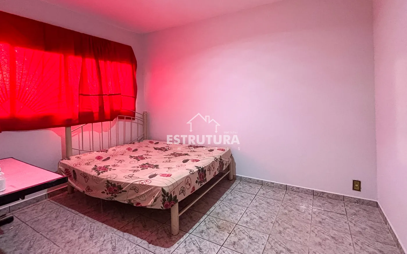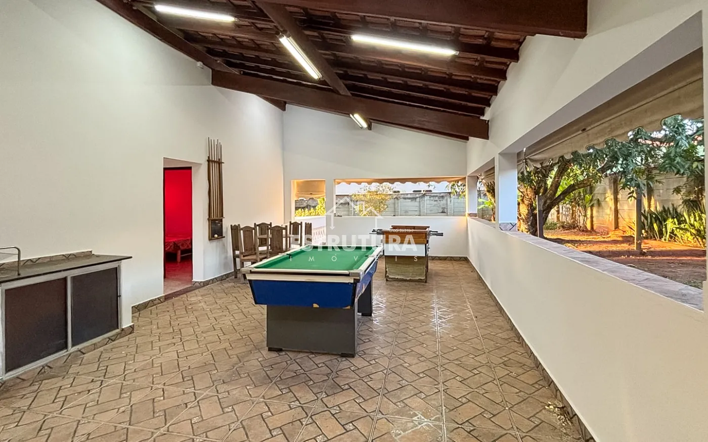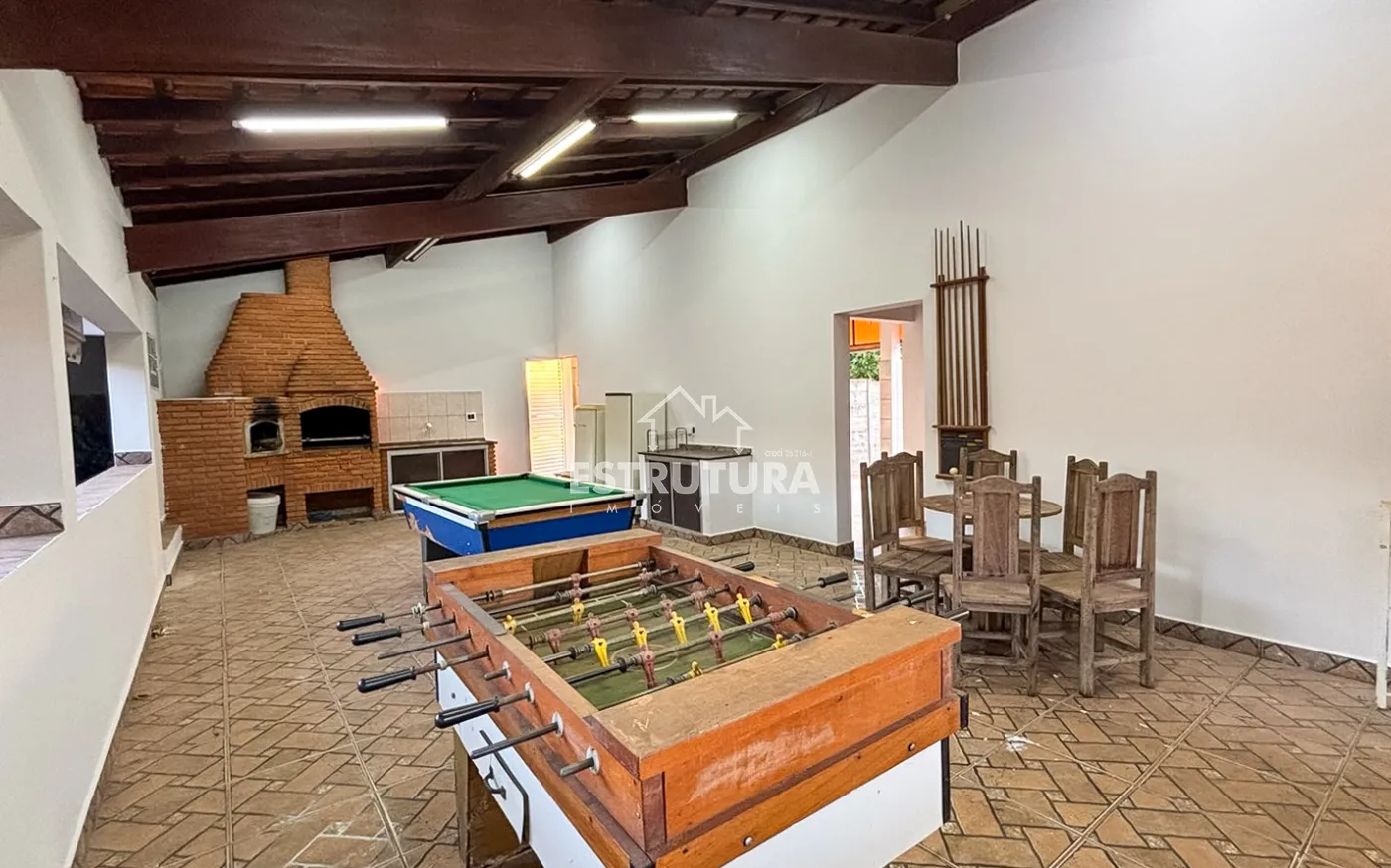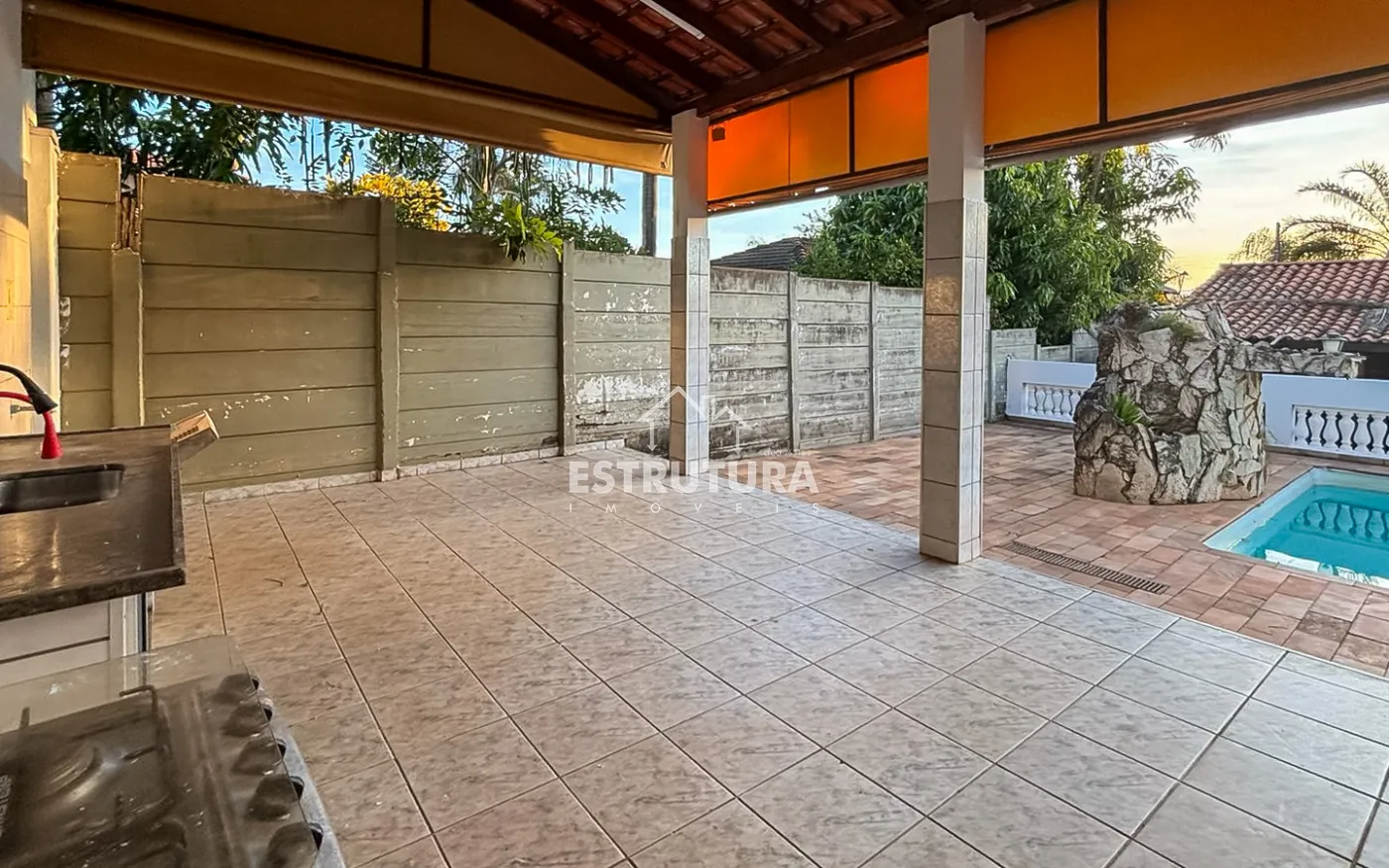 A casa de alvenaria contem cozinha, 1 dormitório, banheiro social e ampla área gourmet com sinuca e totó.