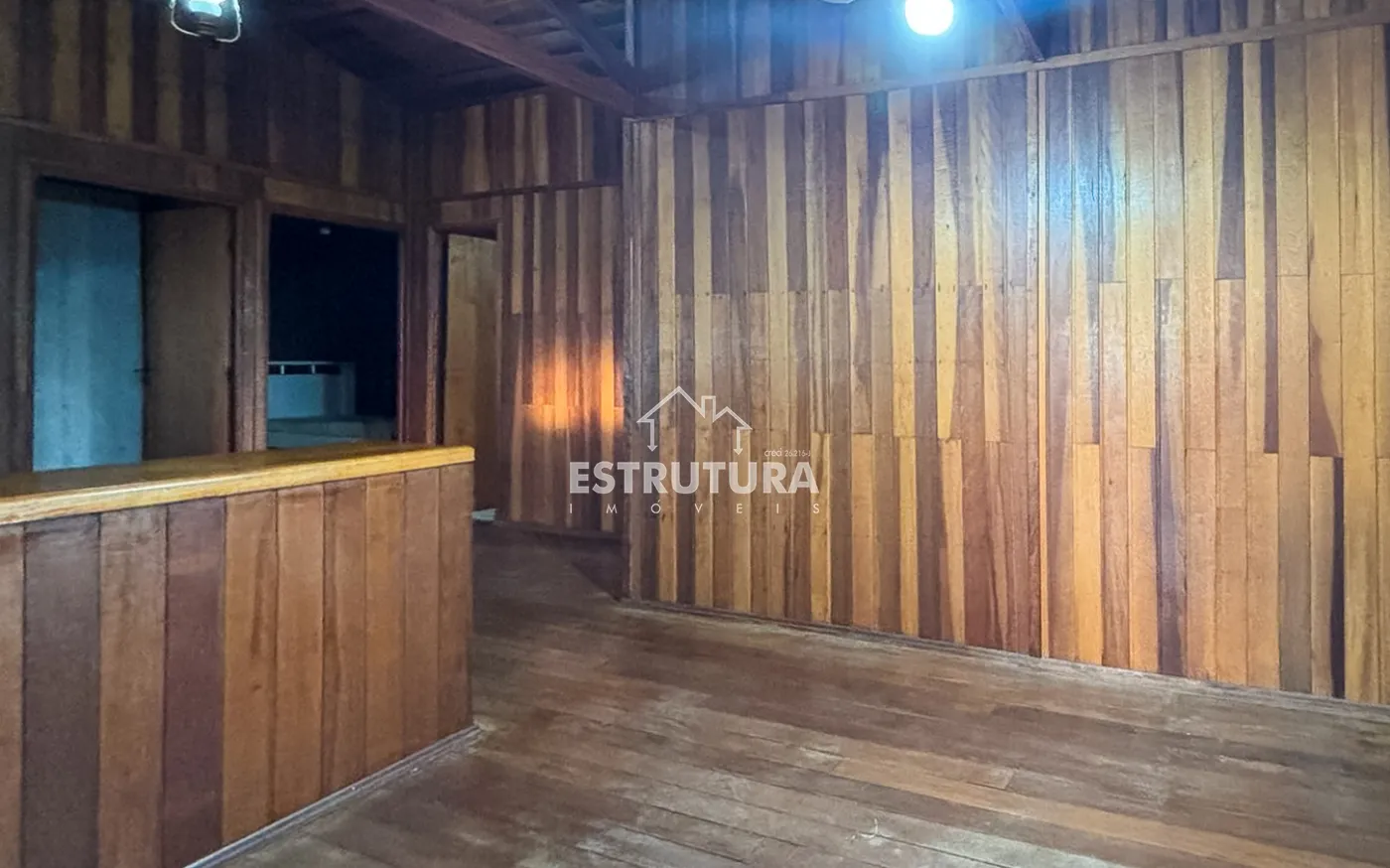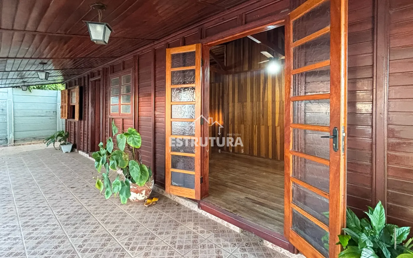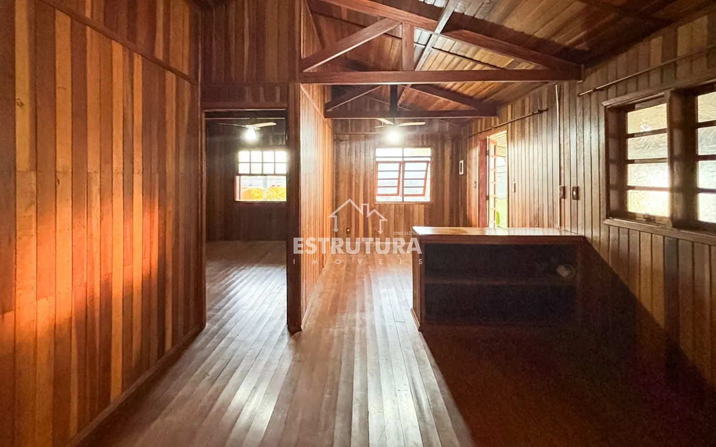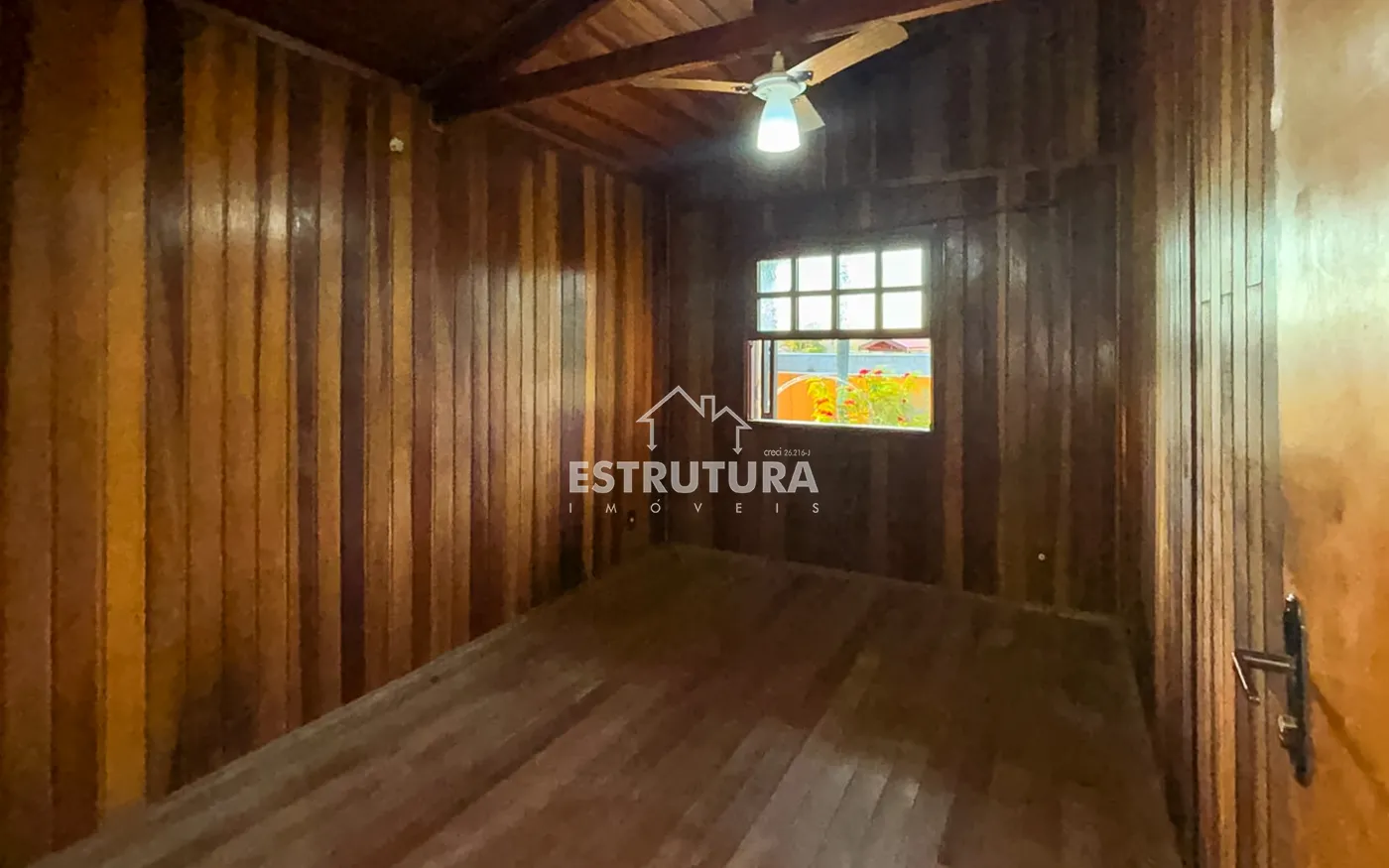 Casa de madeira, com 3 dormitórios, sala de estar, sala de TV, banheiro.