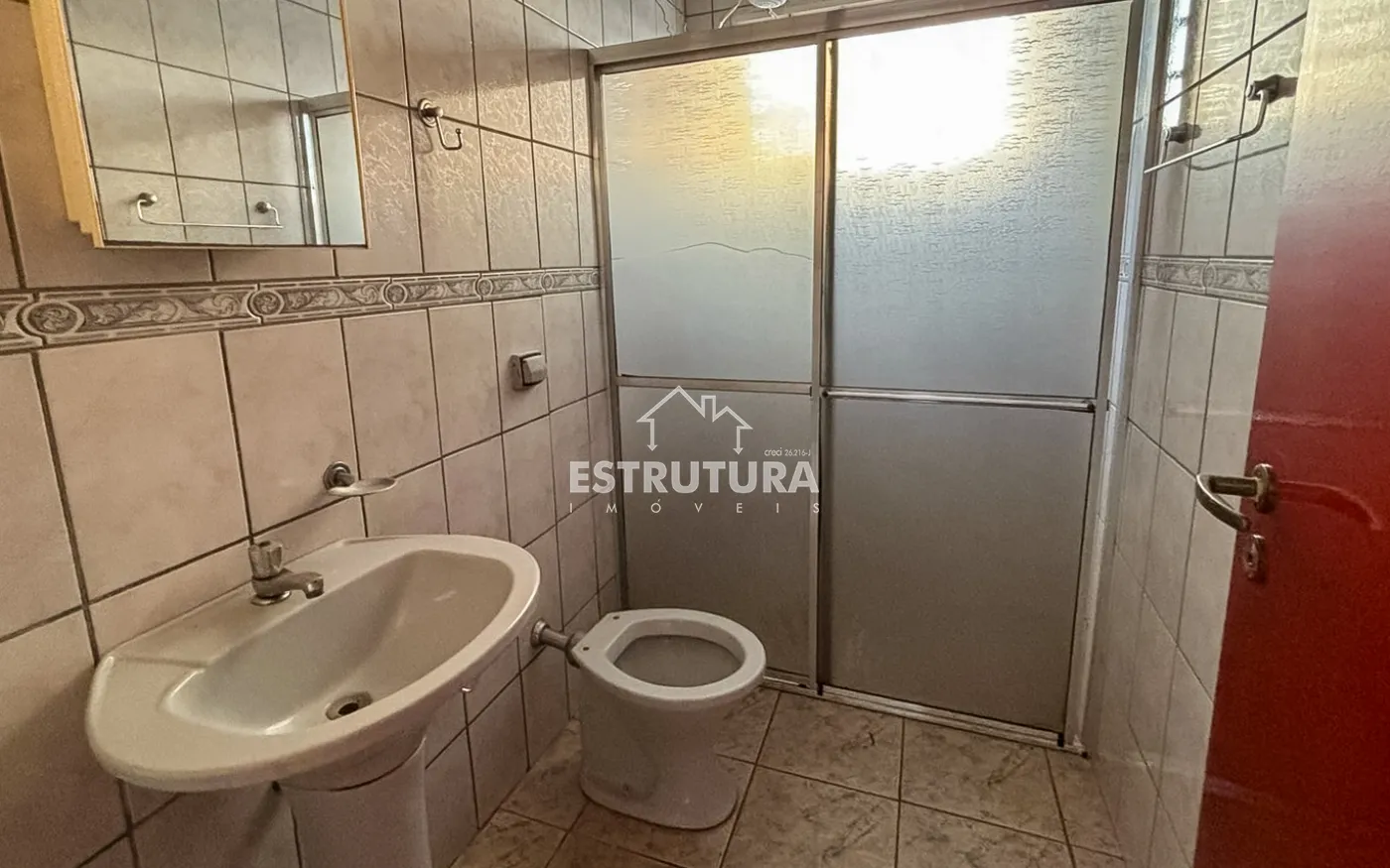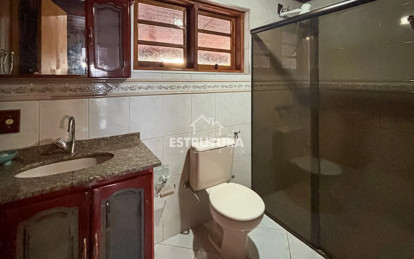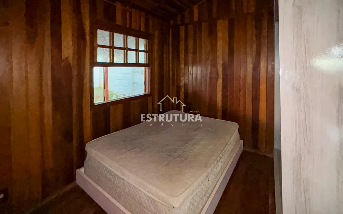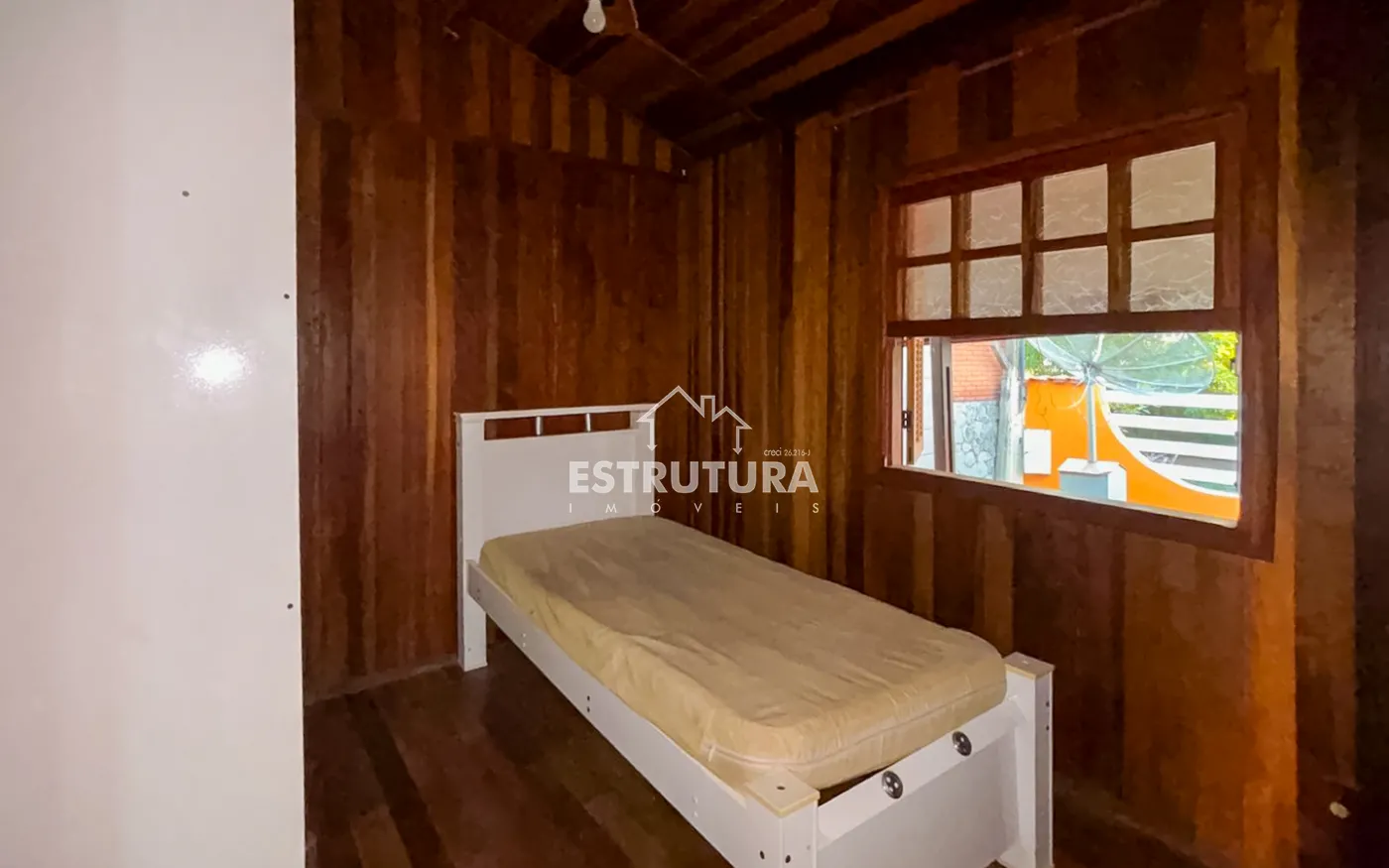 Casa de madeira, com 3 dormitórios, sala de estar, sala de TV, banheiro.