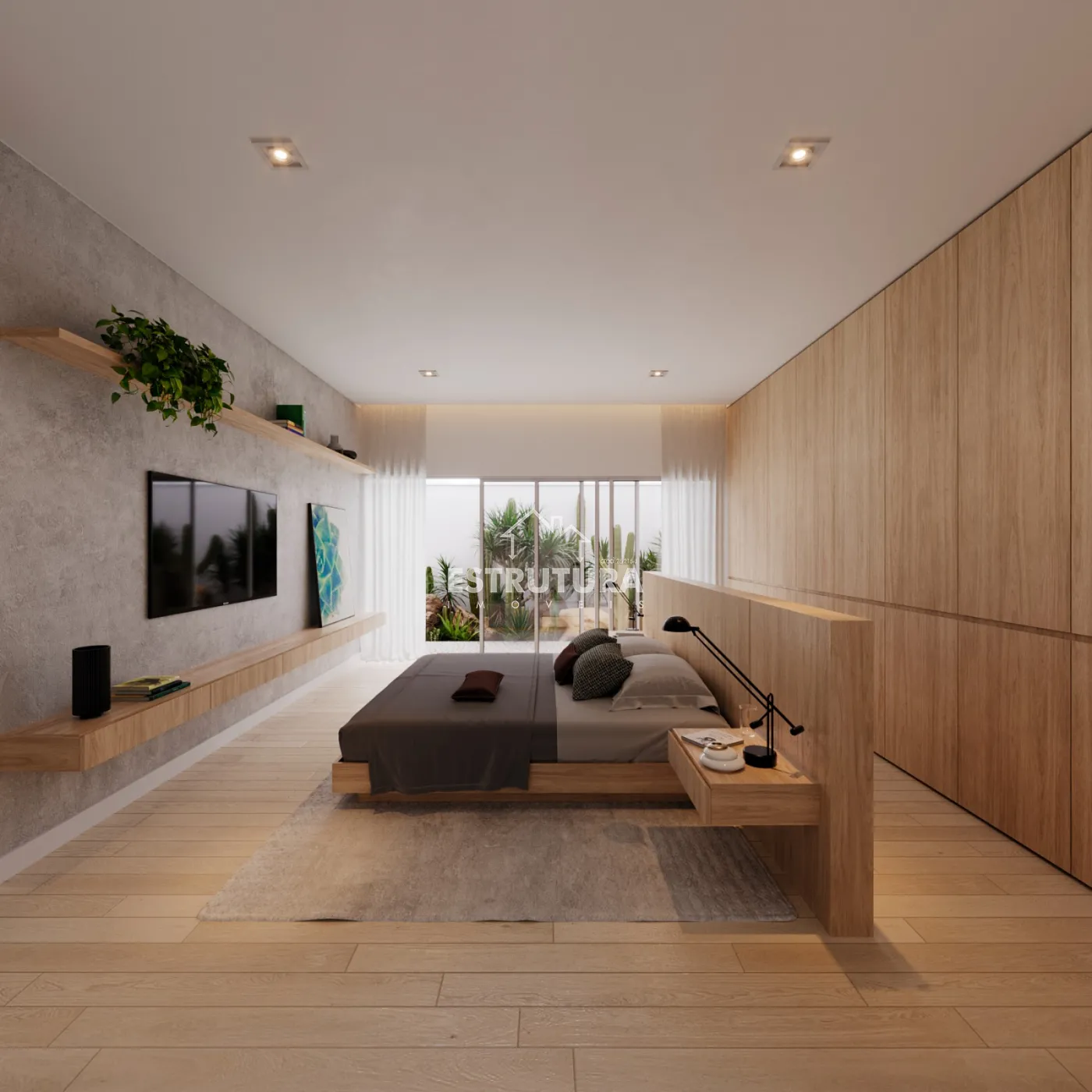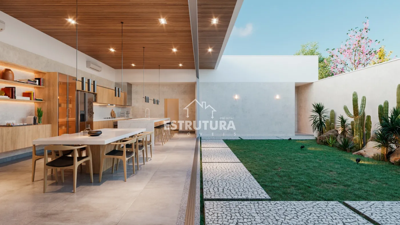 Apresentamos a Casa MEX, com Hall de entrada, 2 dormitórios, sendo 2 suítes, 1 Lavabo social, sala de Tv, Sala de jantar integrada com cozinha e área gourmet, área verde preparada para possível piscina.