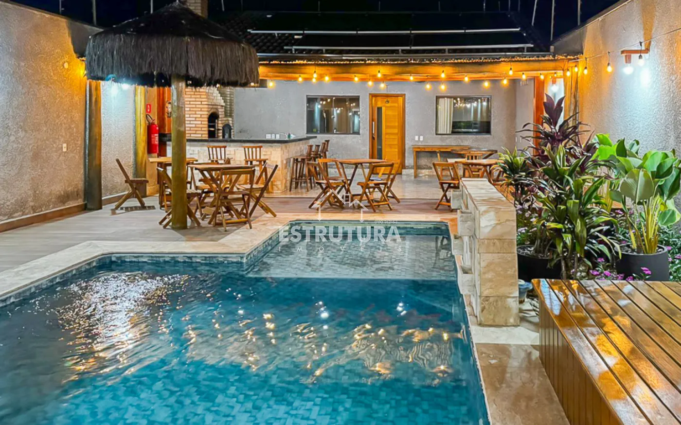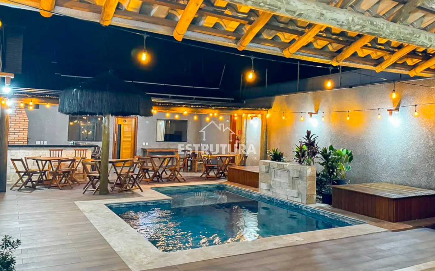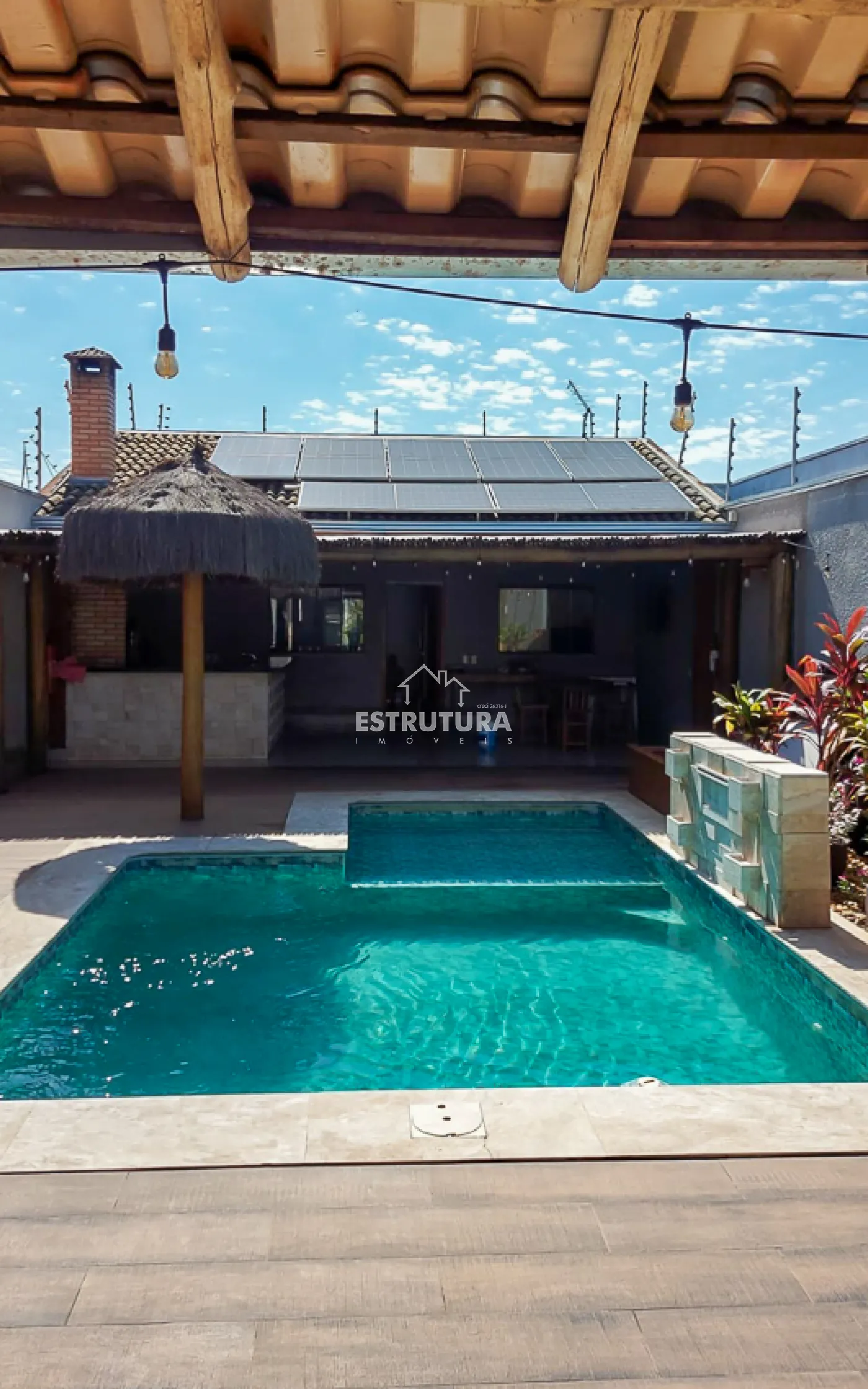 O espaço externo é perfeito para momentos de lazer, com churrasqueira equipada com forno e fogão a lenha, além de uma piscina com cascata e hidromassagem. Toda a propriedade conta com sistema de energia solar e cerca elétrica, proporcionando eficiência e segurança.