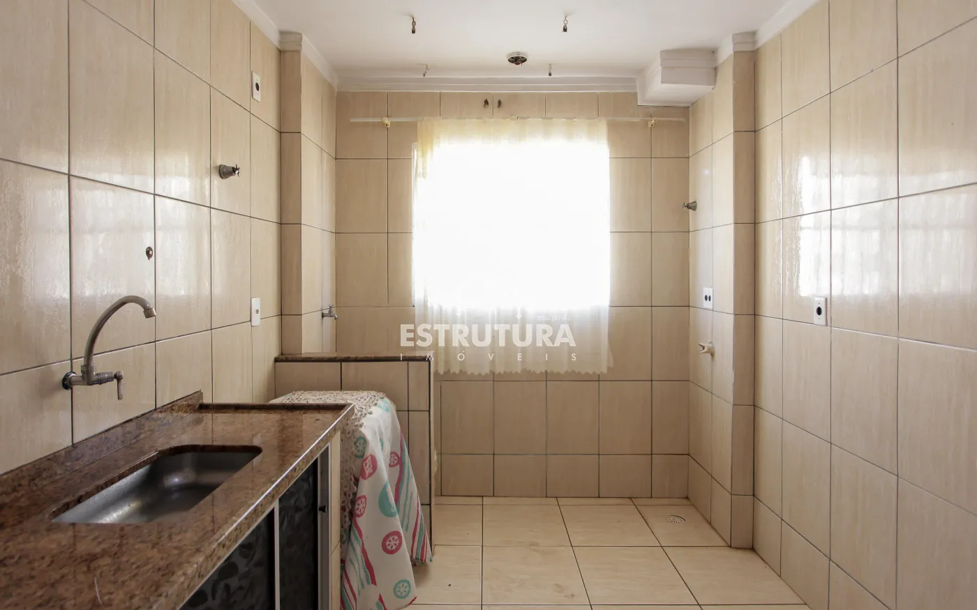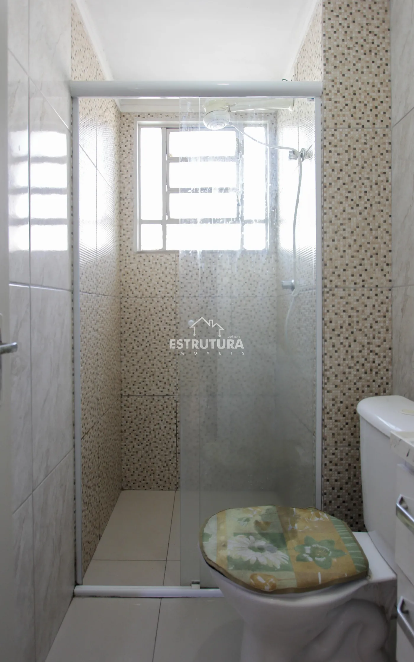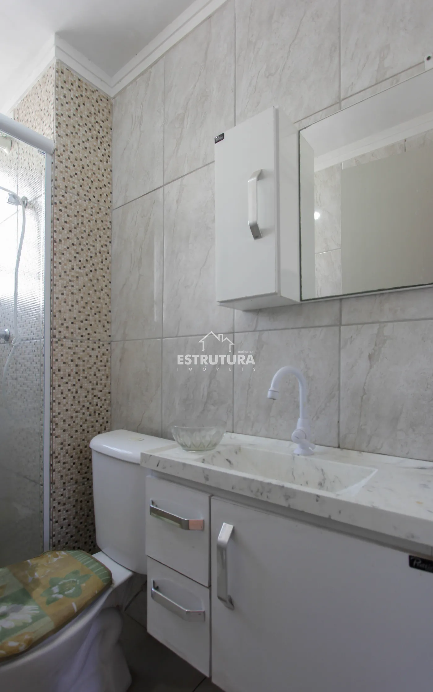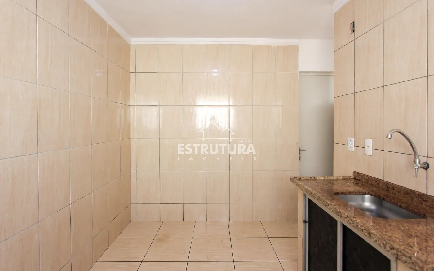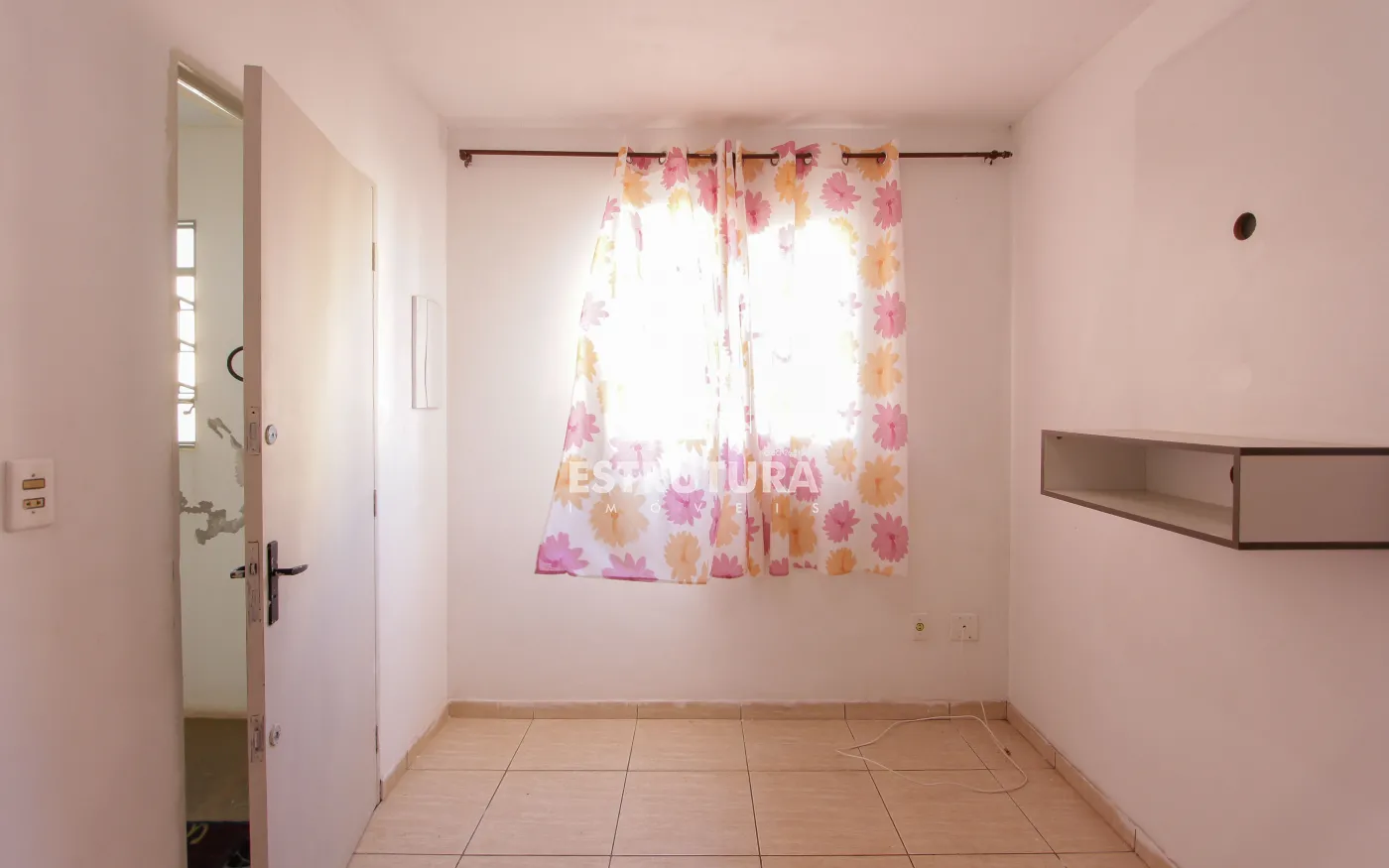 Apartamento no segundo andar, com dois quartos, banheiro social com box e gabinete, sala e cozinha com armário embaixo da pia.