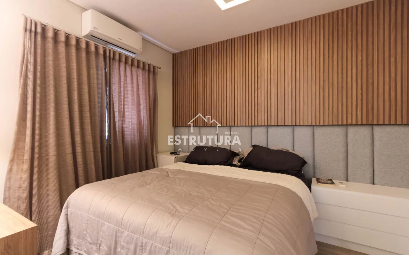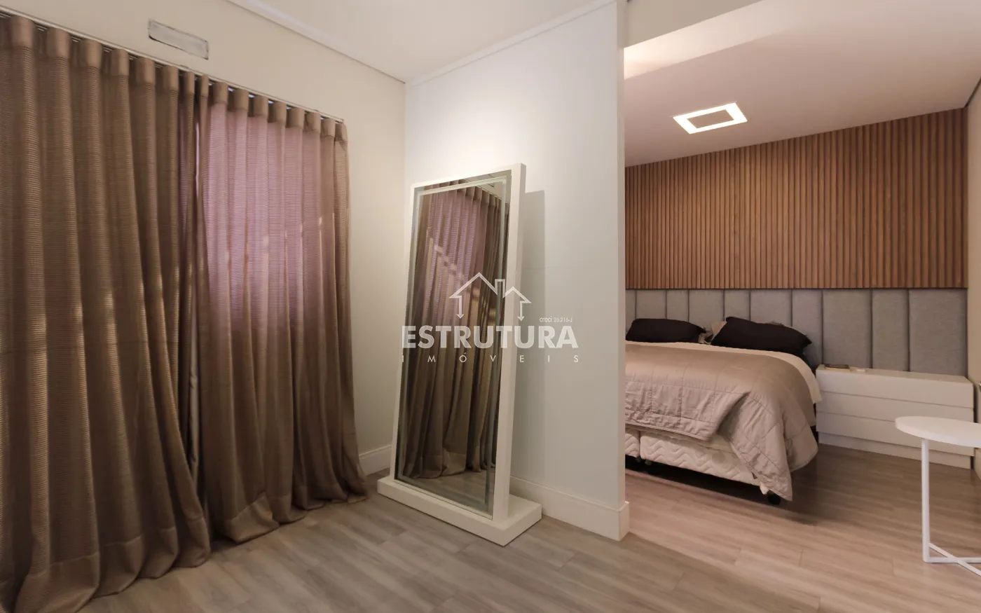 Suíte master ampla, com closet, cama, cabeceira, cortinas e iluminação acolhedora, tornando um ambiente confortável e sofisticado;