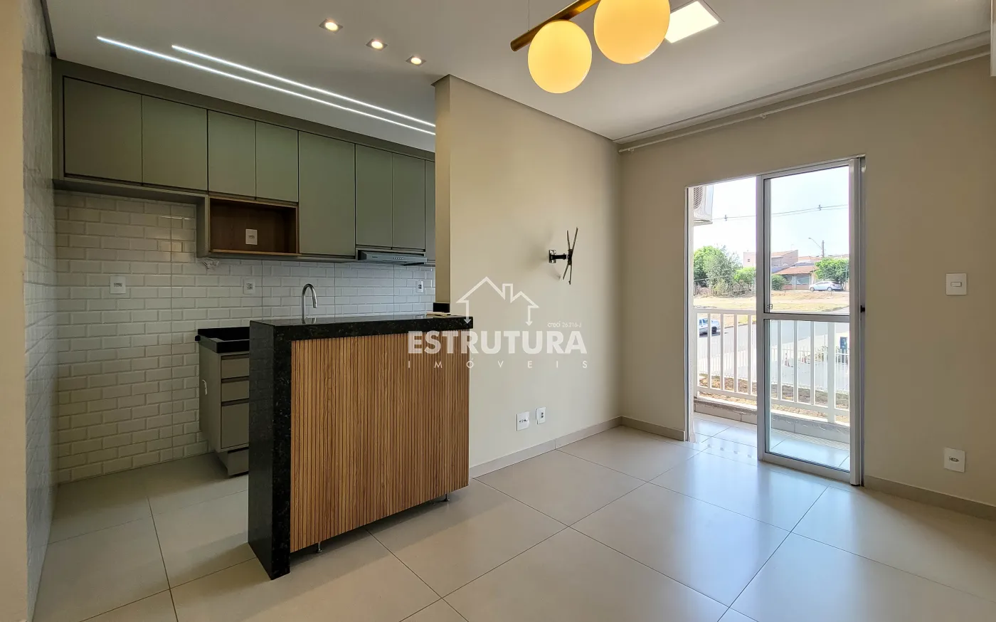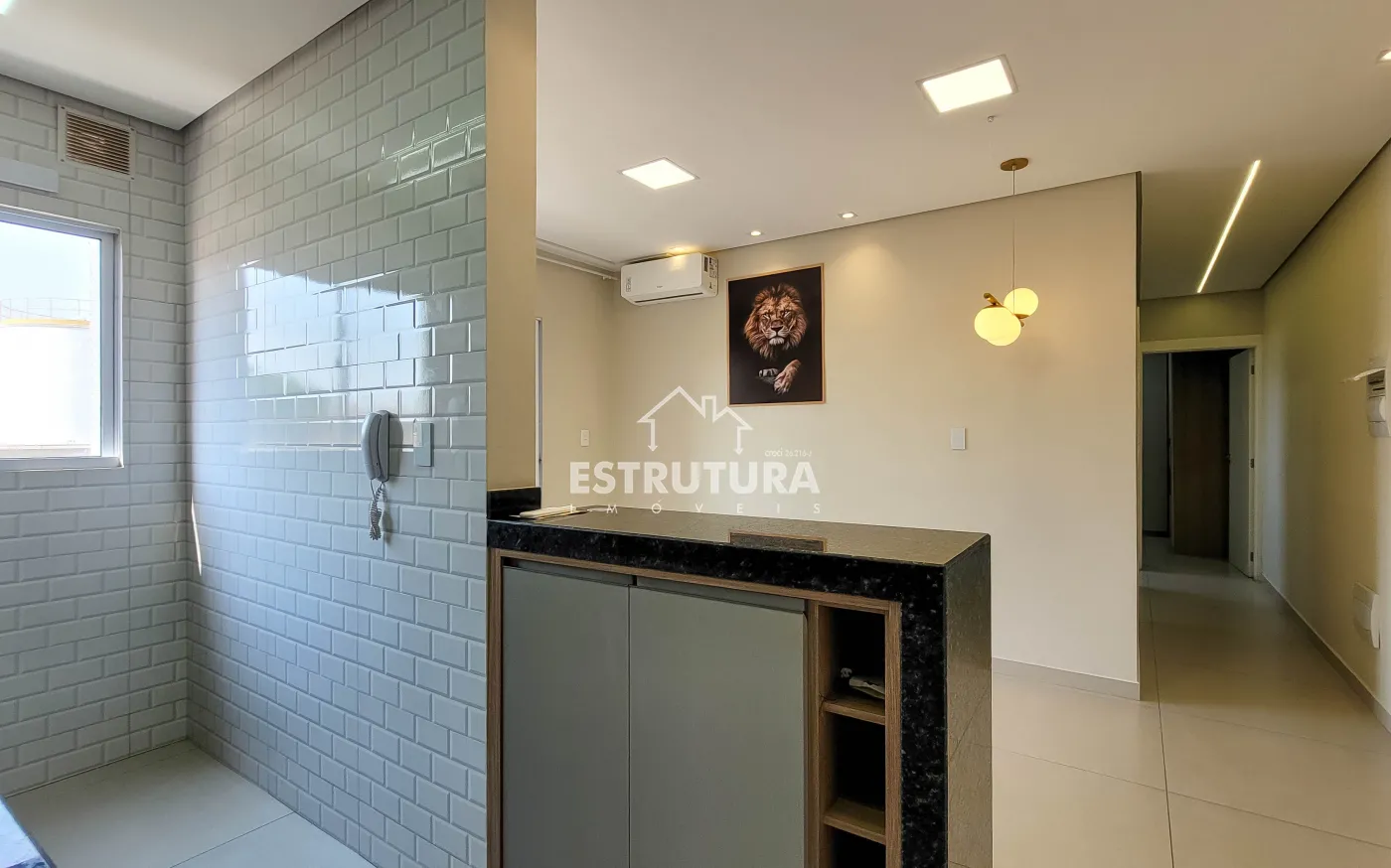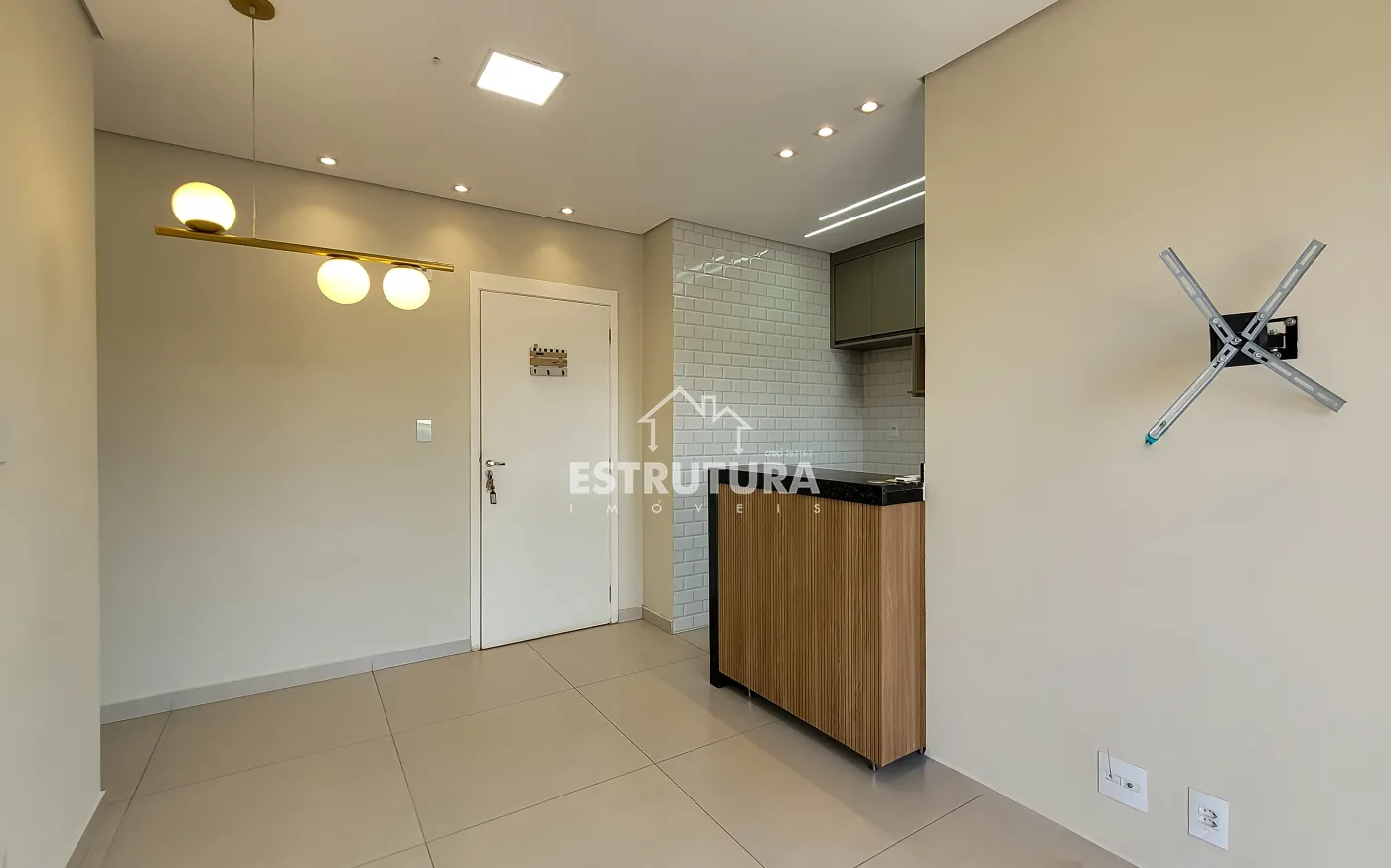 Conta com cozinha americana, sala de TV e jantar integradas, banheiro social e 2 dormitórios. Possui planejados novos na cozinha, um dormitório e banheiro, além de teto rebaixado em gesso.