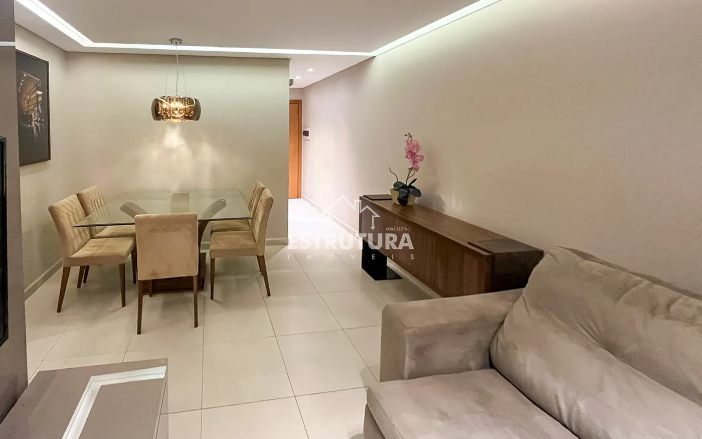 Apartamento planejado no Condomínio Torres Di Napoli! Com três quartos, sendo uma suíte, sala de jantar e estar, banheiro social, cozinha com área de serviço integrada, varanda gourmet com churrasqueira e vidros blindex e duas vagas de garagem cobertas. Este imóvel vem completo com móveis planejados, ar condicionado.