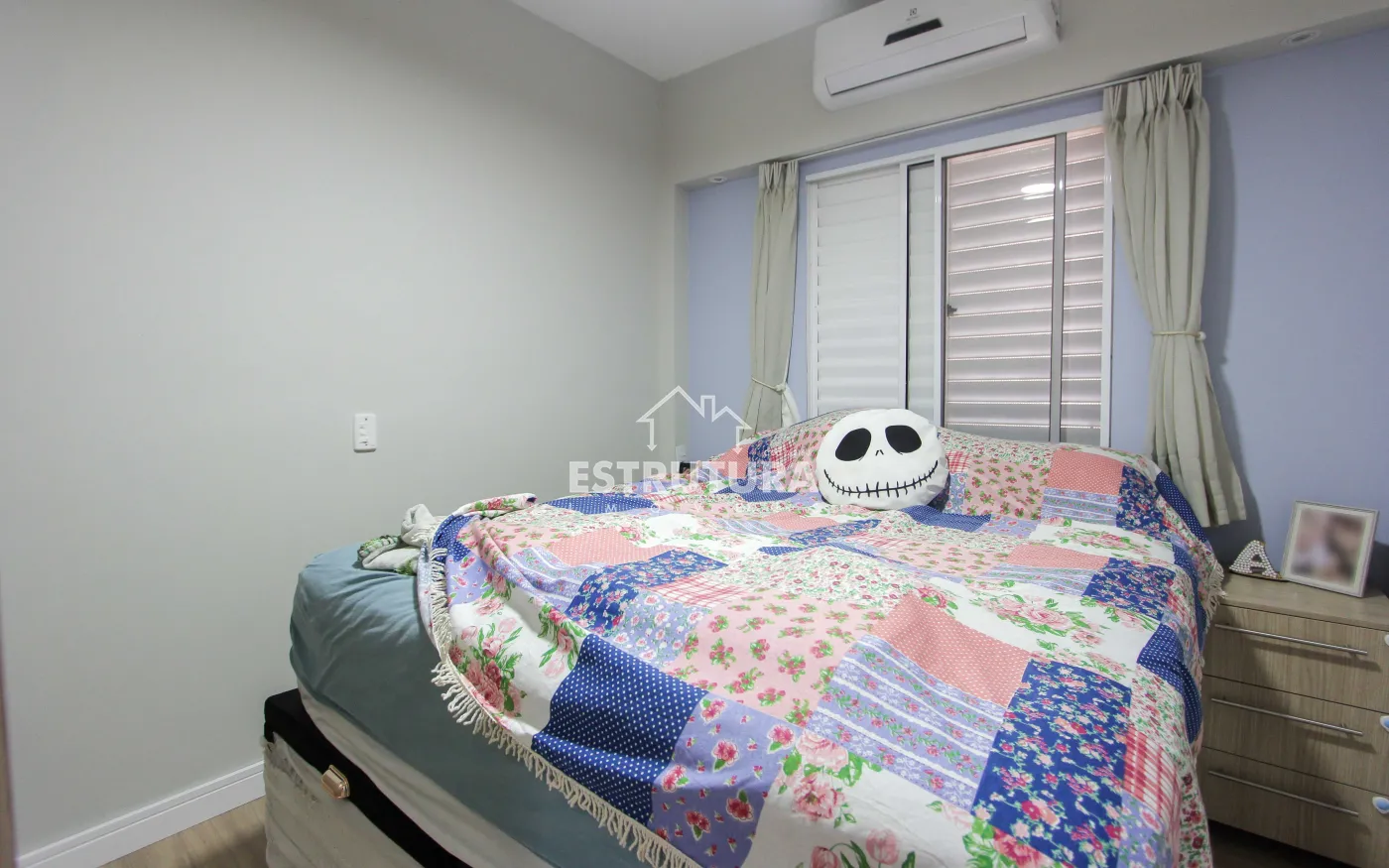 Garagem para 1 carro descoberto, sala de estar e jantar integrada com ventilador de teto, sacada, 2 dormitórios com planejados e ventilador de teto, cozinha e área de serviço com planejados