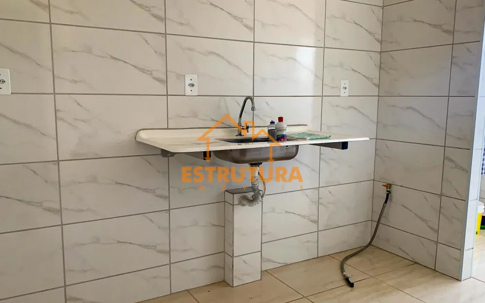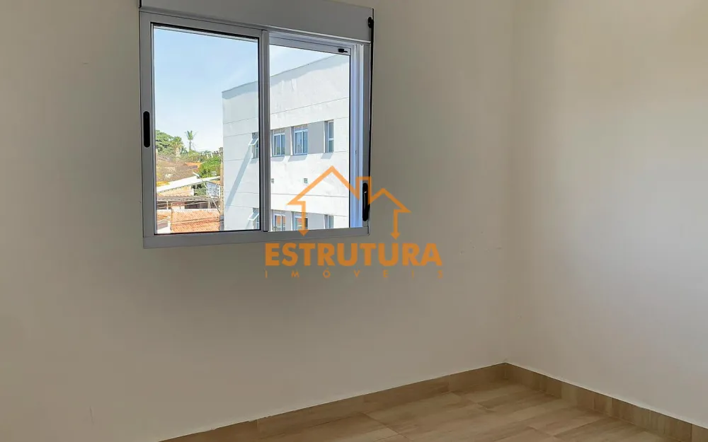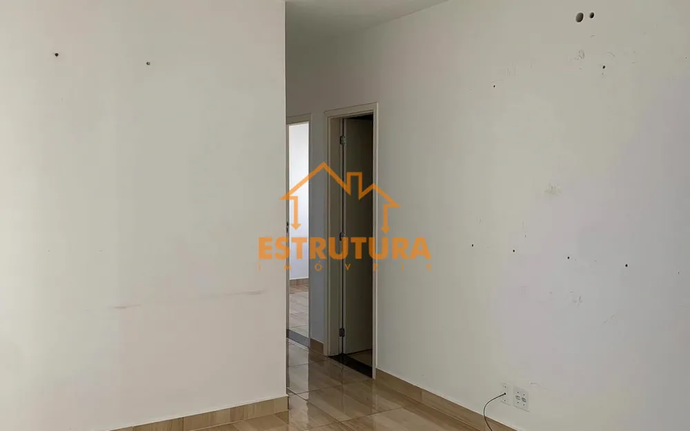 Apartamento possui sala, cozinha, 2 quartos e 1 banheiro com box.