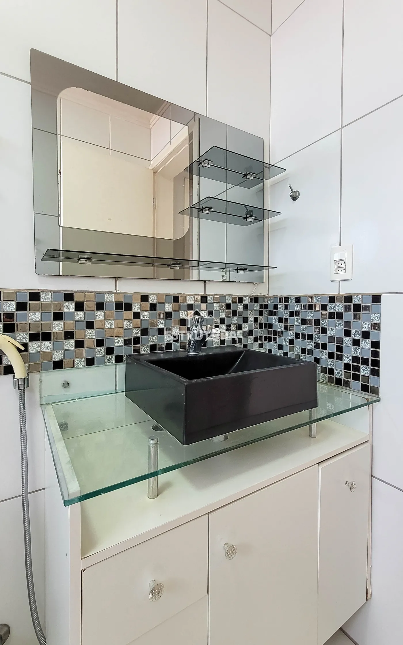 Apartamento possui sala de estar estendida com painel planejado, ar-condicionado e sacada, cozinha com armários planejados e coifa, banheiro social, 2 dormitórios, área de serviço com armário.