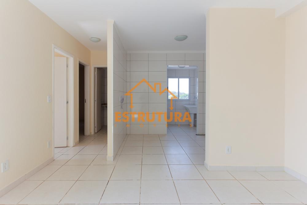 Apartamento contendo vaga para 1 carro, sala de jantar e tv integradas, cozinha, área de serviço, 2 dormitórios sendo 1 suíte e W.C. social.