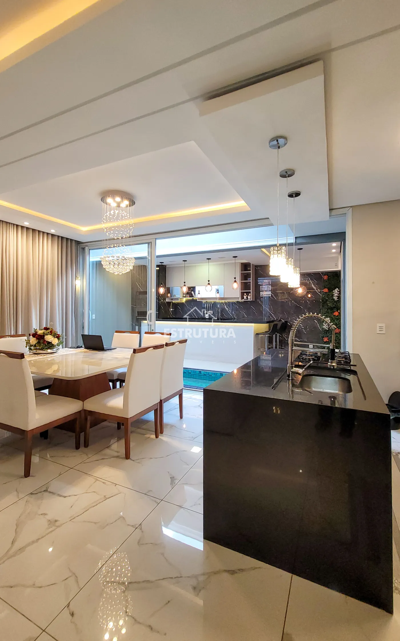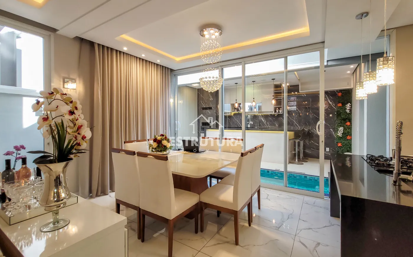 No piso térreo, o espaço aberto integrado entre as áreas de estar, jantar e cozinha cria um ambiente perfeito para receber amigos e familiares. A área externa, com piscina e churrasqueira planejada, oferece momentos de lazer e descontração, agregando ainda mais conforto à sua experiência.
