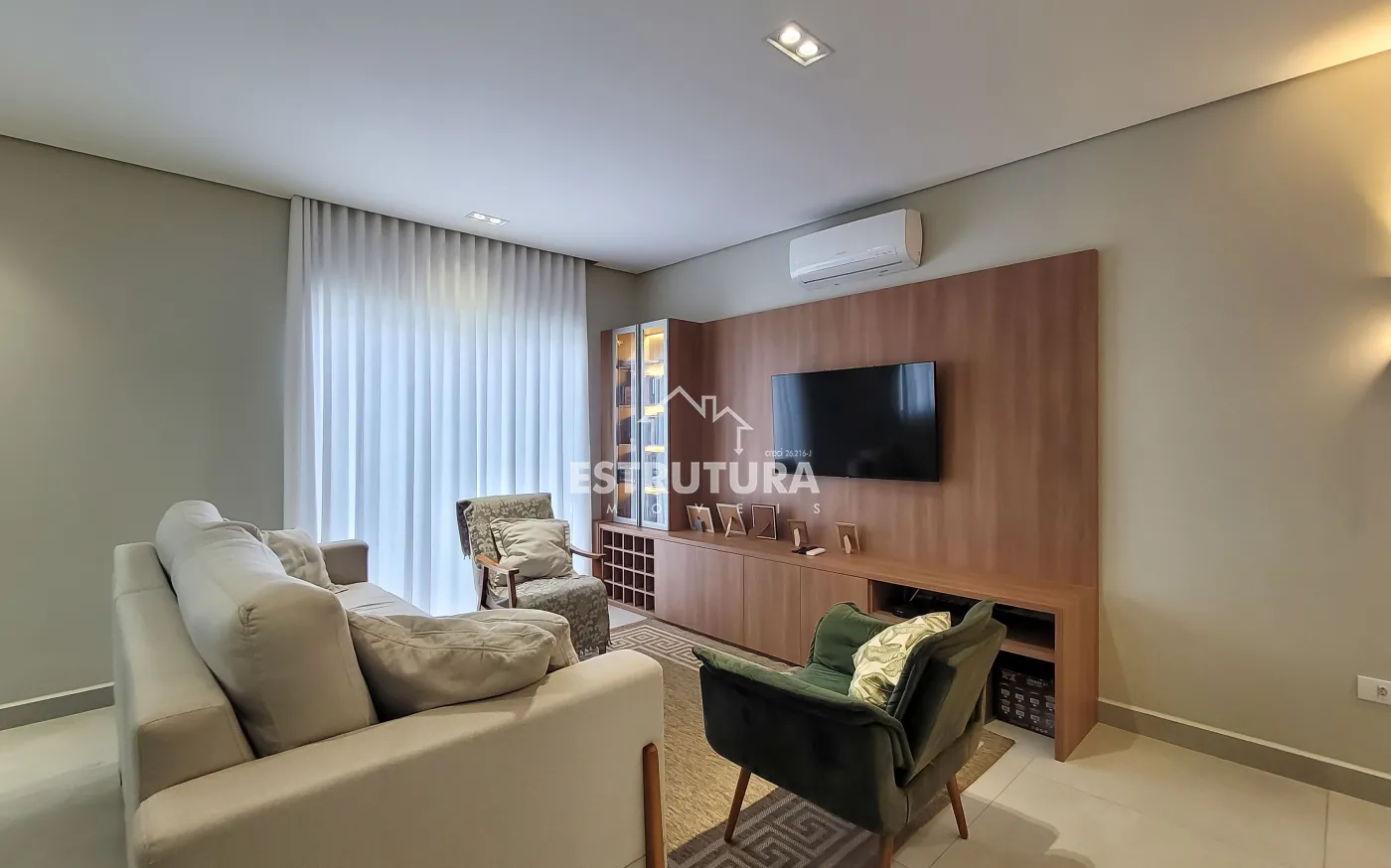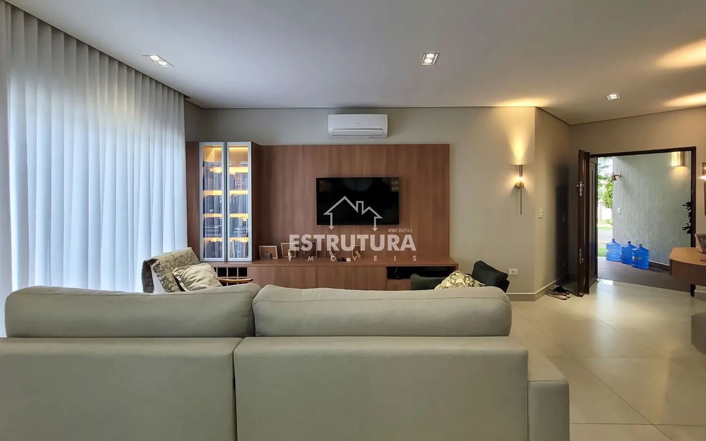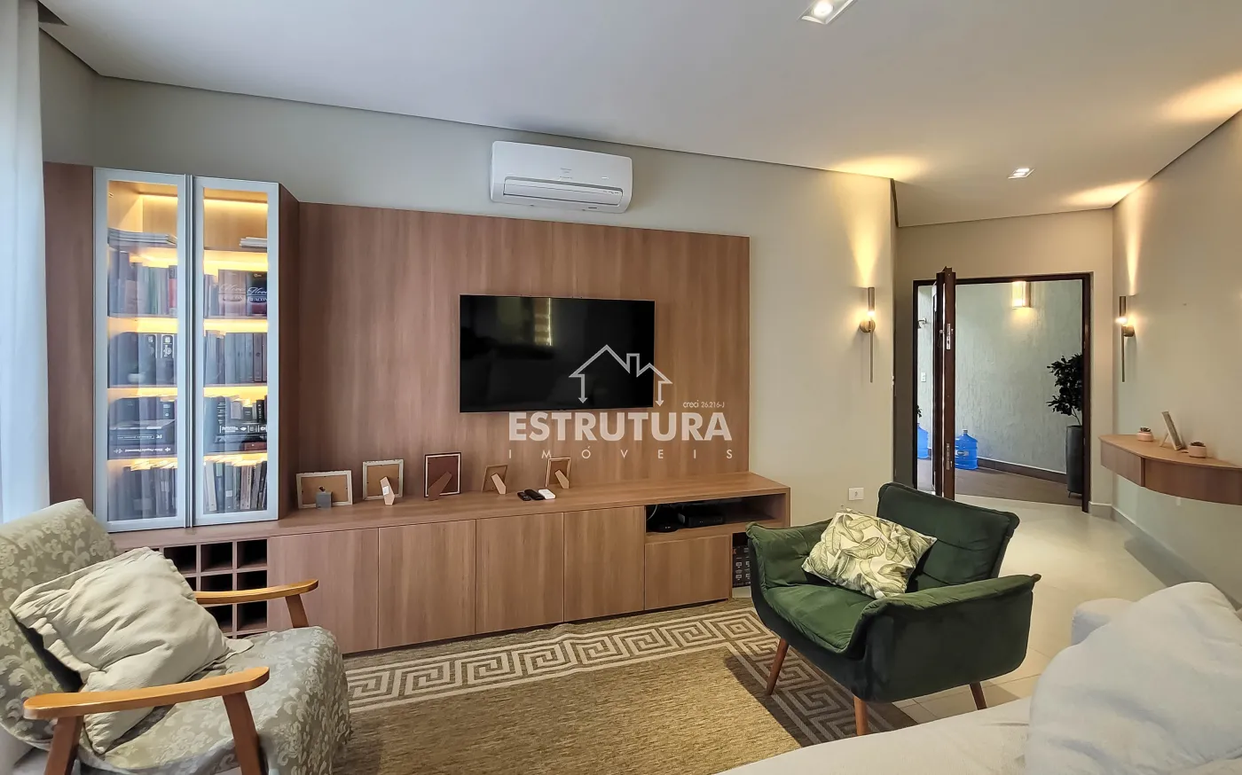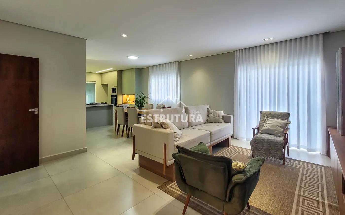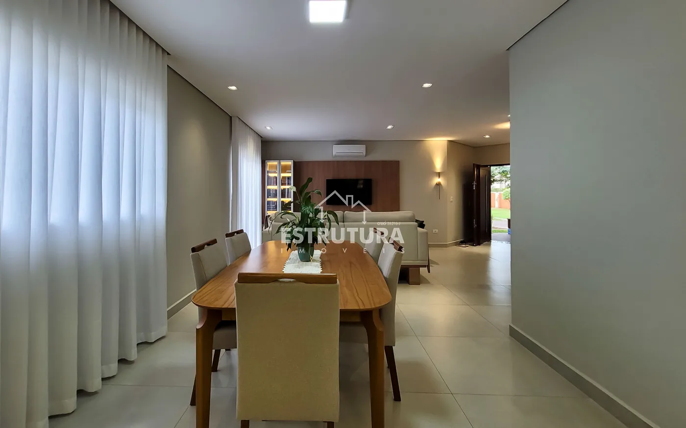 Ampla sala integrada com 3 ambientes (estar, jantar e TV)