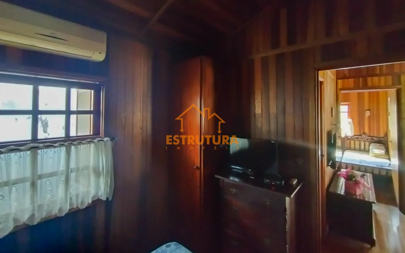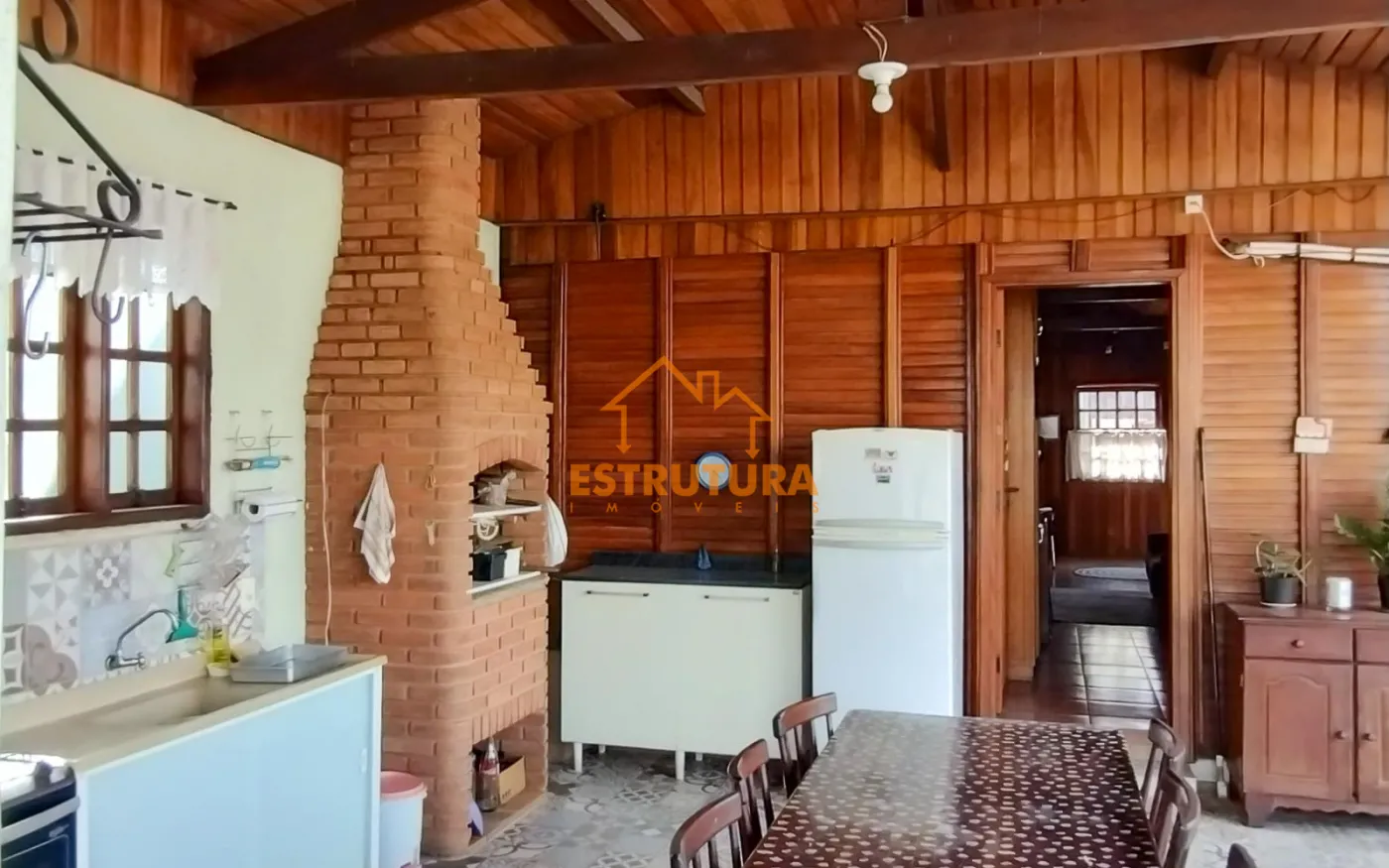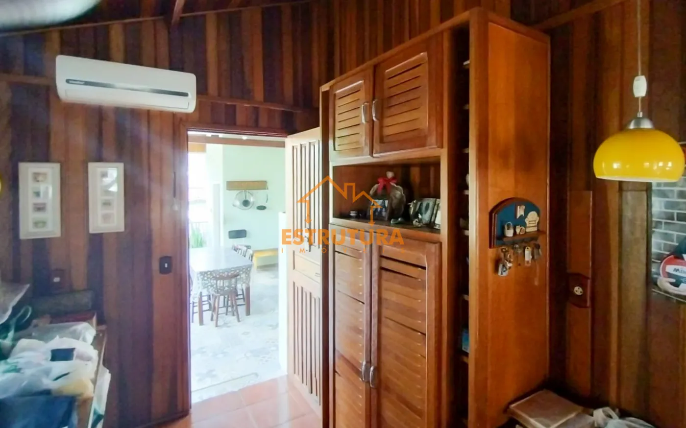 Garagem descoberta para 2 carros, casa de madeira com 2 dormitórios com armários embutidos e ar condicionado, hall de entrada, sala ampla cozinha com sala de jantar e balcão americano, ampla área gourmet, lavanderia com banheiro, piscina aterrada, quintal, canil e quarto de despejo com rancho