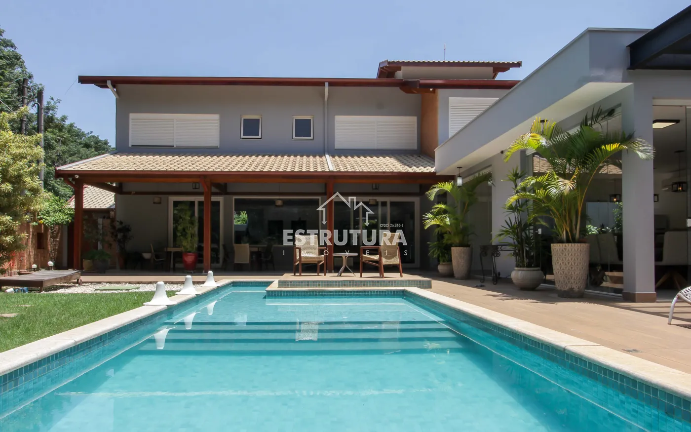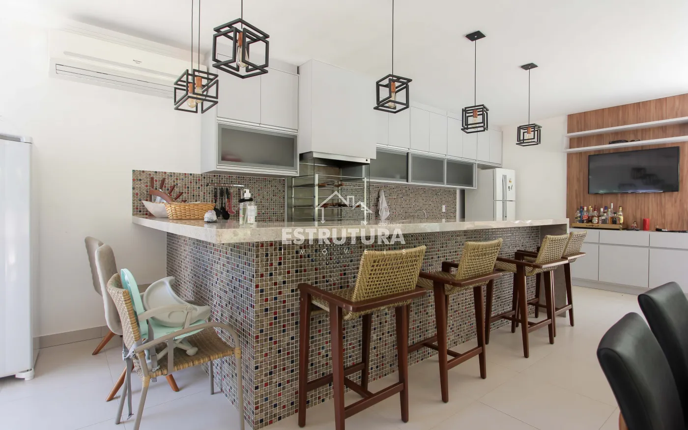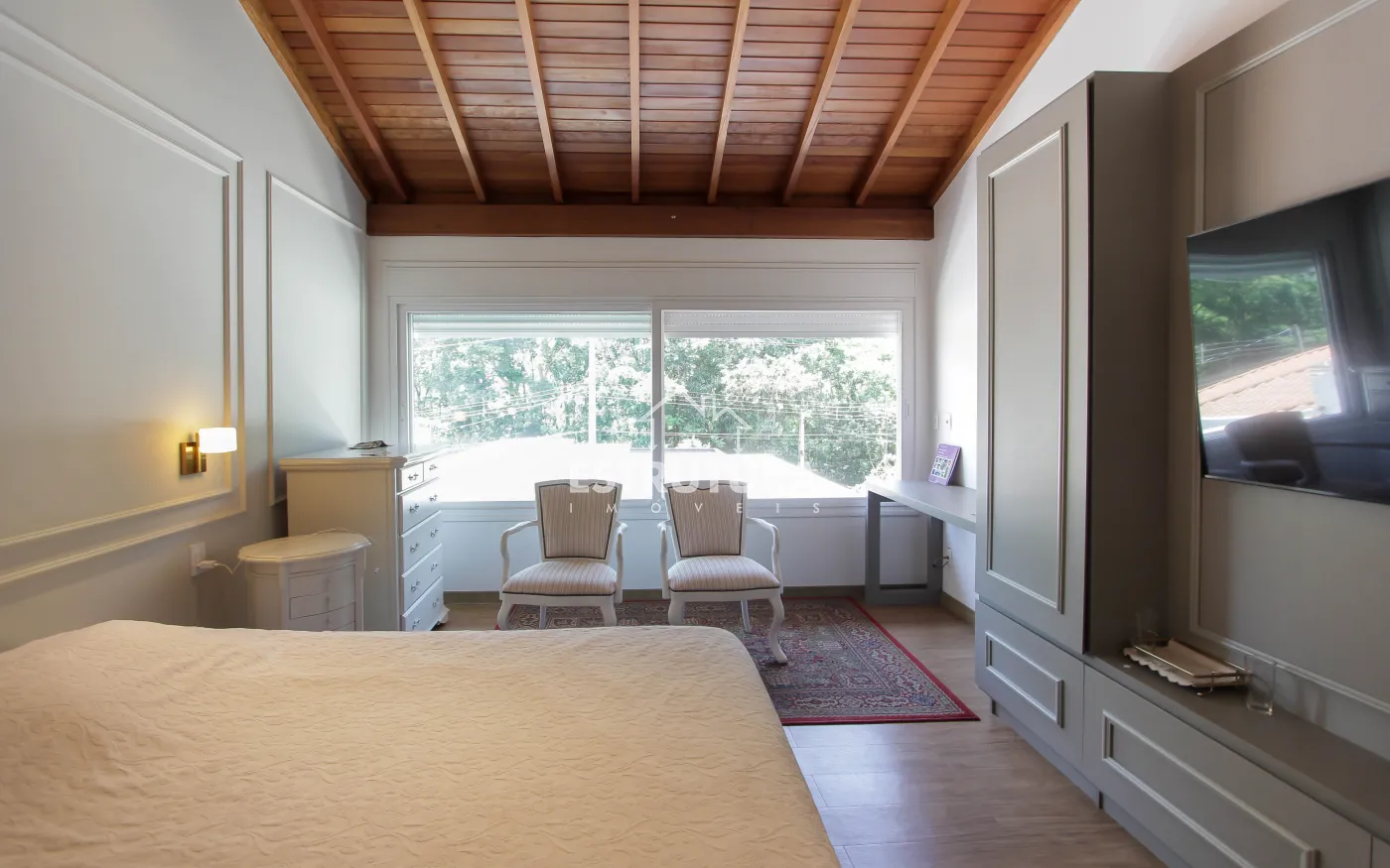 A área de lazer é um verdadeiro refúgio, com piscina, hidromassagem, deck, varanda, pergolado e rancho, proporcionando um espaço perfeito para relaxar e receber amigos e familiares. Além disso, a residência conta com um banheiro adicional, uma adega subterrânea para os apreciadores de vinhos, uma sala de estar com TV e uma suíte master, além de três suítes adicionais, todas com móveis planejados, garantindo o máximo de conforto e organização.