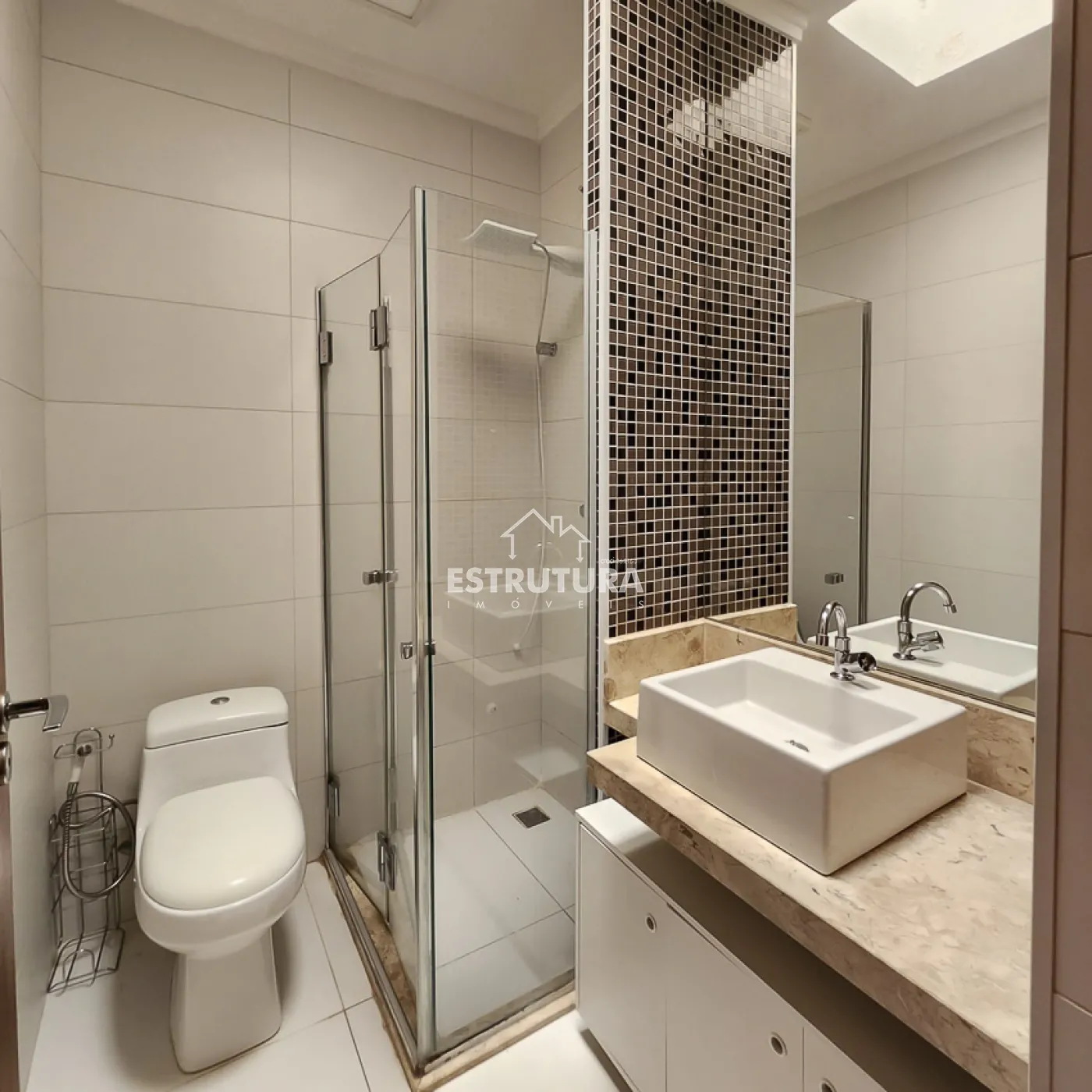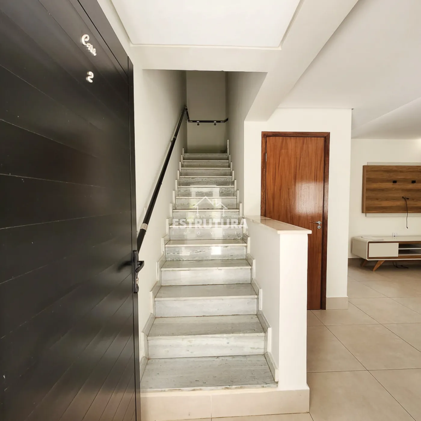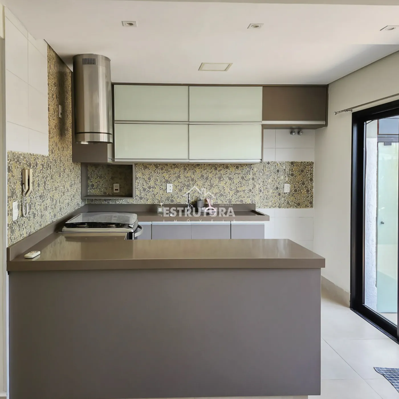 Este imóvel conta com uma sala espaçosa para dois ambientes, equipada com painel e ar condicionado, além de um lavabo. A cozinha é completa, com armários planejados, coifa e fogão embutido, oferecendo praticidade e elegância no dia a dia.
