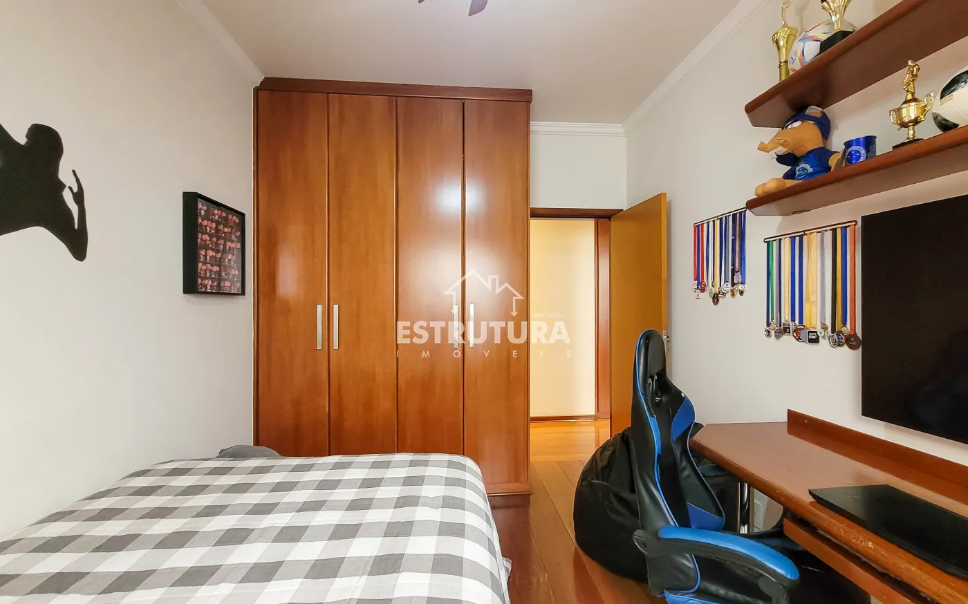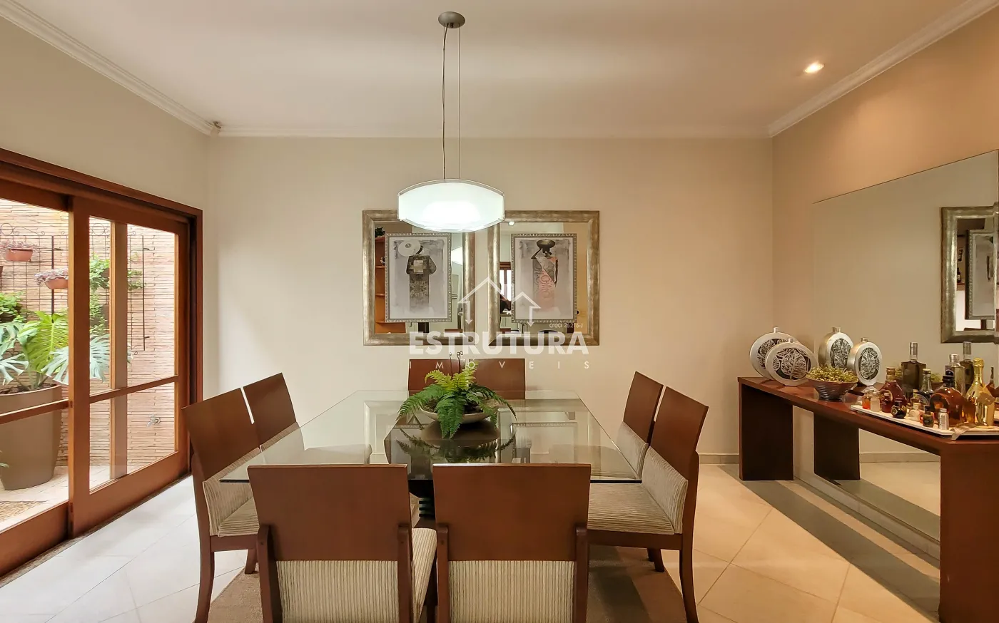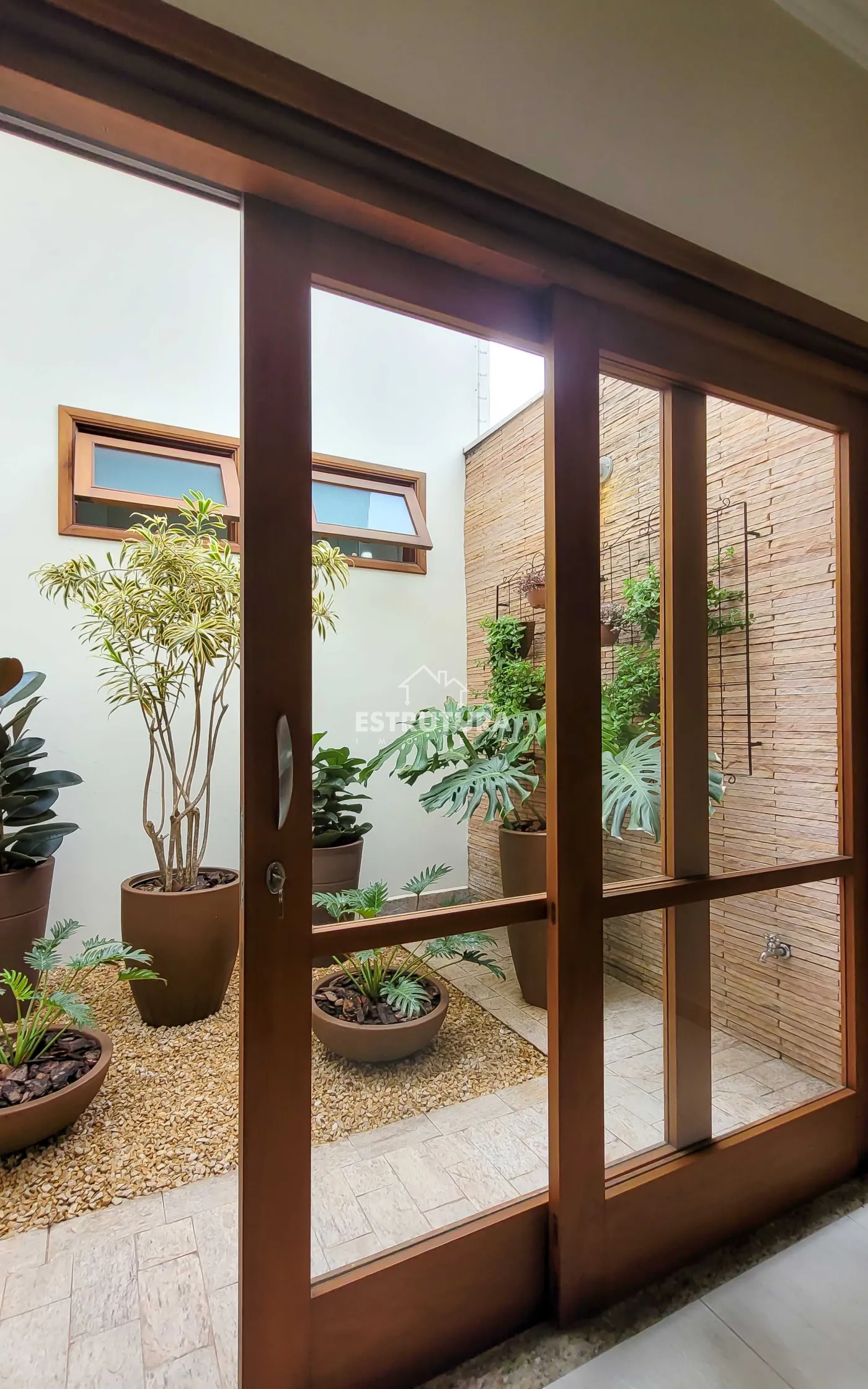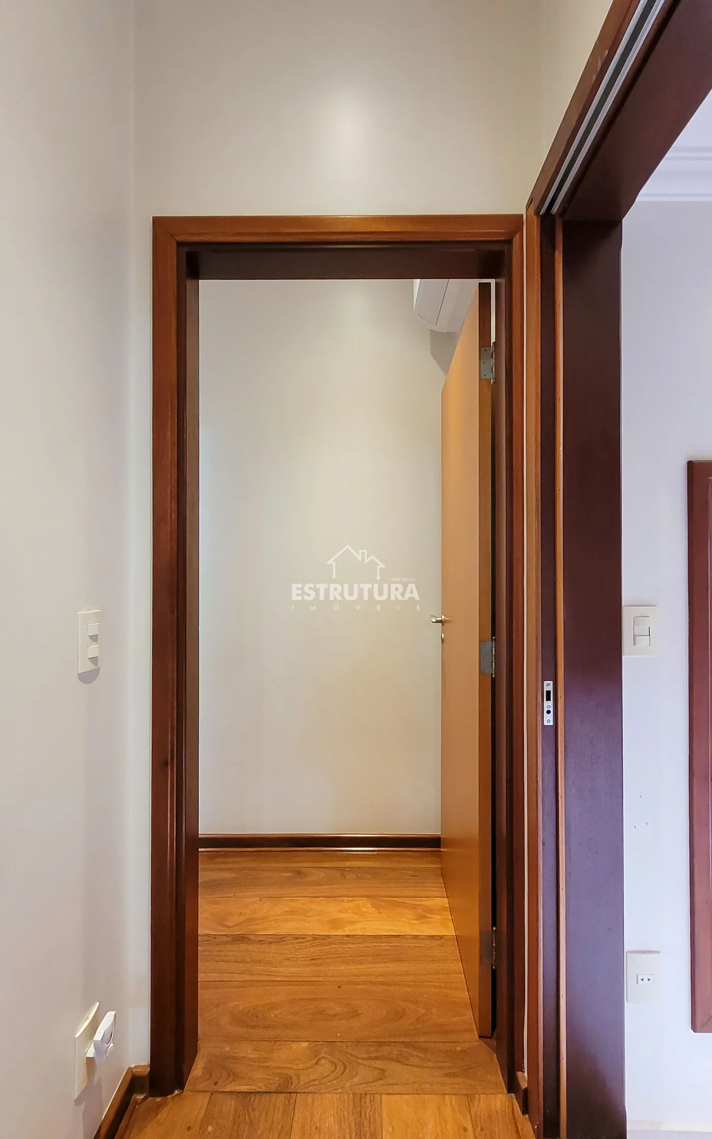 Na parte íntima, um corredor com elegante estante planejada em madeira e porta de correr conduz aos três dormitórios, todos com móveis planejados em madeira maciça, sendo uma suíte com jardim exclusivo e mobiliário completo em madeira sob medida.