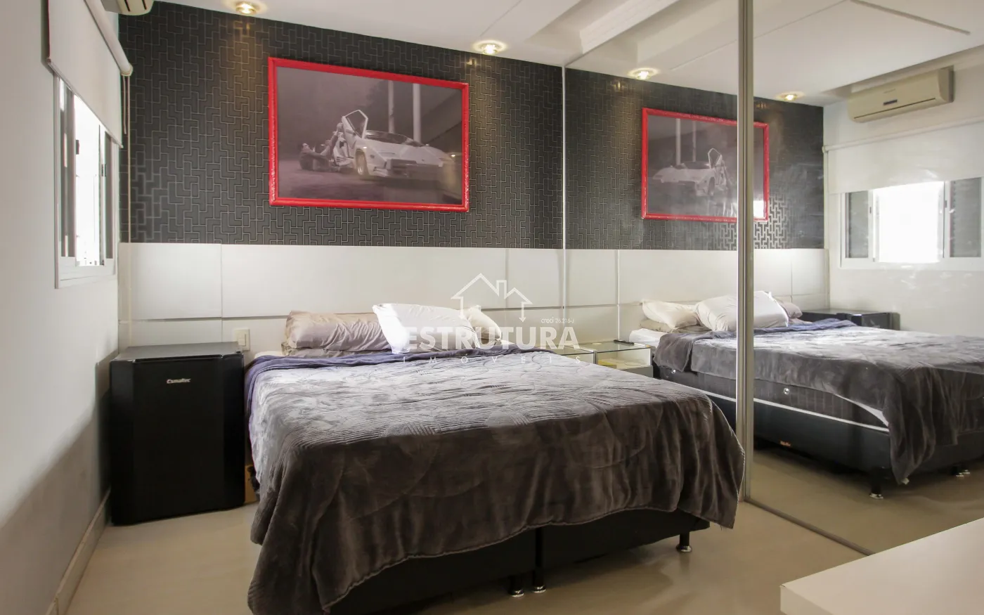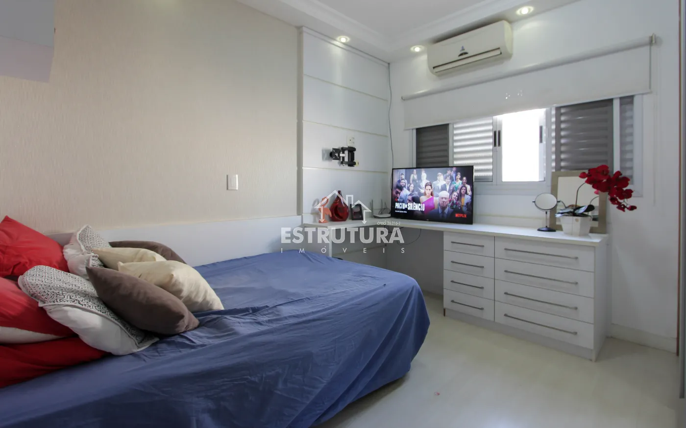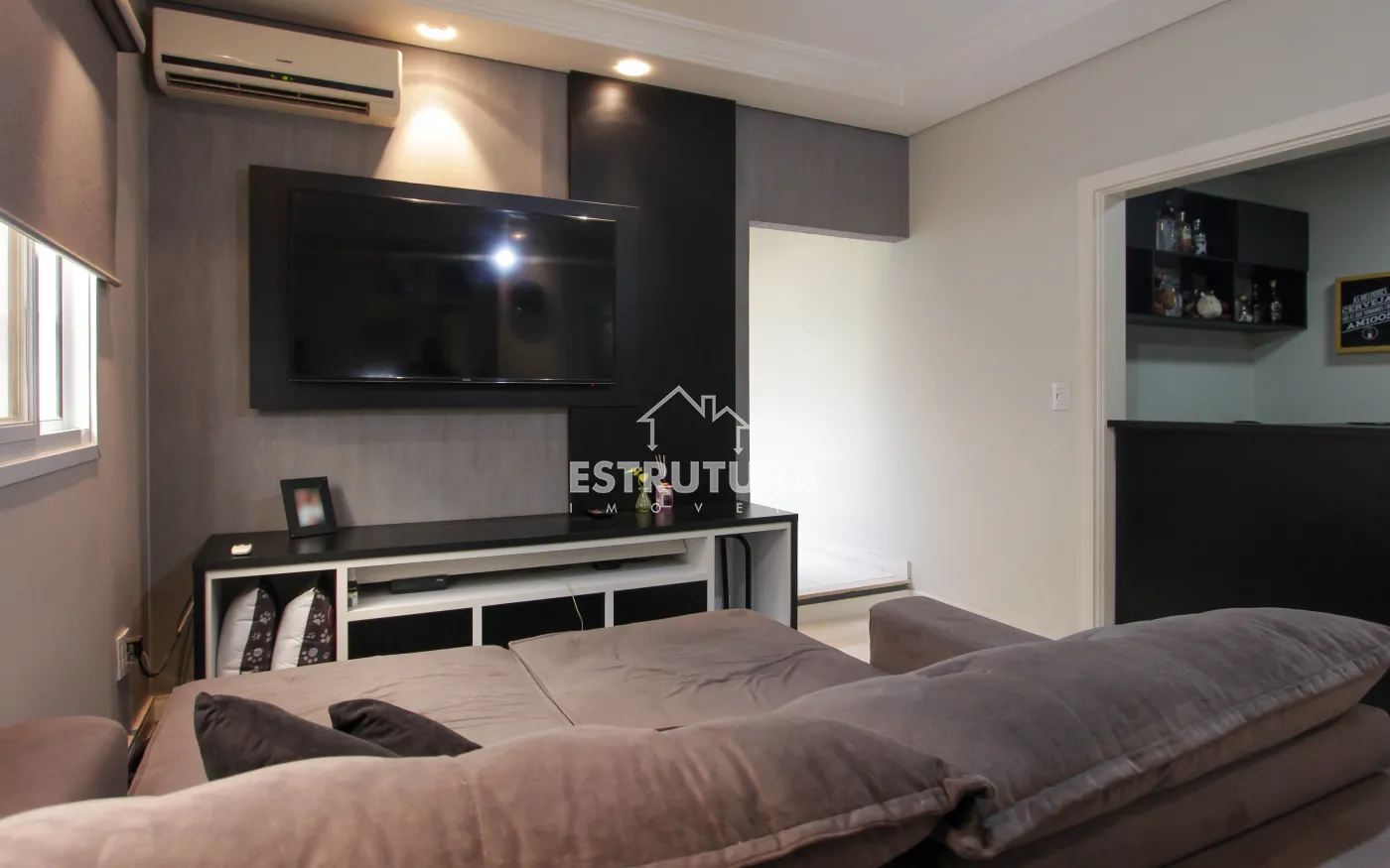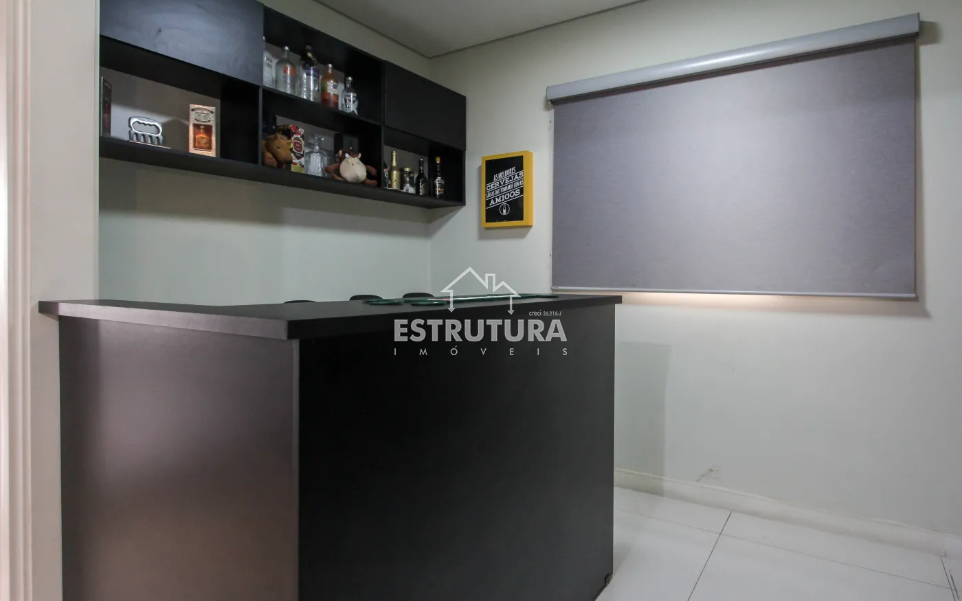 Garagem coberta para 02 carros e descoberta para 01 carro, 03 dormitórios com armários, sendo uma suíte com closet, ar-condicionado, sala de estar e jantar, sala de TV, espaço bar, área de luz, lavabo, cozinha equipada e com armários planejados, área de serviço com planejados, área externa com piscina, sauna, ducha, banheiro social e churrasqueira.