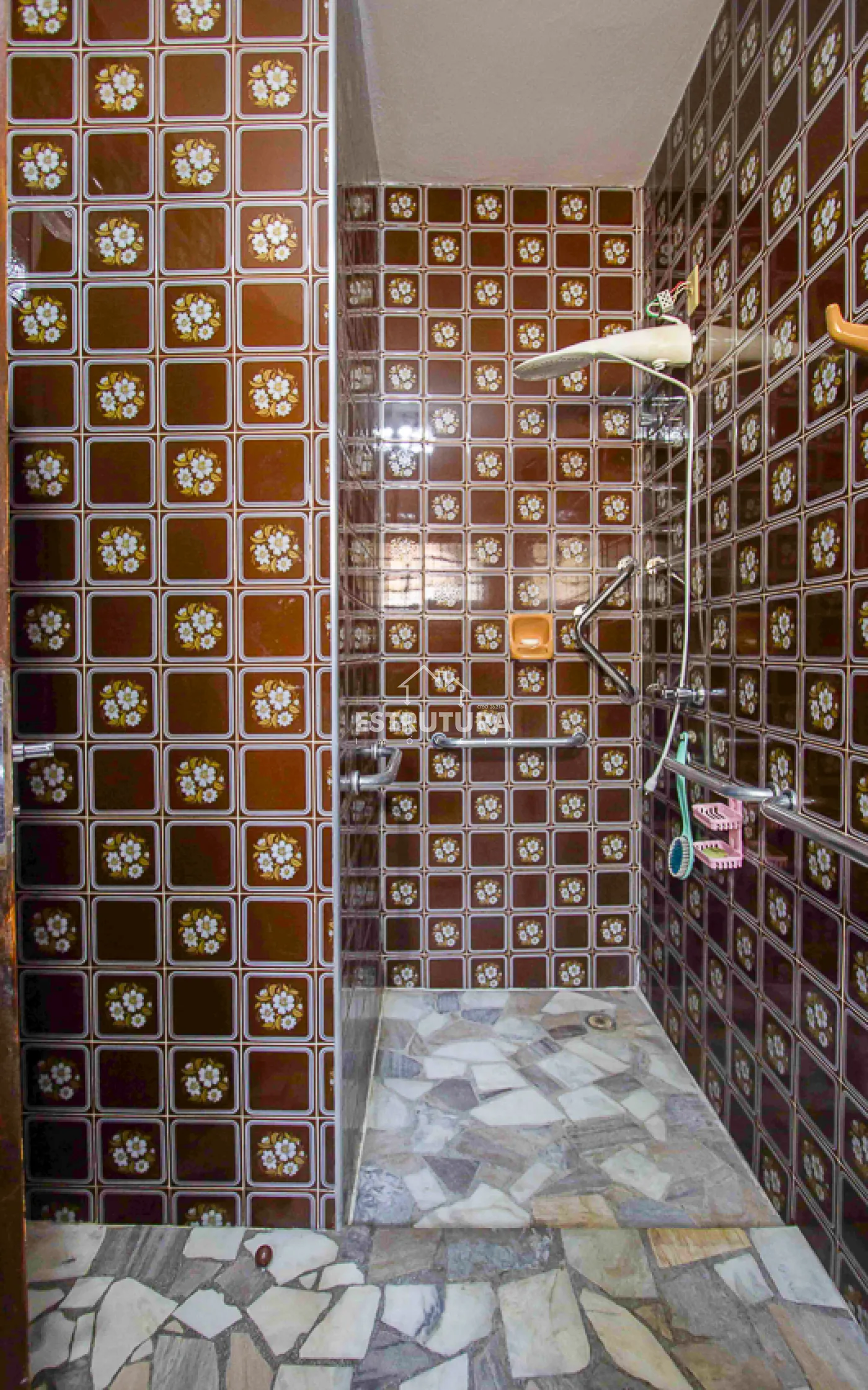 Acabamento com piso em mármore, cerâmica simples e taco de madeira, trazendo charme e personalidade ao imóvel.