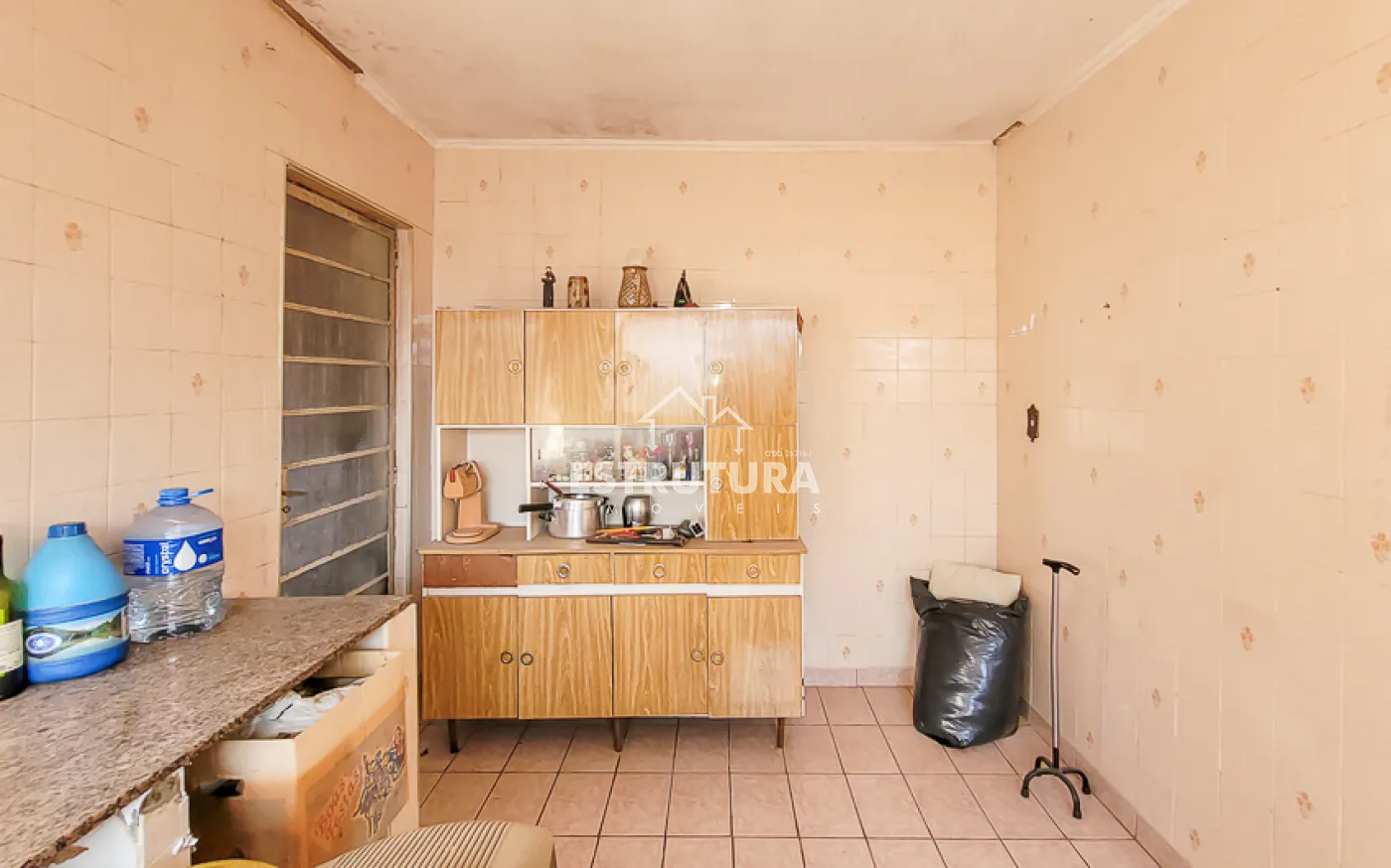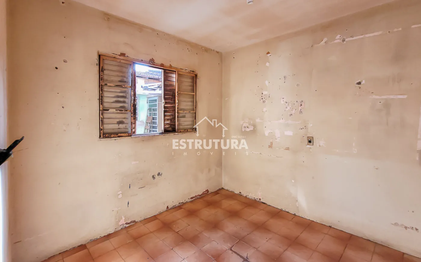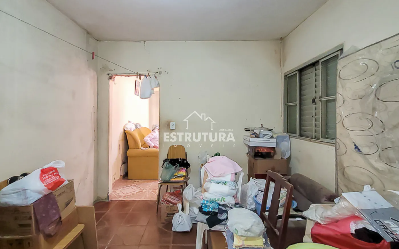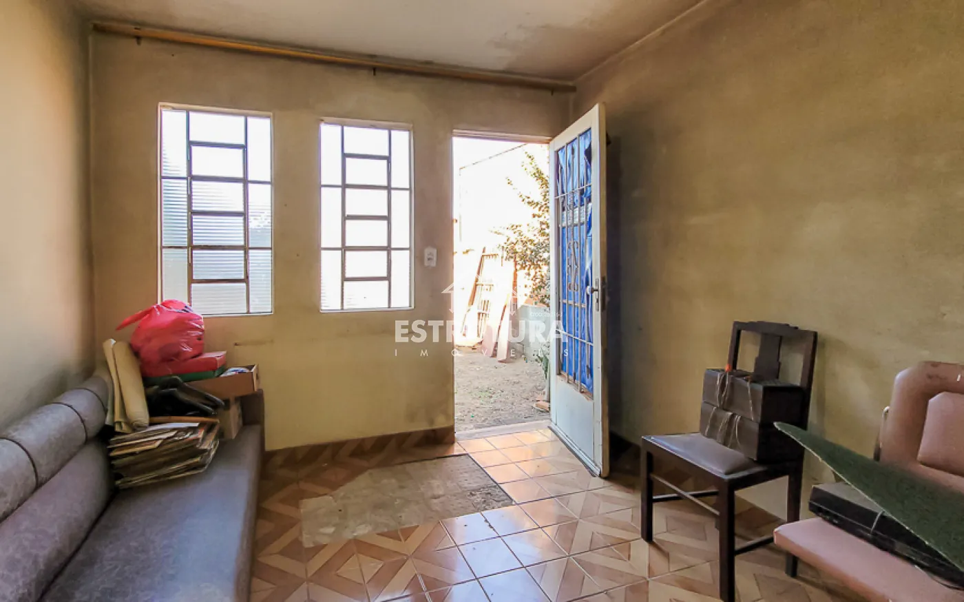 Casa com dois dormitórios, banheiro social, cozinha, sala de estar e área de serviço.
