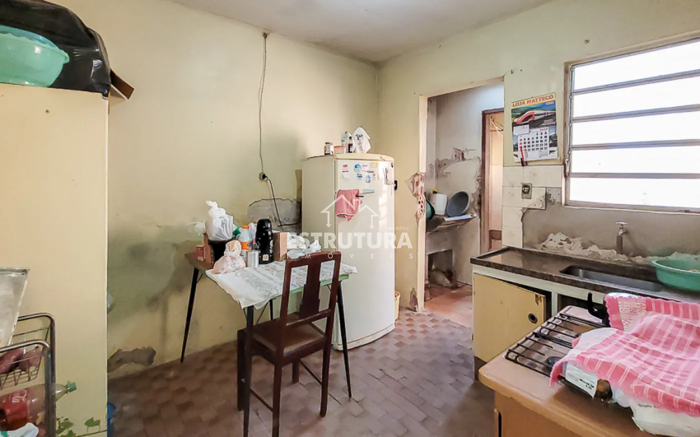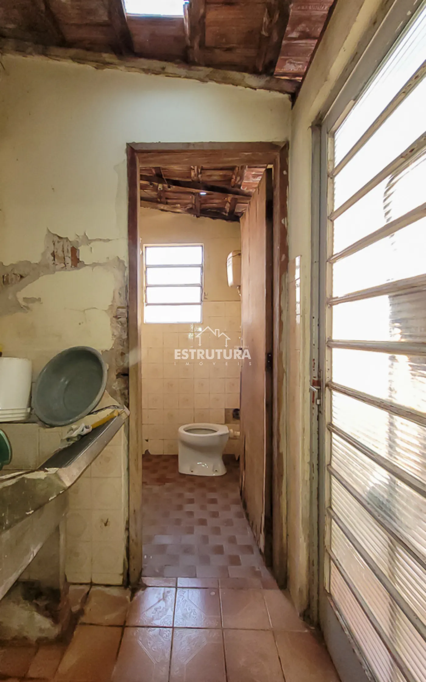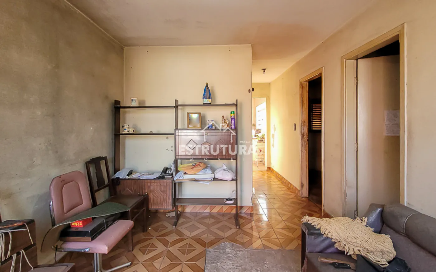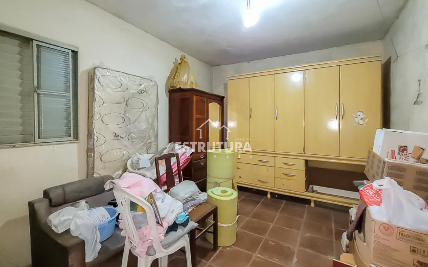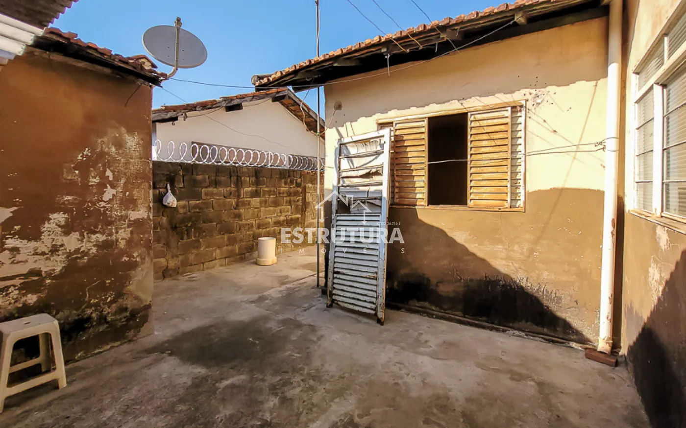 Casa com dois dormitórios, banheiro social, cozinha, sala de estar e área de serviço.