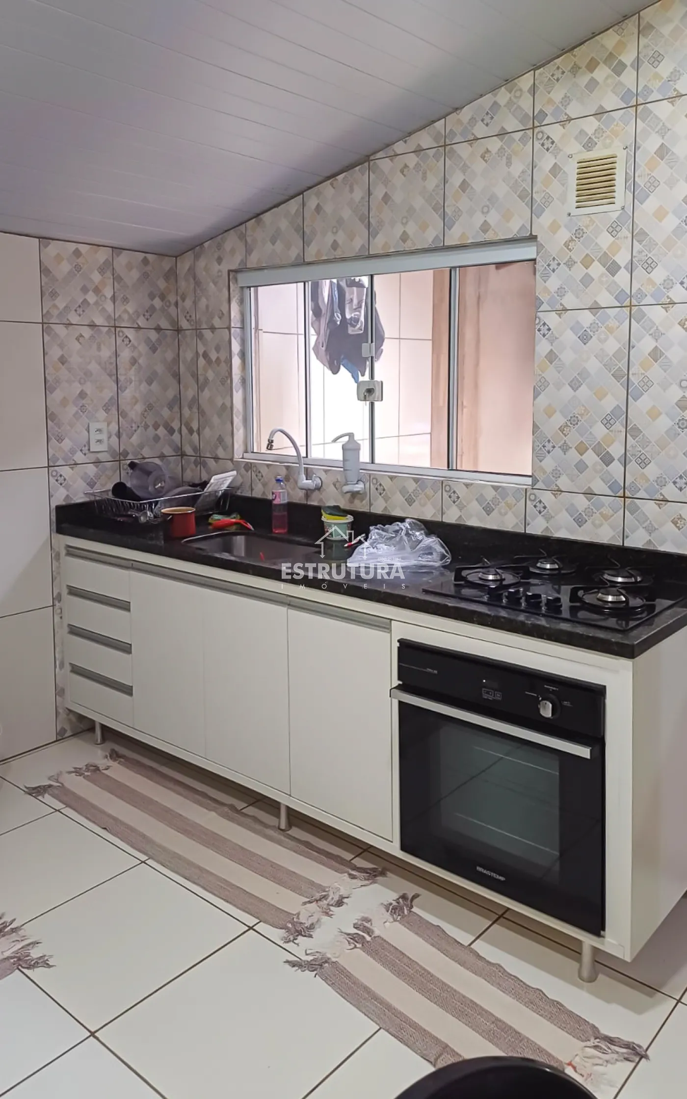 Casa recém reformada com garagem para 3 carros, 2 quartos, sala, banheiro social, cozinha com armário embutido, forno e cooktop.