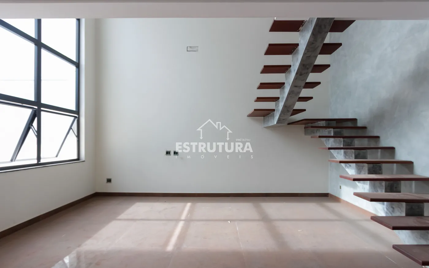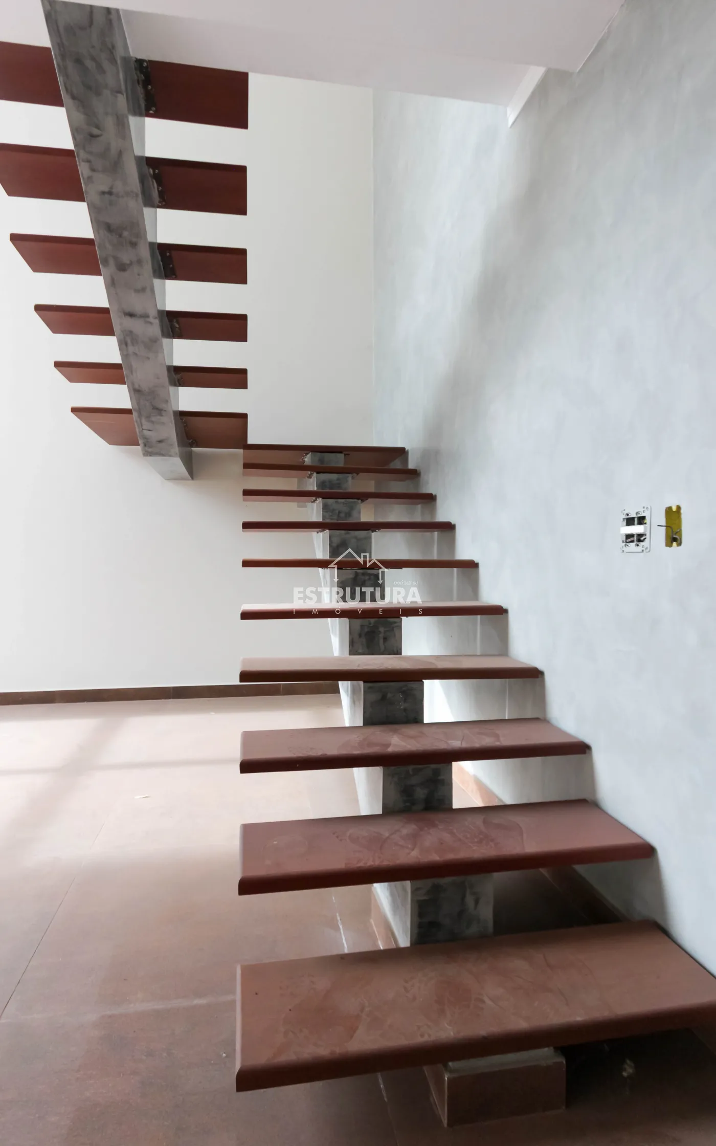A casa possui garagem para 4 carros, no piso inferior está localizada uma ampla sala com pé direito duplo integrada a cozinha estilo americana, uma sala de tv reservada, um banheiro social, área de serviço e um jardim de inverno.