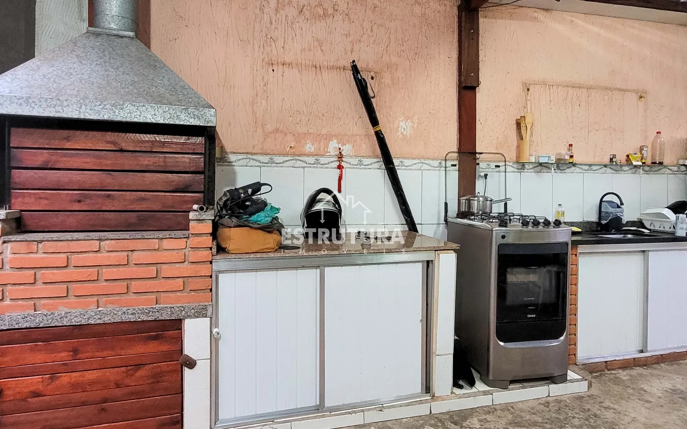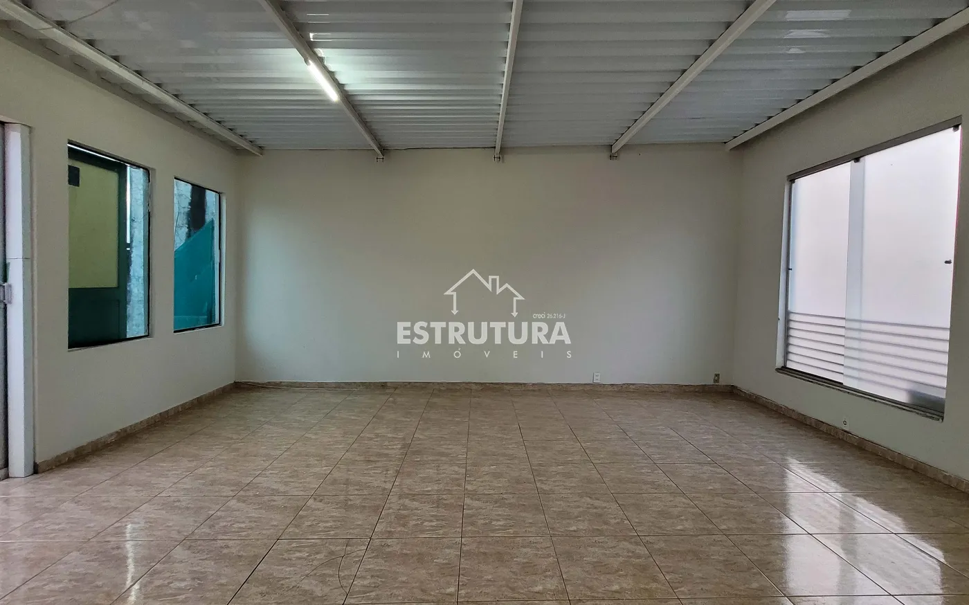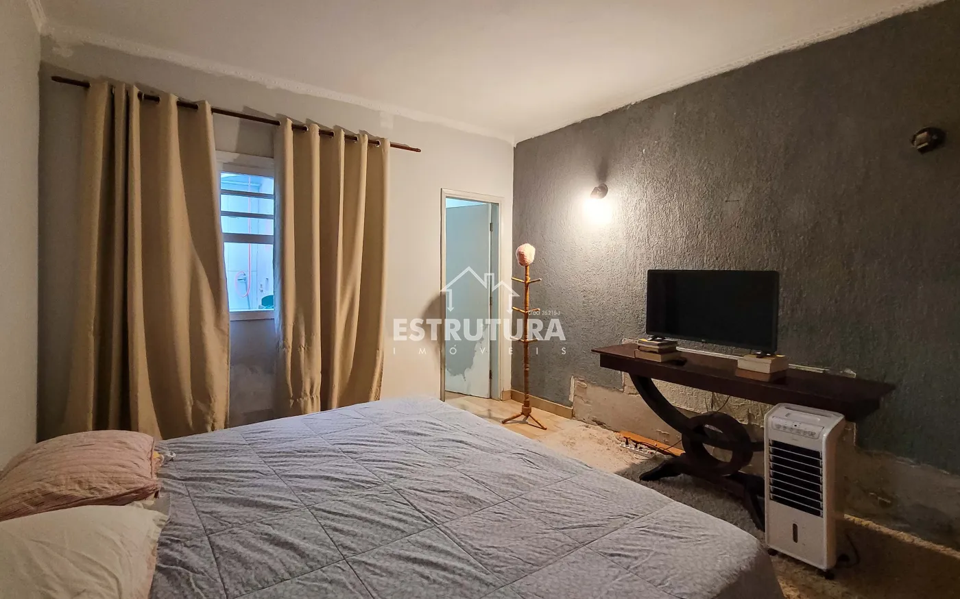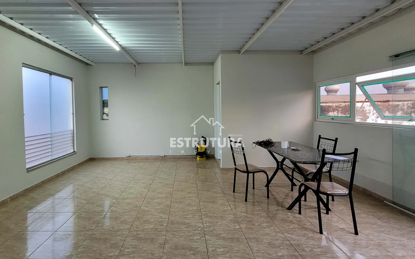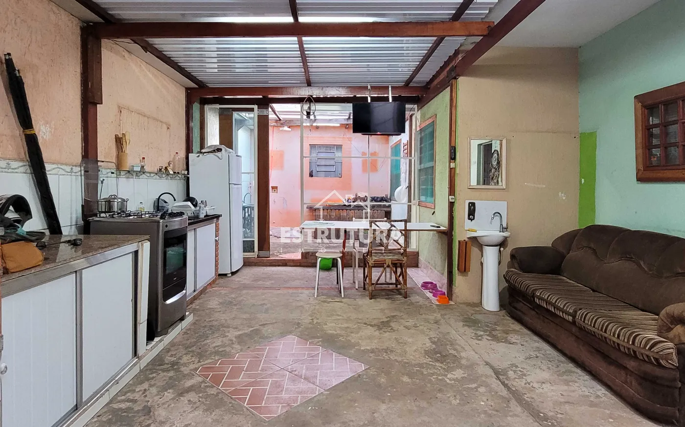 Garagem para 1 carro com P.E. 2 quartos sendo uma suíte, Sala em dois ambientes , cozinha, na parte superior temos um grande salão com banheiro.