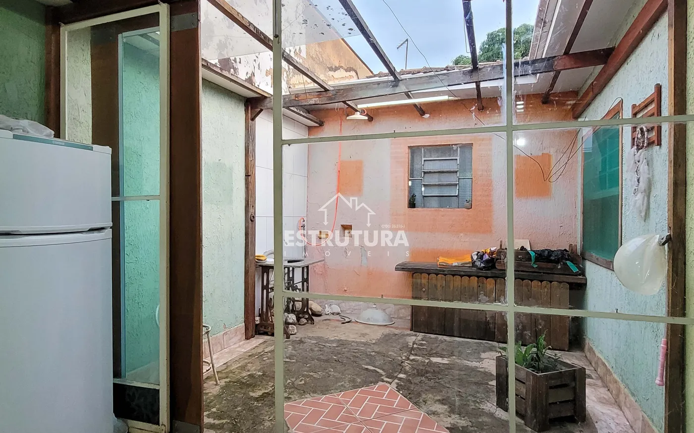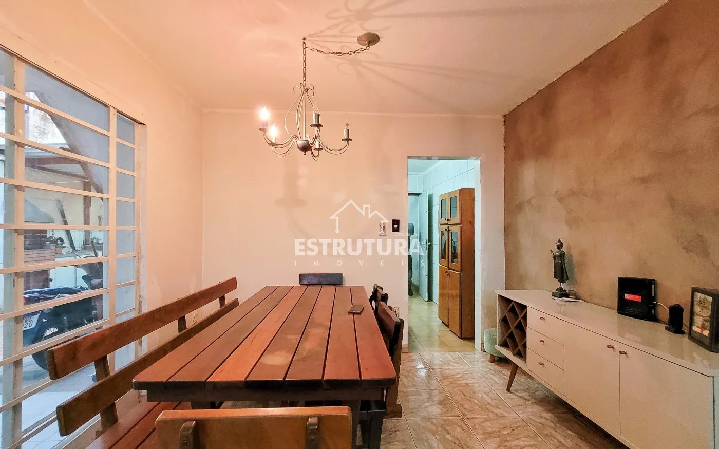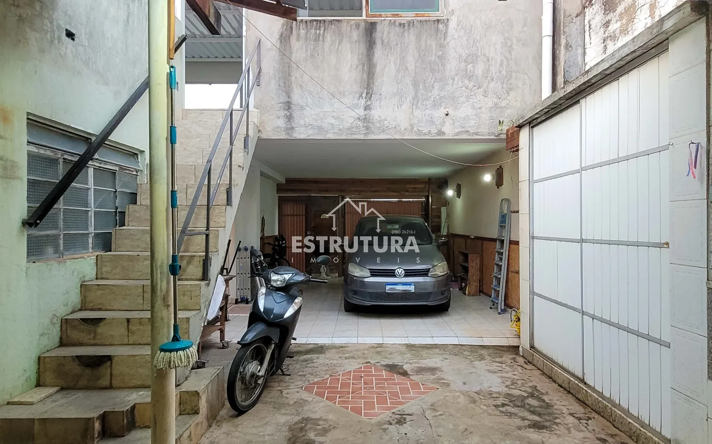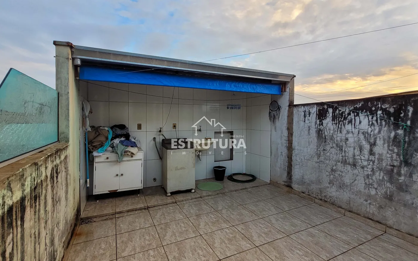 Garagem para 1 carro com P.E. 2 quartos sendo uma suíte, Sala em dois ambientes , cozinha, na parte superior temos um grande salão com banheiro.