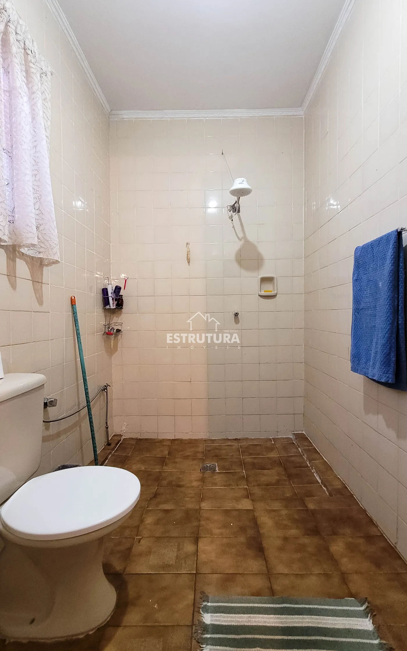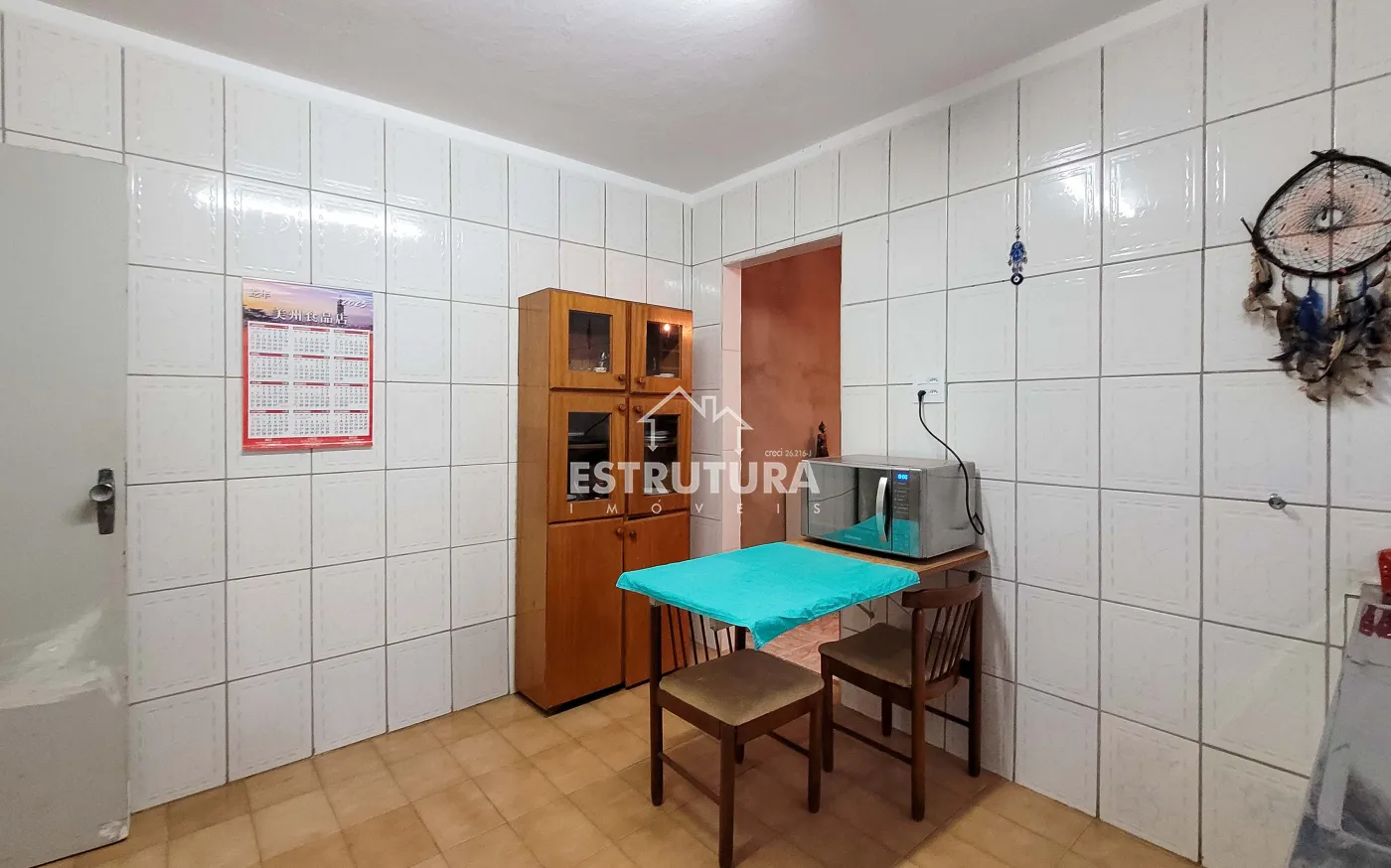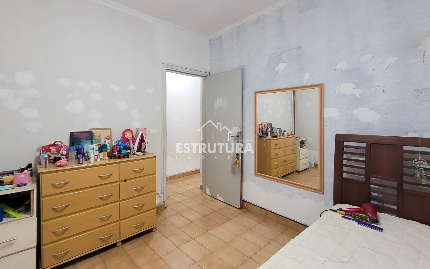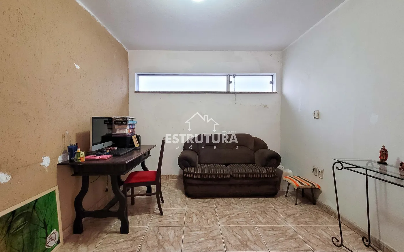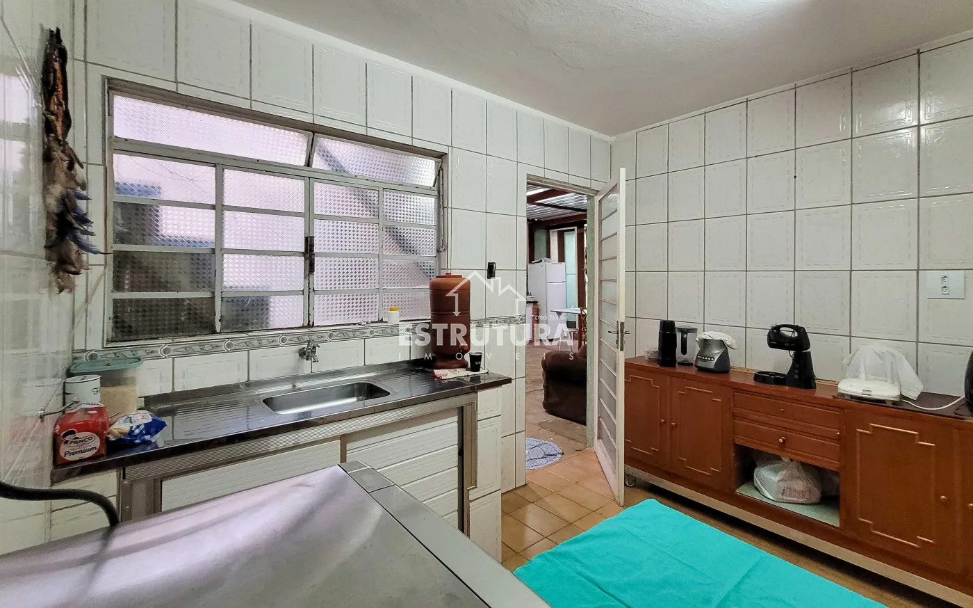 Garagem para 1 carro com P.E. 2 quartos sendo uma suíte, Sala em dois ambientes , cozinha, na parte superior temos um grande salão com banheiro.
