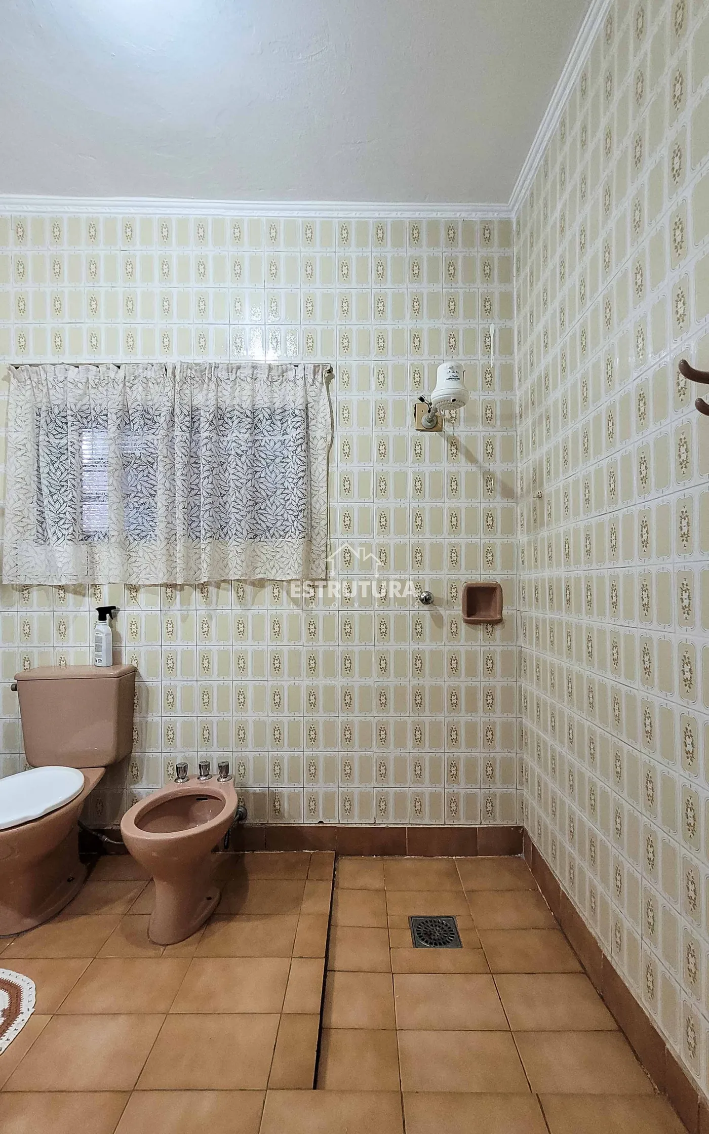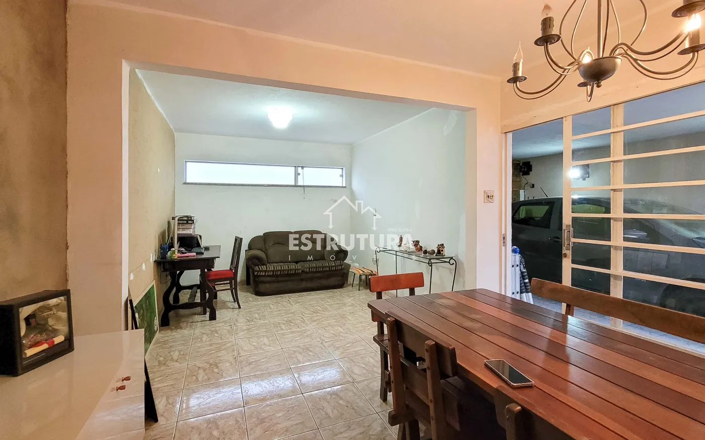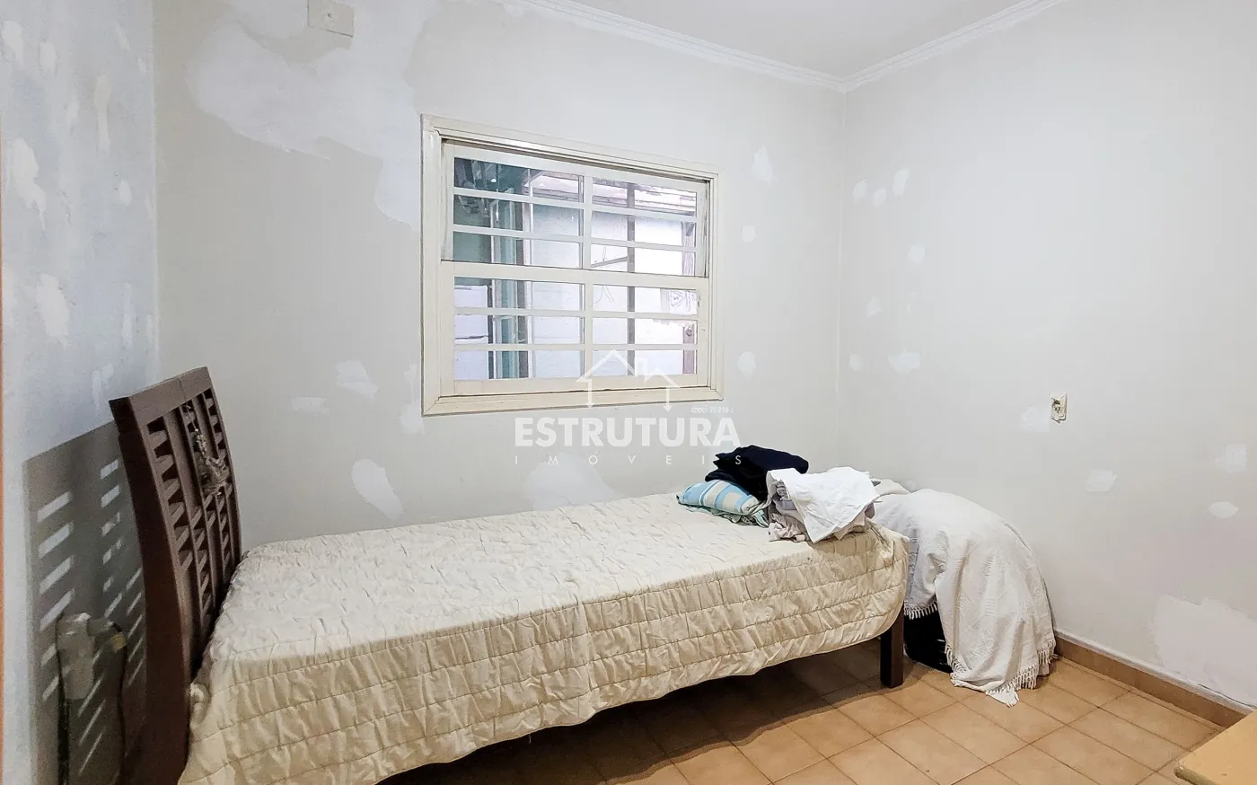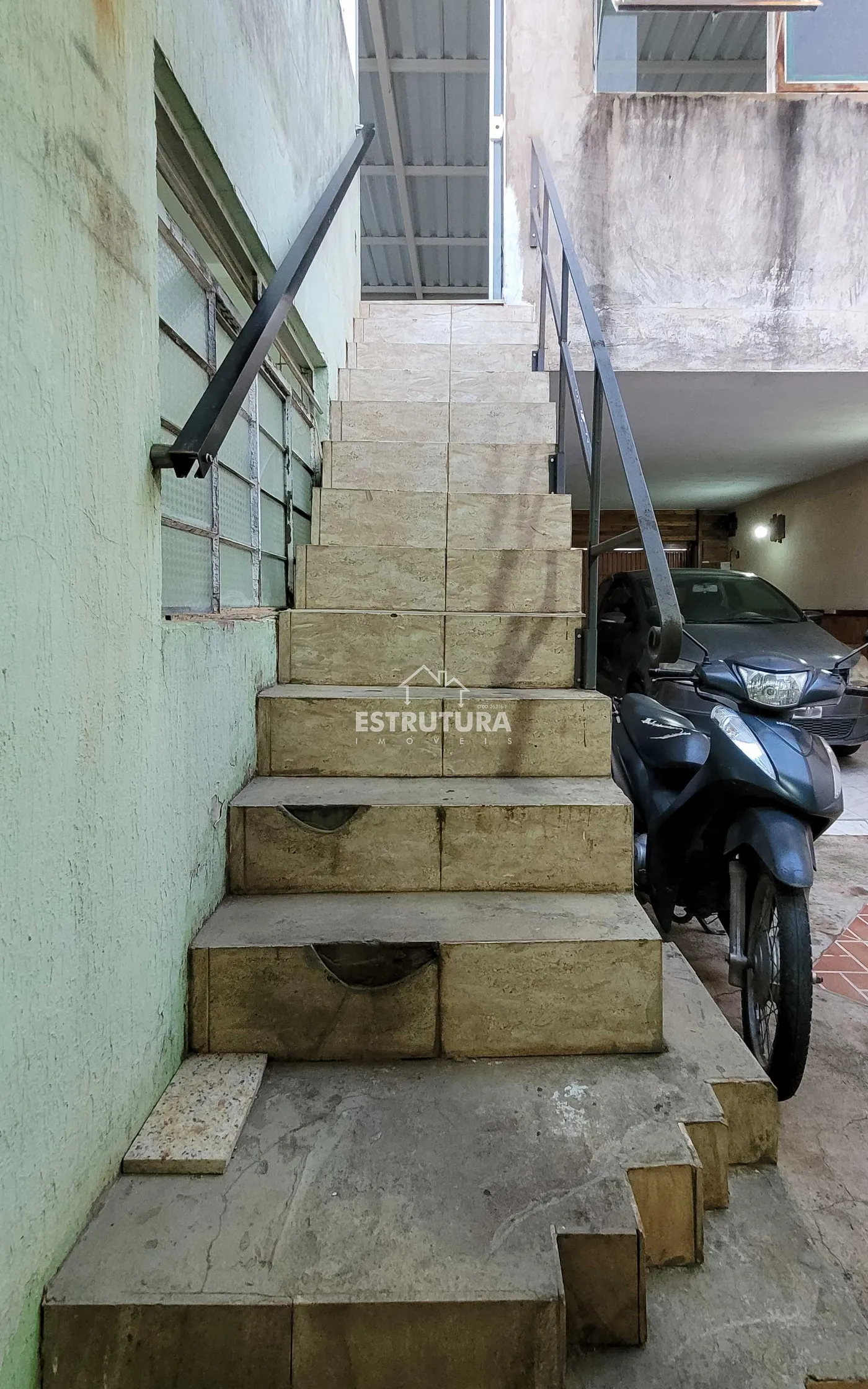 Garagem para 1 carro com P.E. 2 quartos sendo uma suíte, Sala em dois ambientes , cozinha, na parte superior temos um grande salão com banheiro.