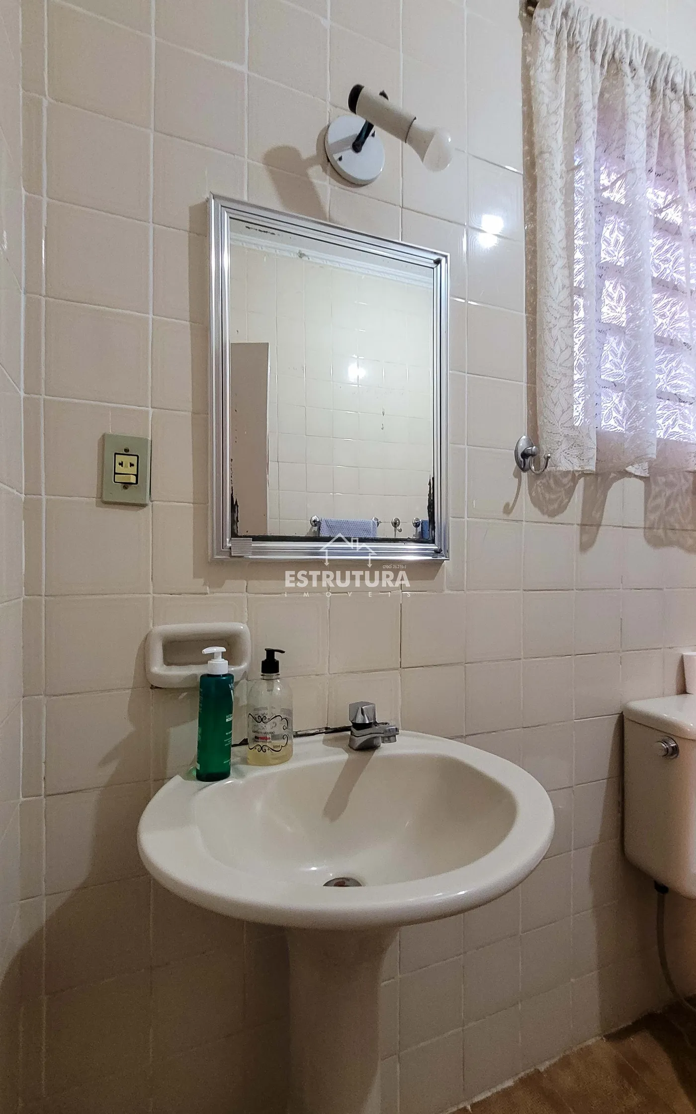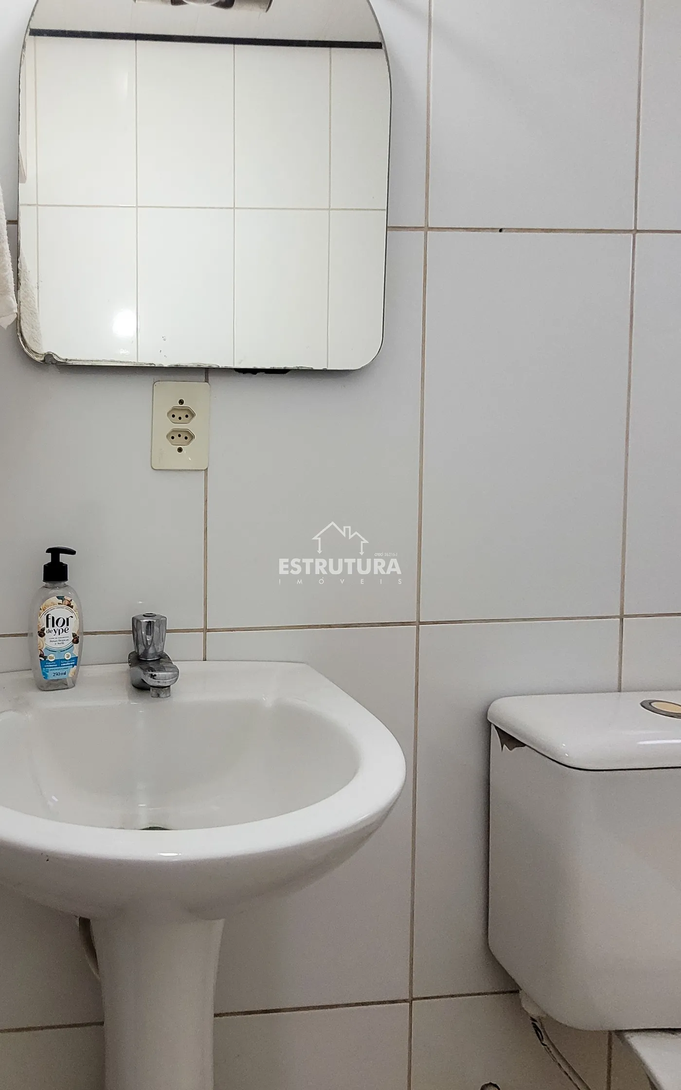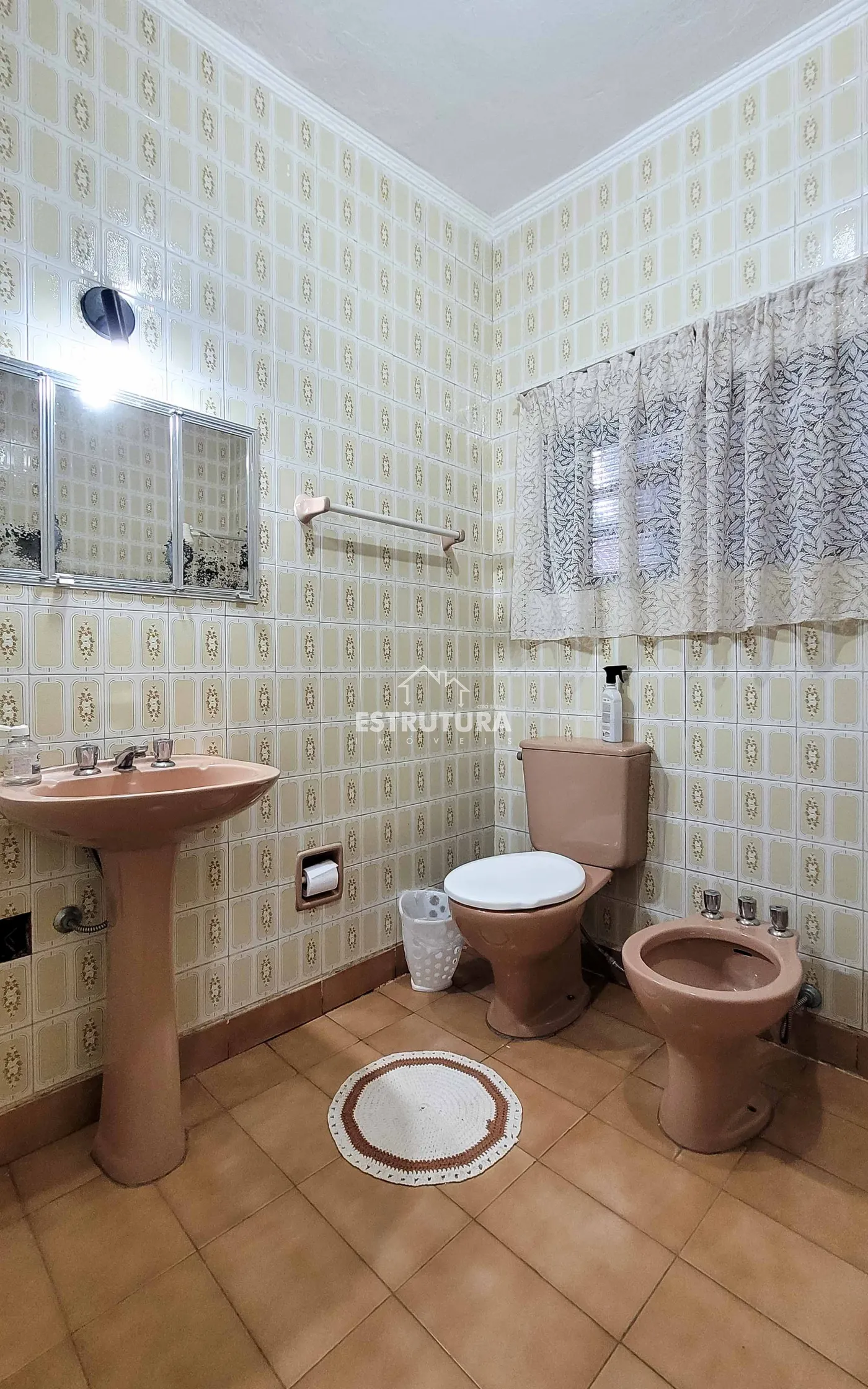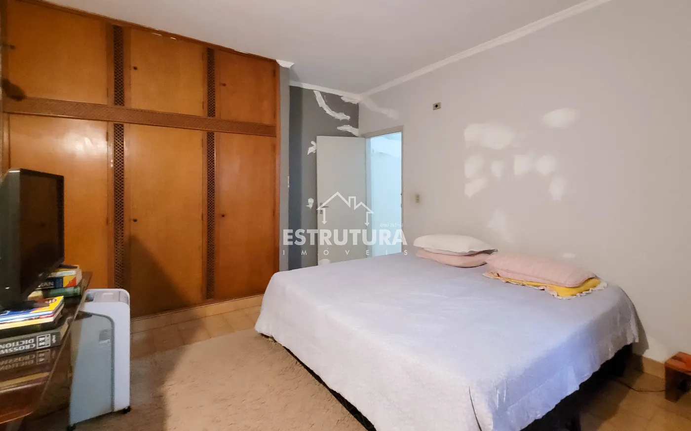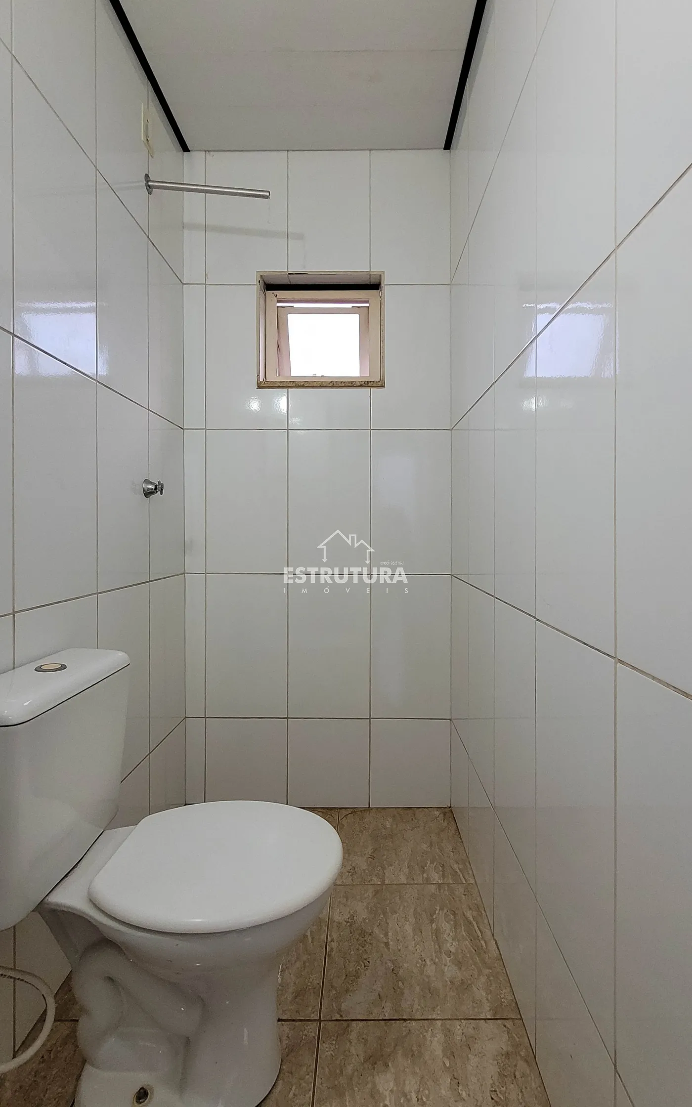 Garagem para 1 carro com P.E. 2 quartos sendo uma suíte, Sala em dois ambientes , cozinha, na parte superior temos um grande salão com banheiro.